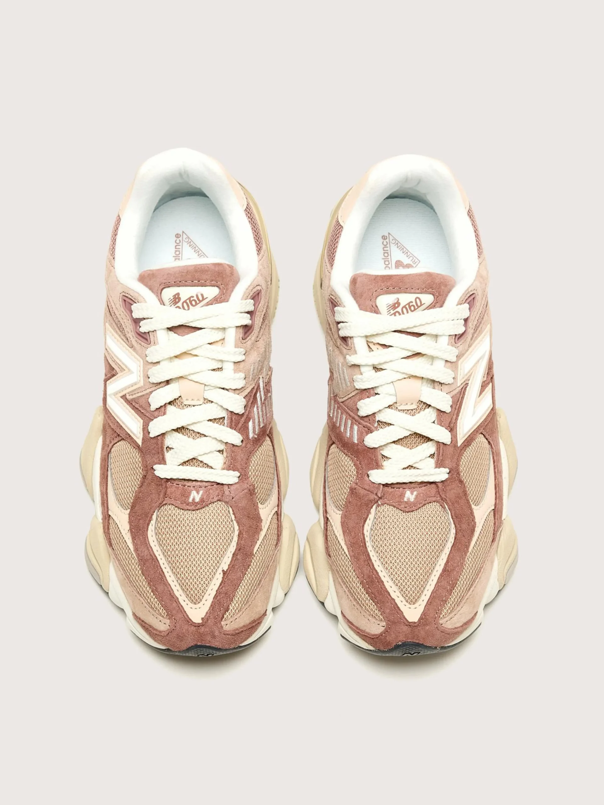 De New Balance 9060 sneakers hebben een technisch bovenwerk van leder, suède en mesh, een dempende middenzool en een buitenzool met een diamanten patroon.