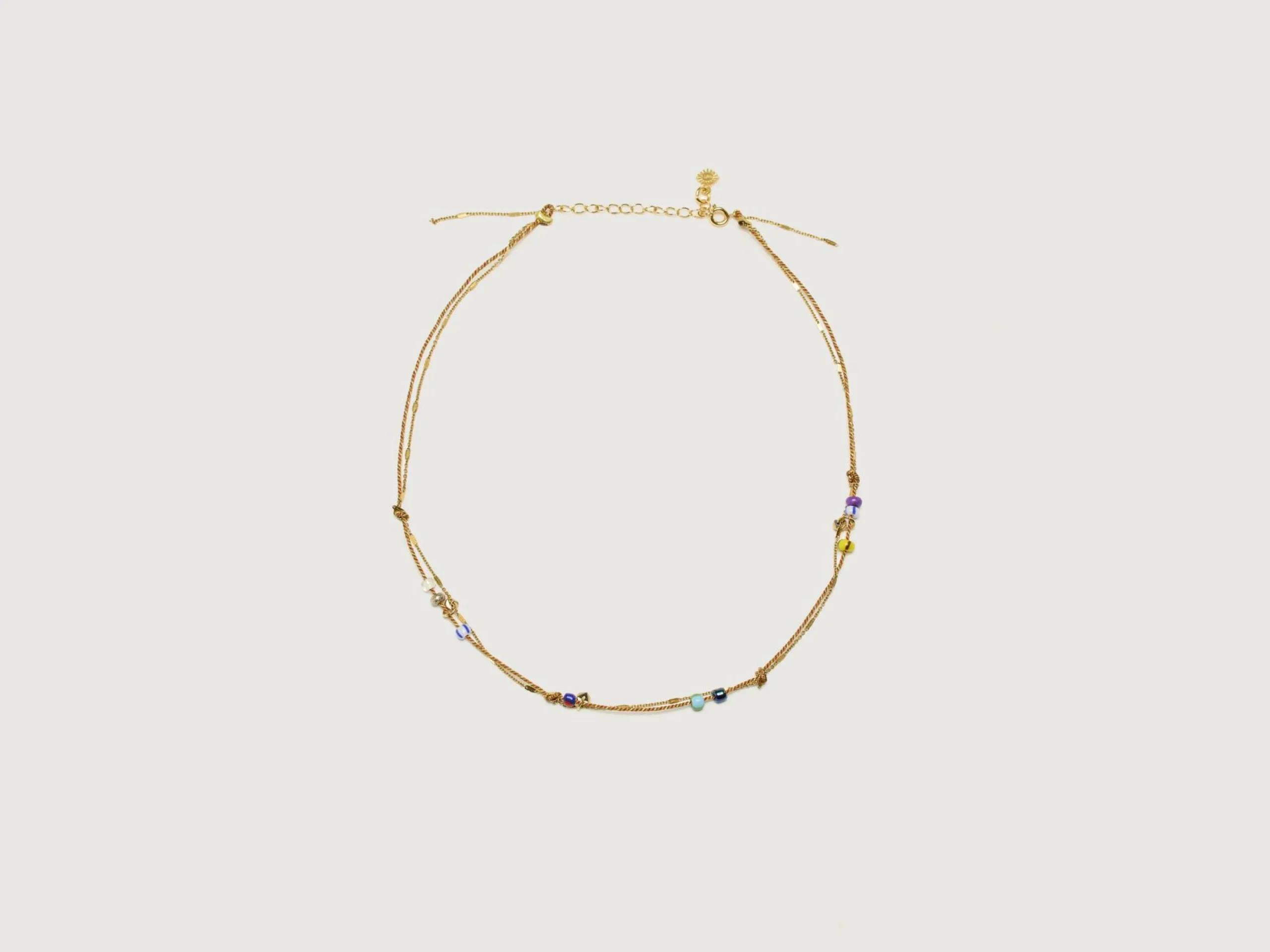 The Vadi Jewels Sugarloaf necklace is an eclectic mix of beads and African pearls on a polyester thread braided with gold string.
