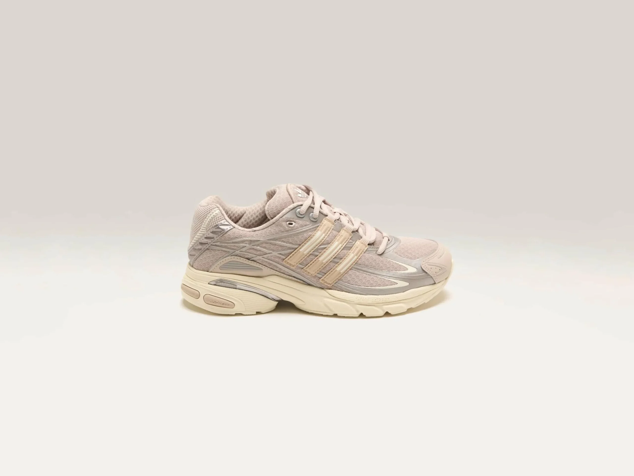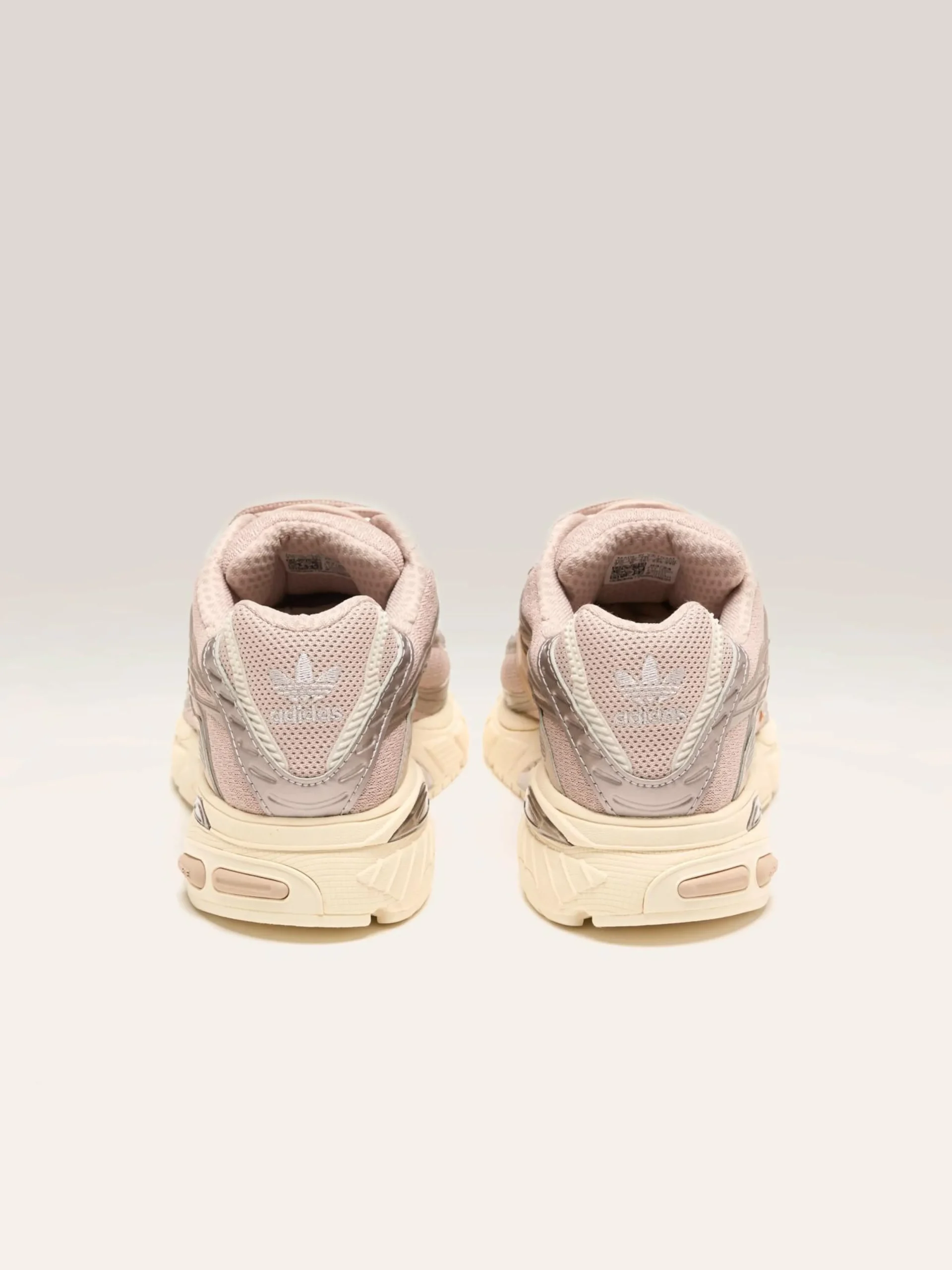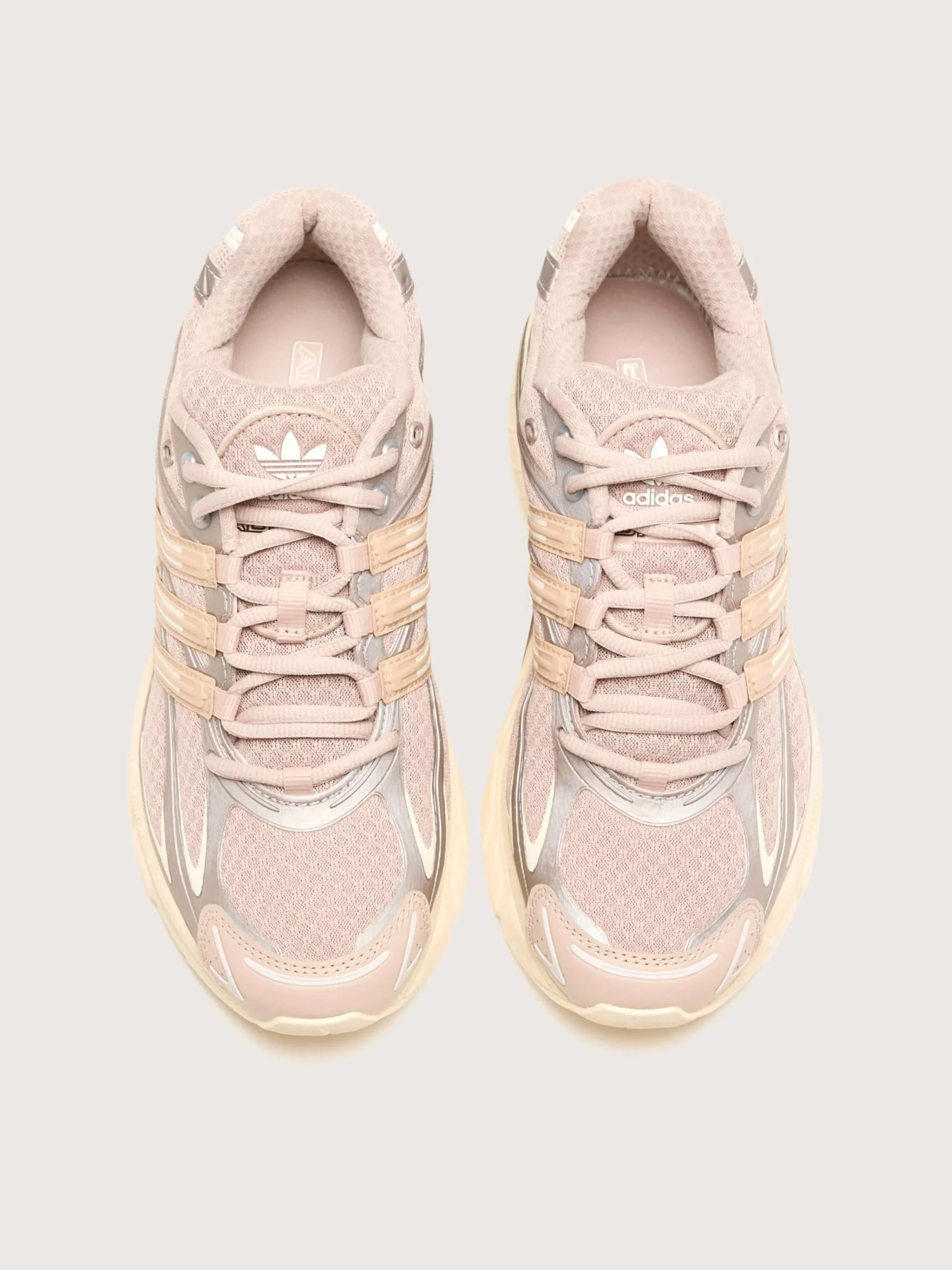 The Adidas Adistar Cushion sneakers feature a retro-futuristic design with a mesh upper and shiny overlays.