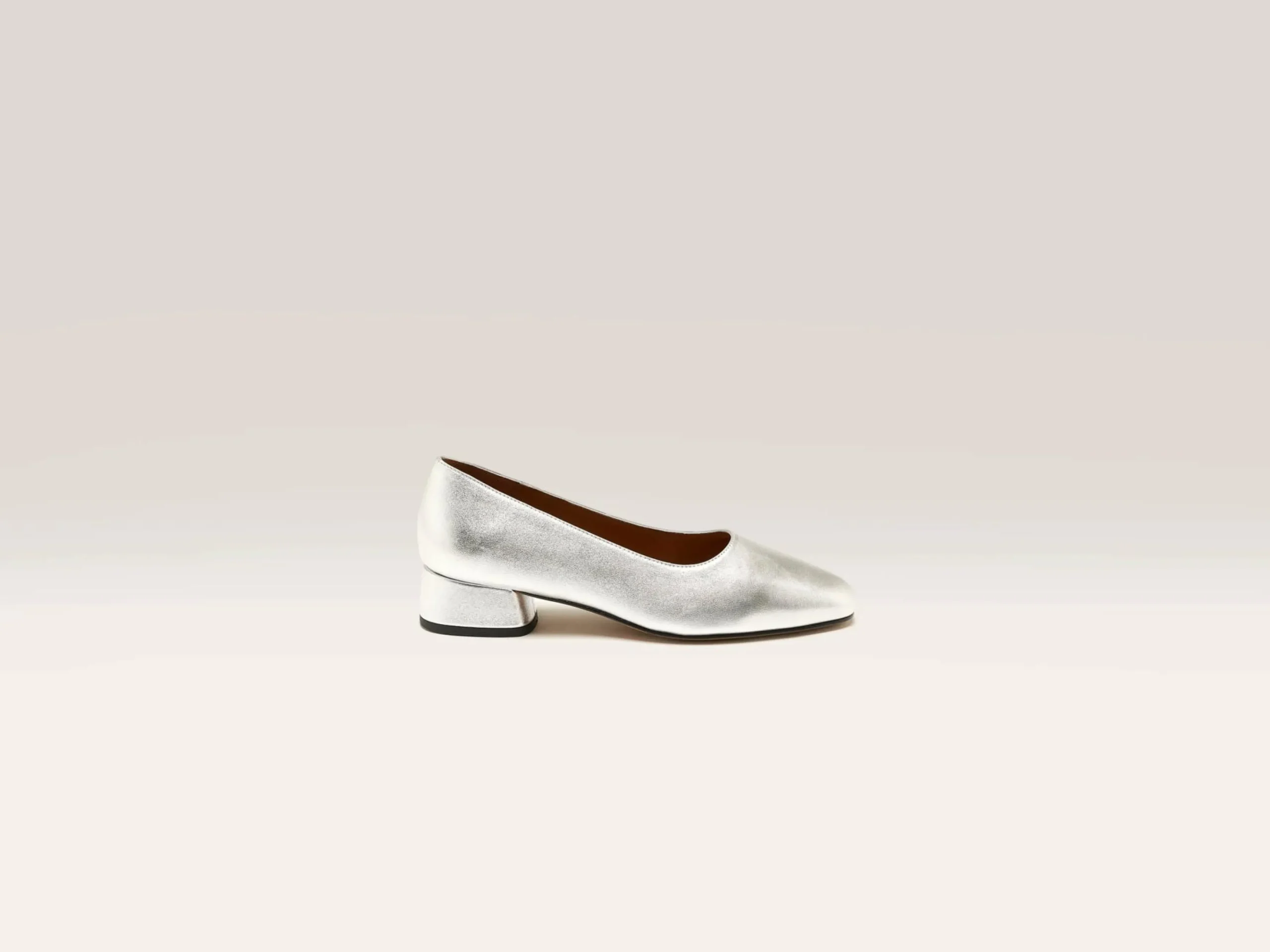 The Anthology Paris Alina Ballerine in silver lamé leather features a rounded, mid-rise heel with leather outsoles.