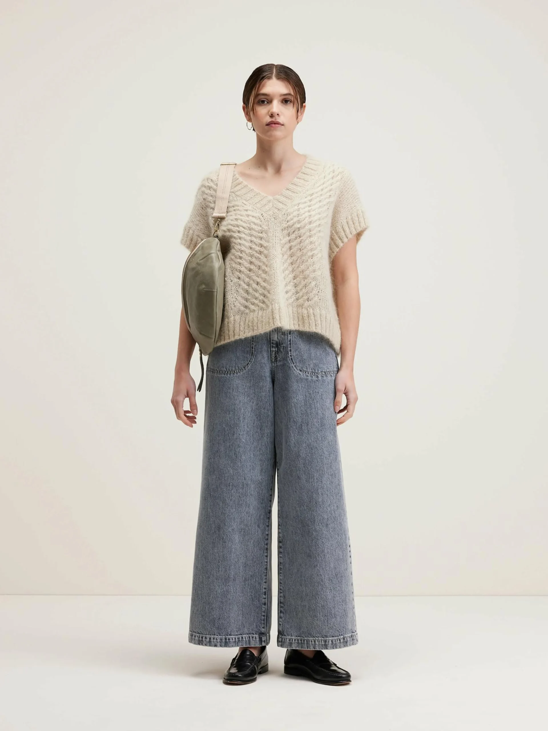 Lichte, oversizede, zandkleurige jumper zonder mouwen, met kabeldetails.