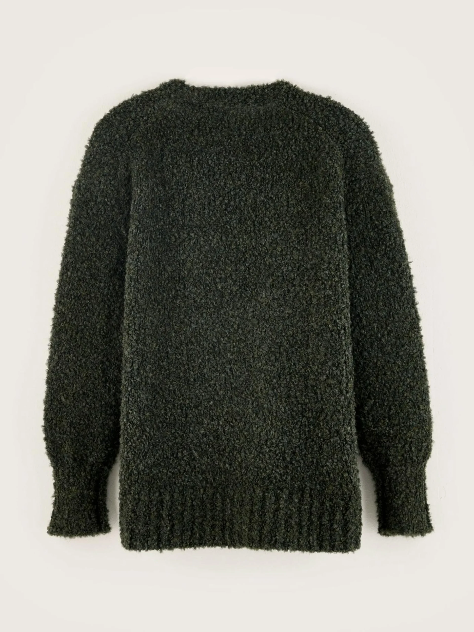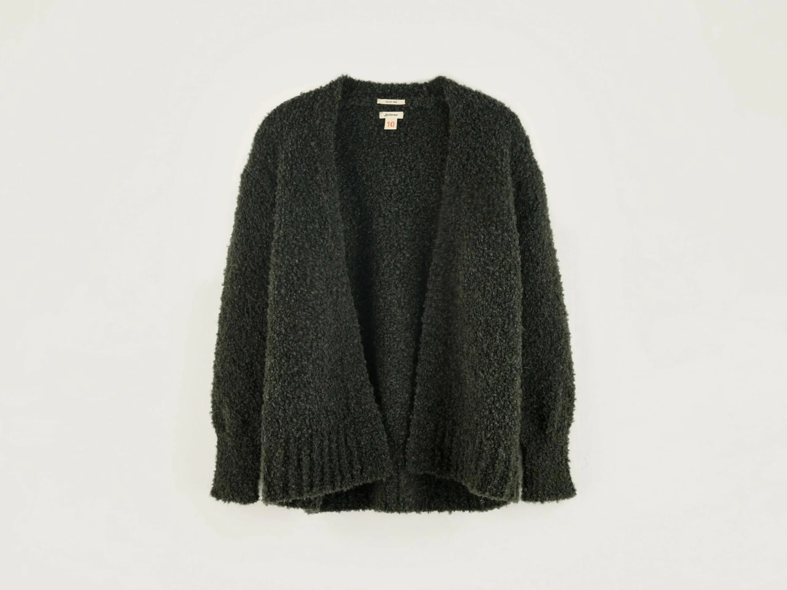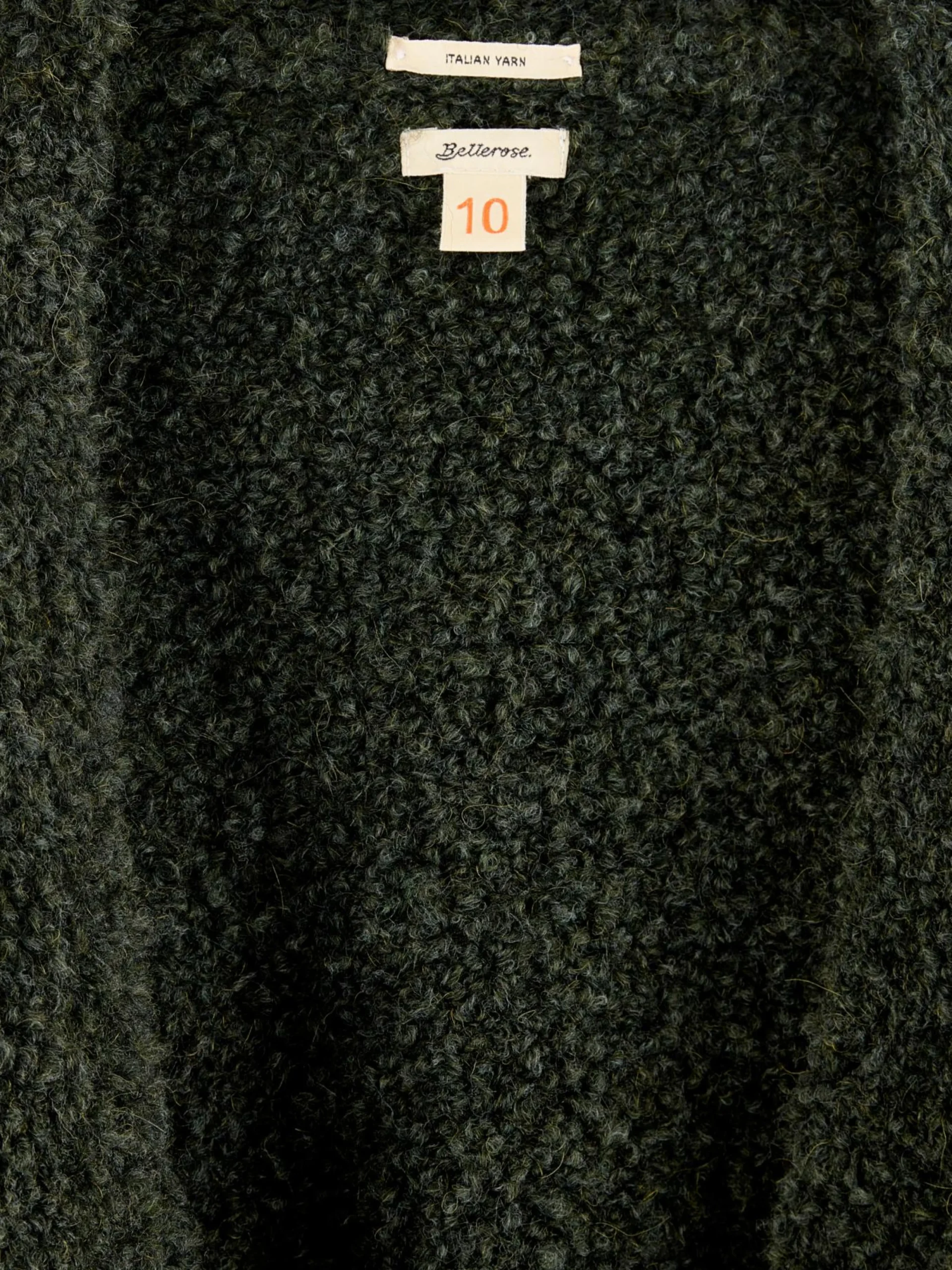 Mosgroene rechte, lange cardigan van bouclé garen.