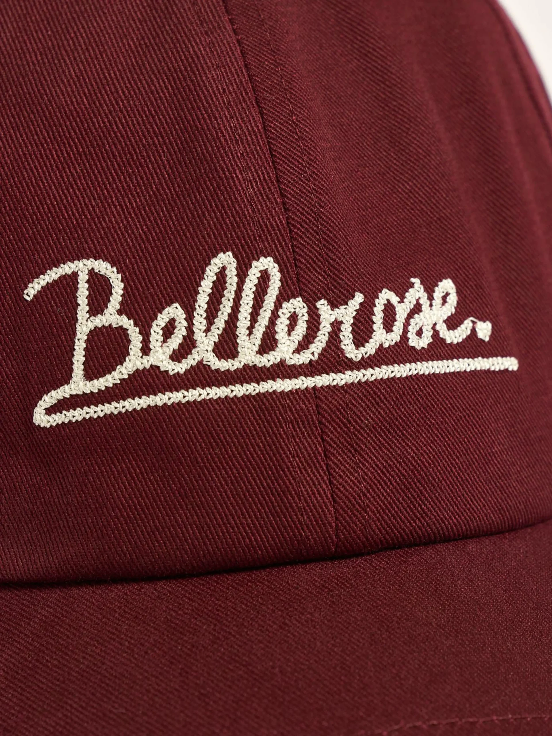 Klassieke 6-panel pet van bordeauxrood katoen met ecru Bellerose borduursel op de voorkant.