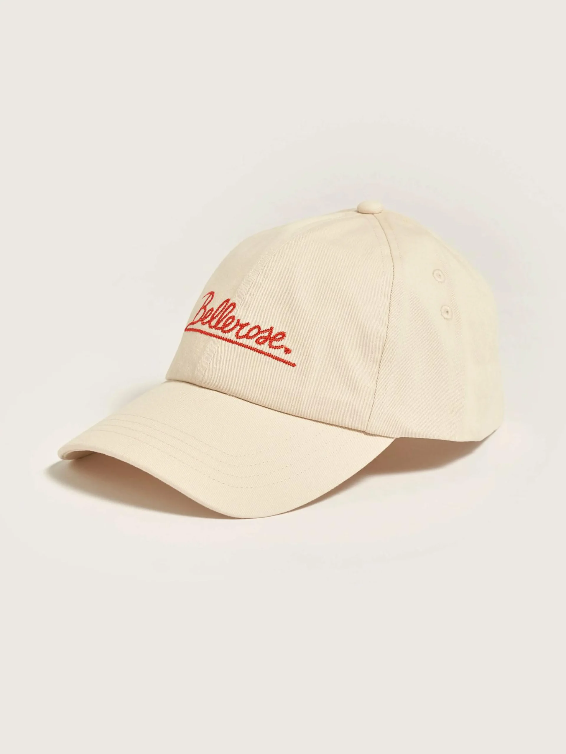 Klassieke 6-panel pet van ecru katoen met rood Bellerose borduursel op de voorkant.
