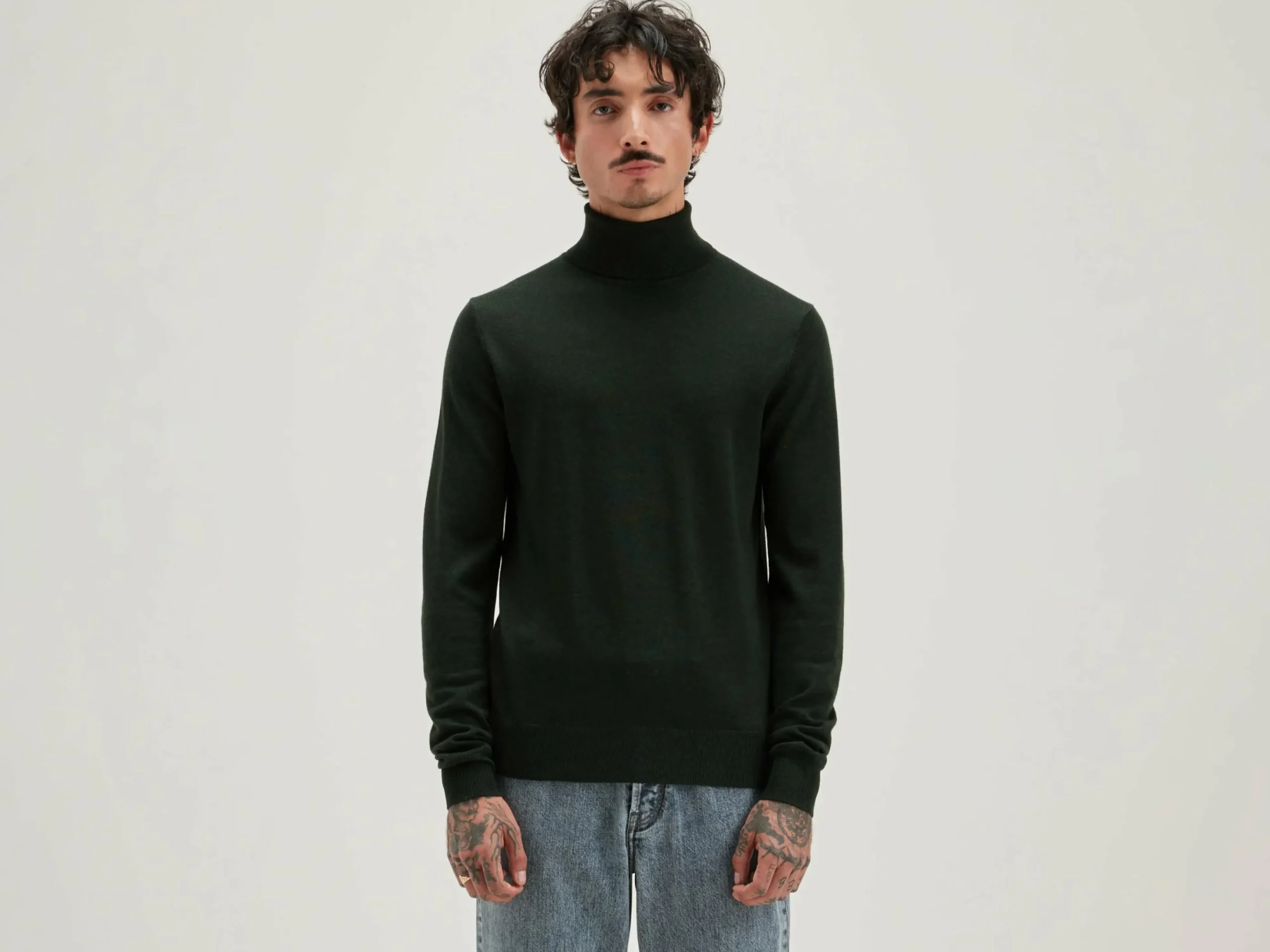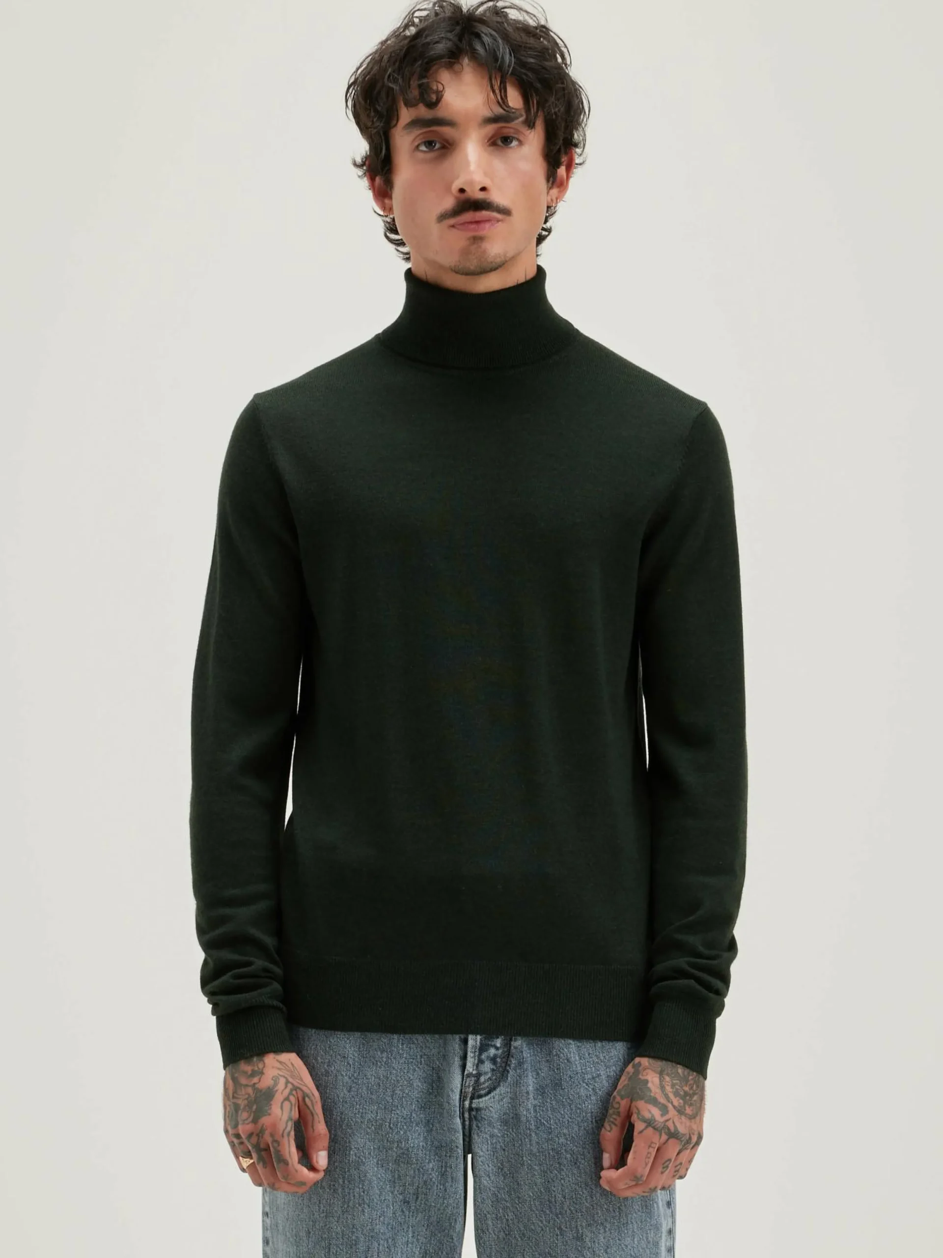 Klassieke, bosgroene sweater met rolkraag, van superfijne merinowol.