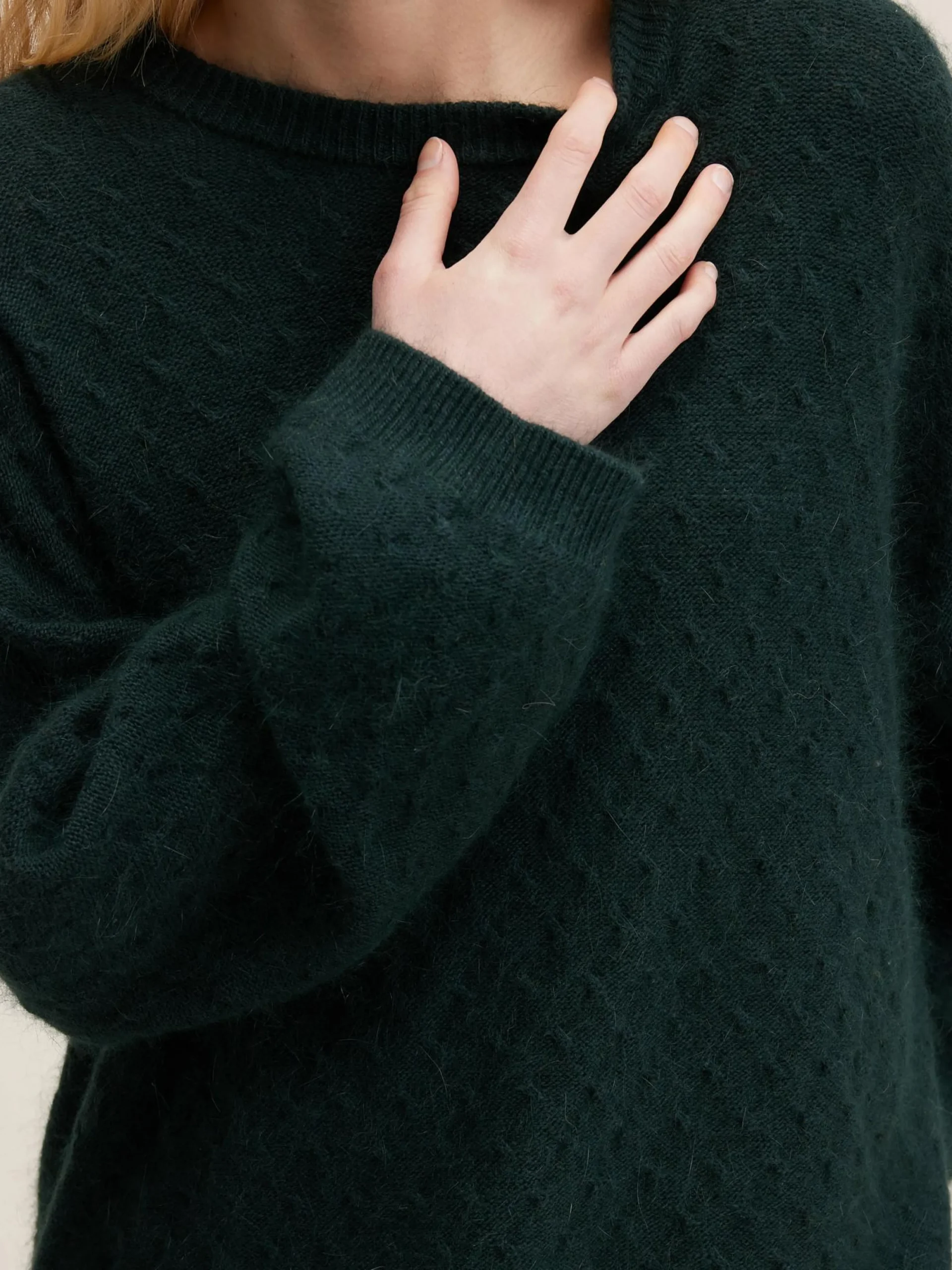 Flesgroene, relaxede trui met ronde hals, van angoramix.