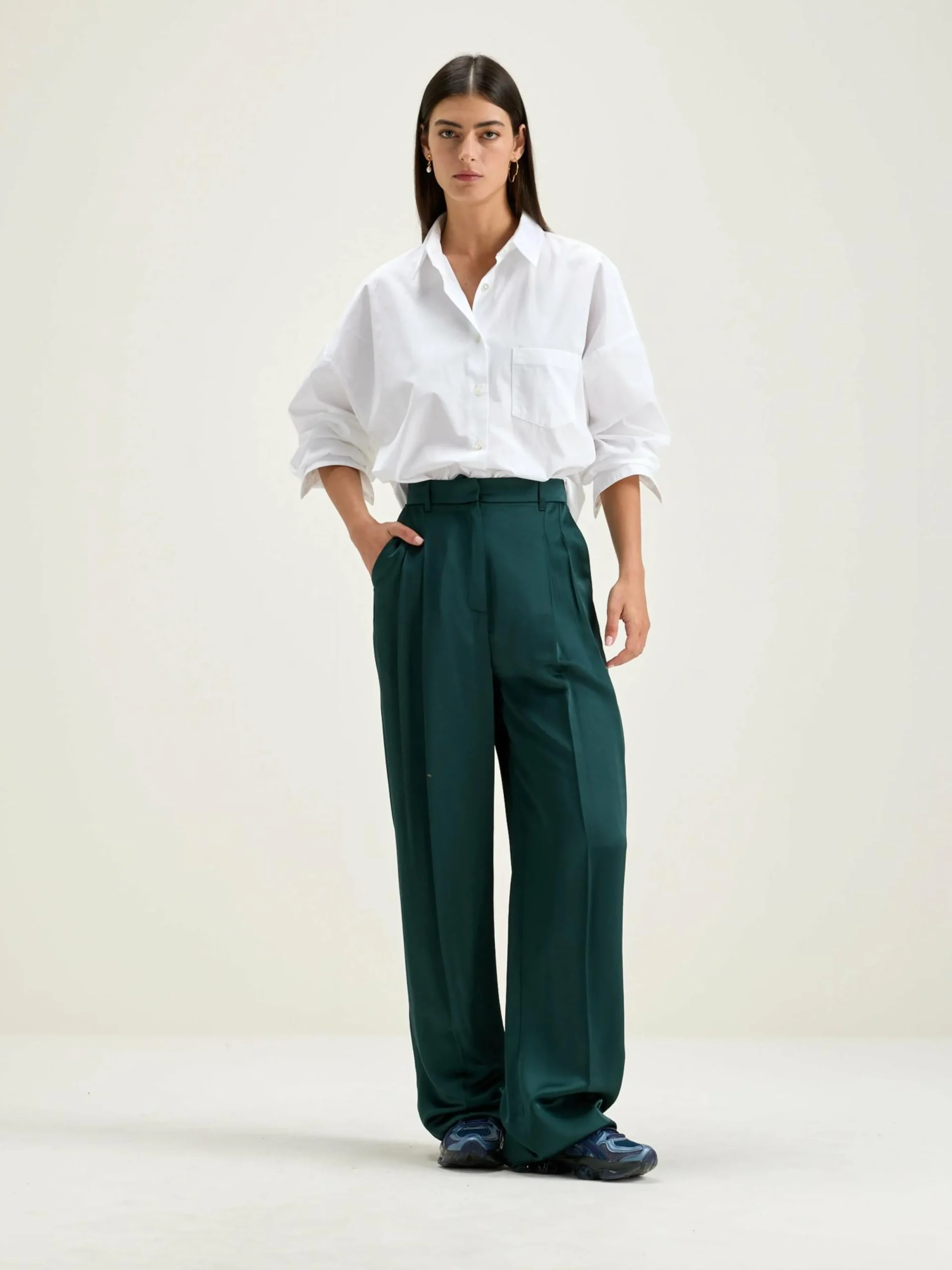 Elegante, donkergroene high-waist broek met brede pijpen en plooien aan de voorkant.