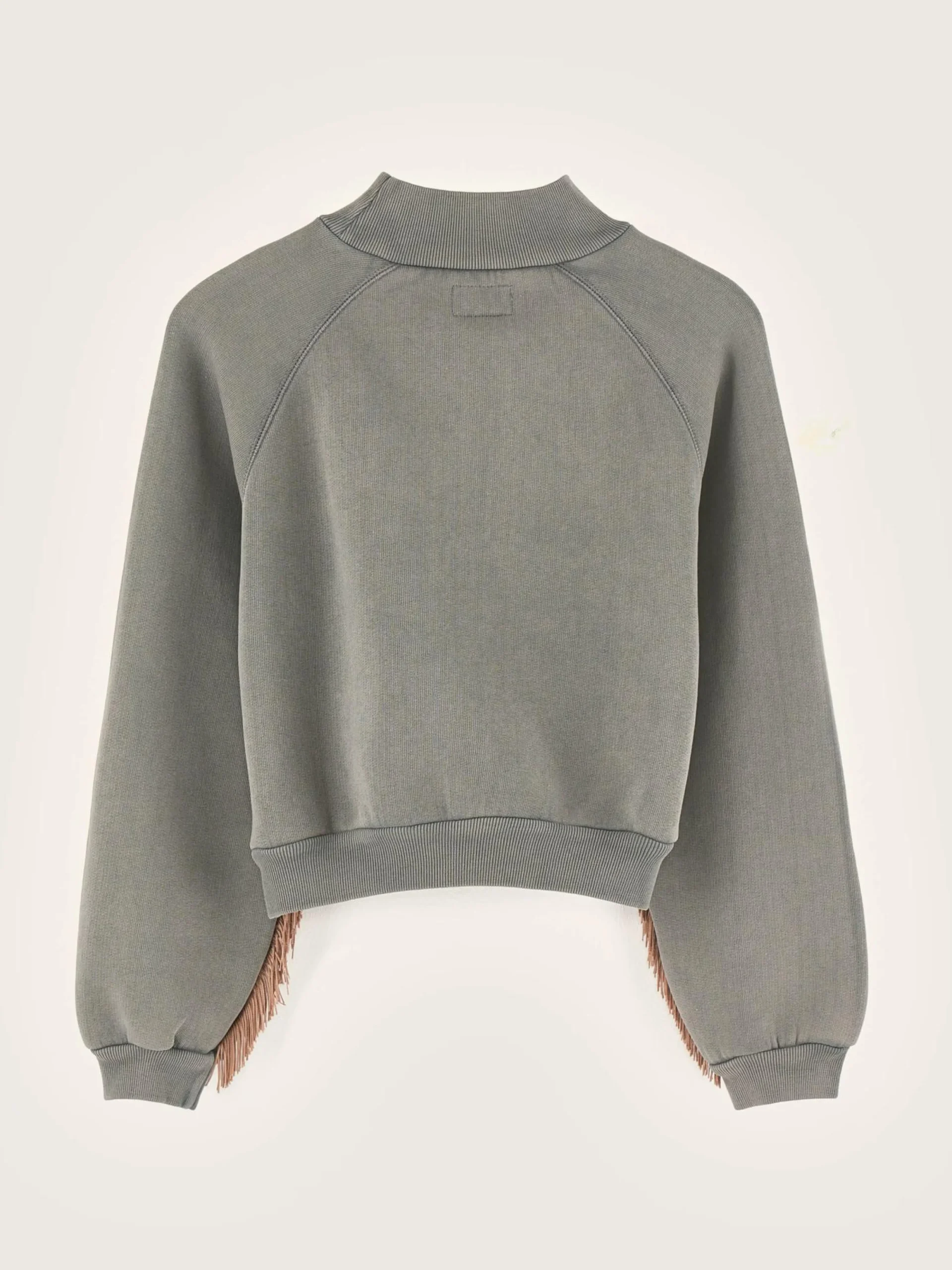 Donkergrijs, comfortabel sweatshirt met franjes en een opstaande kraag.