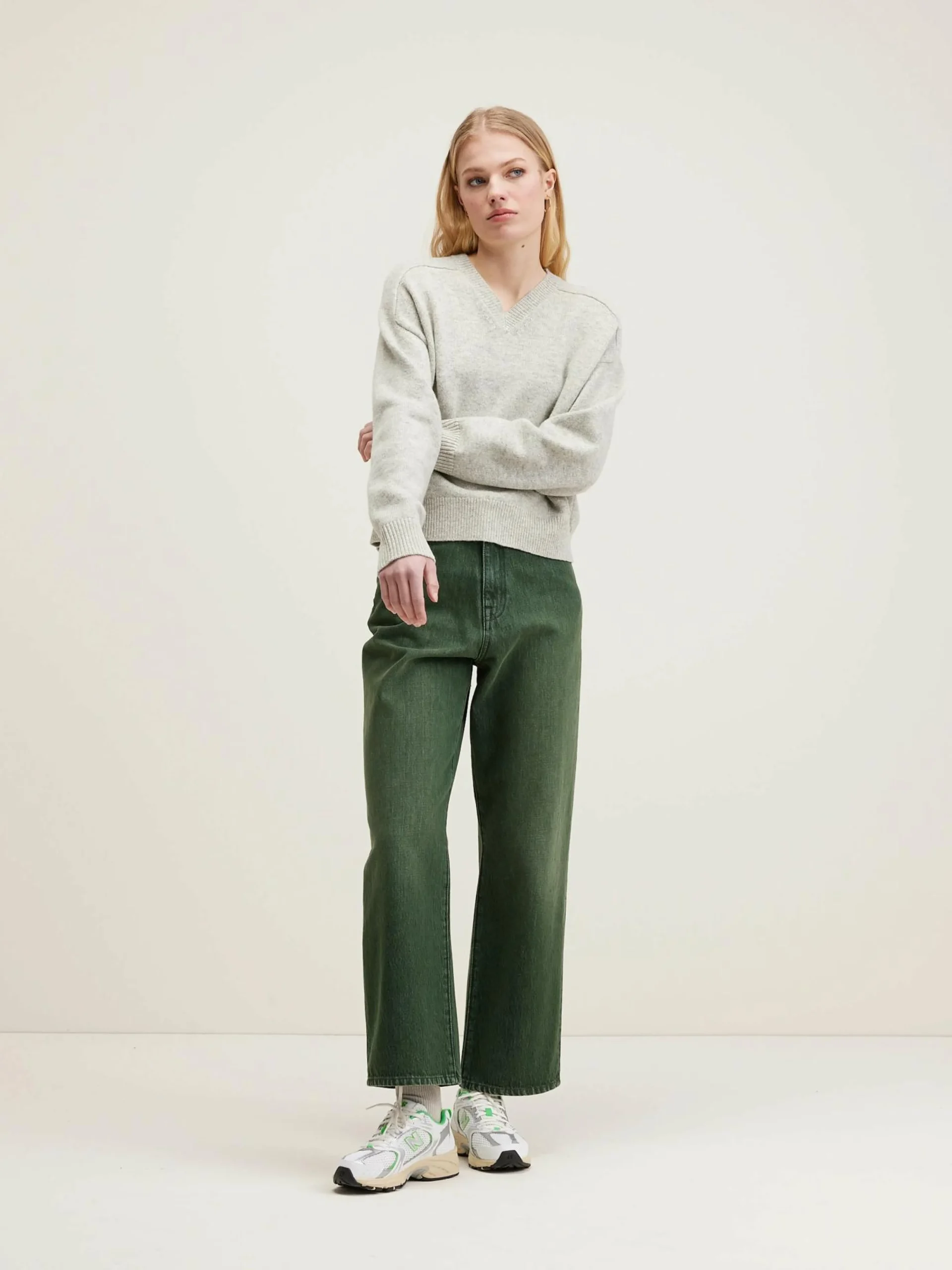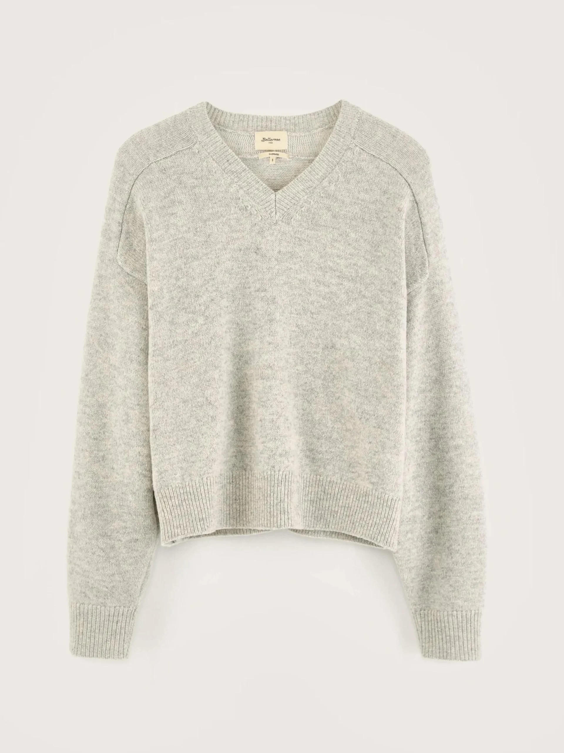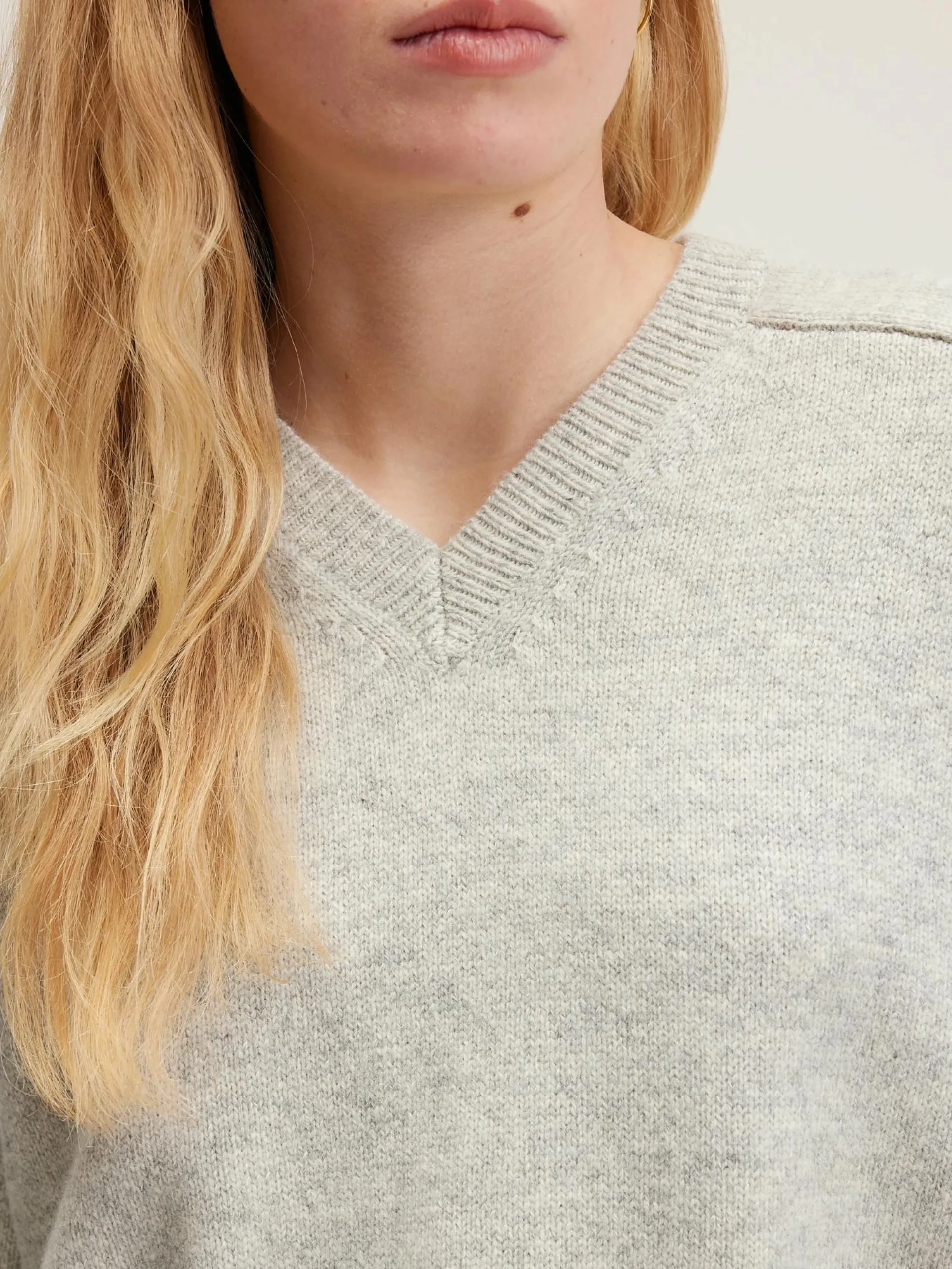 Oversizede, grijze sweater met V-hals, van wol en katoen.