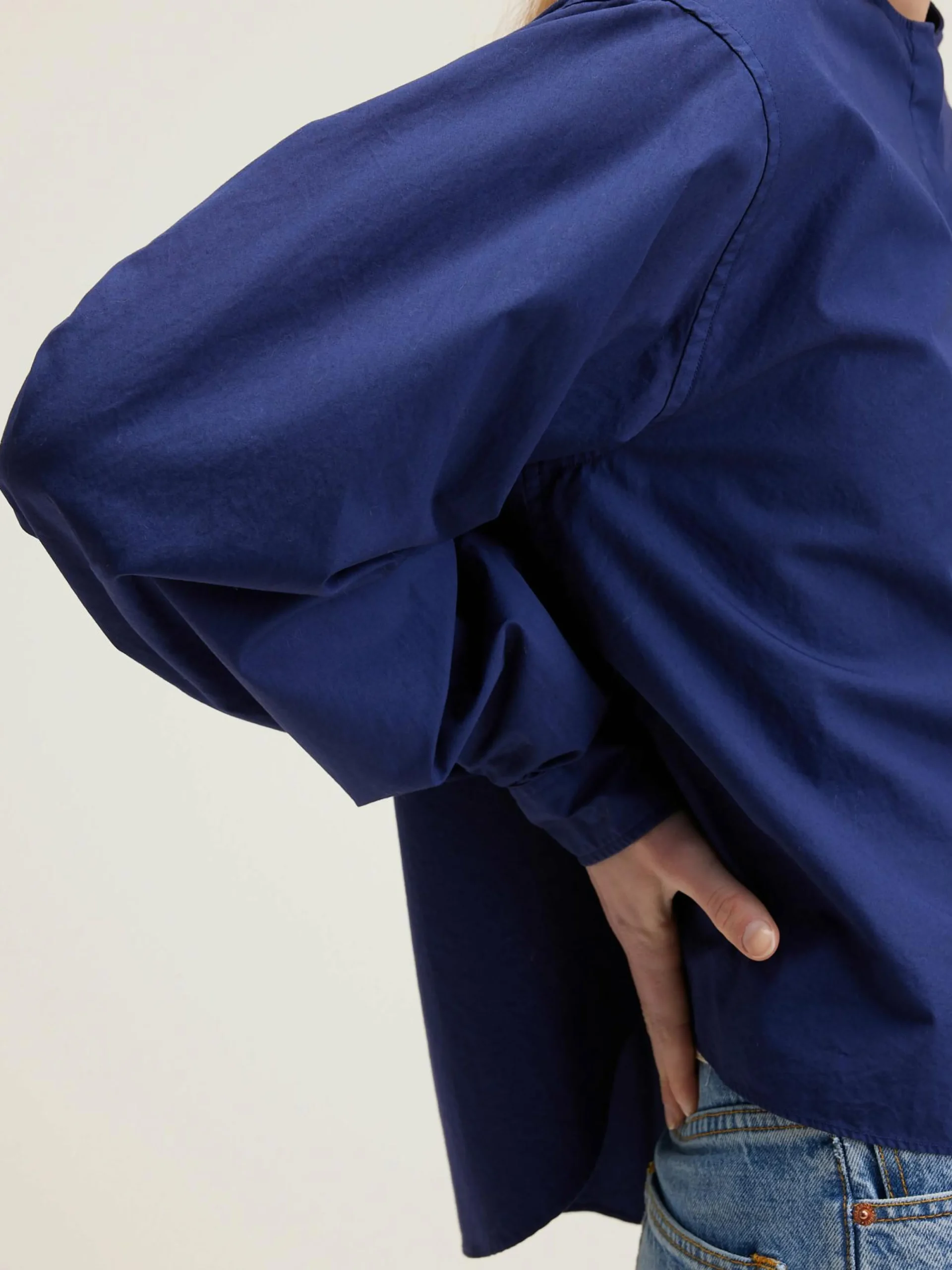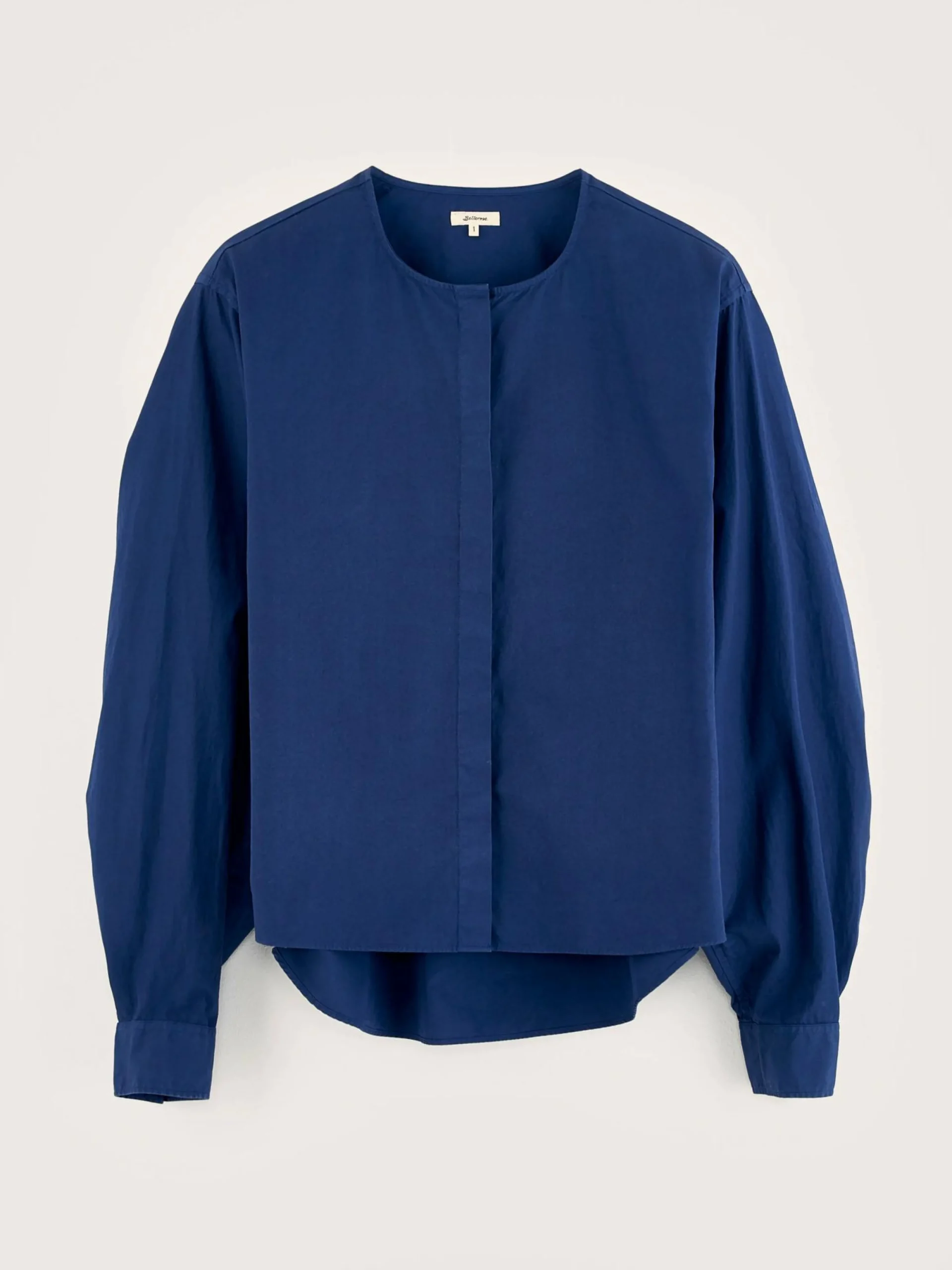Overhemd met ronde hals en lange mouwen met ruches, van marineblauwe katoenpopeline.