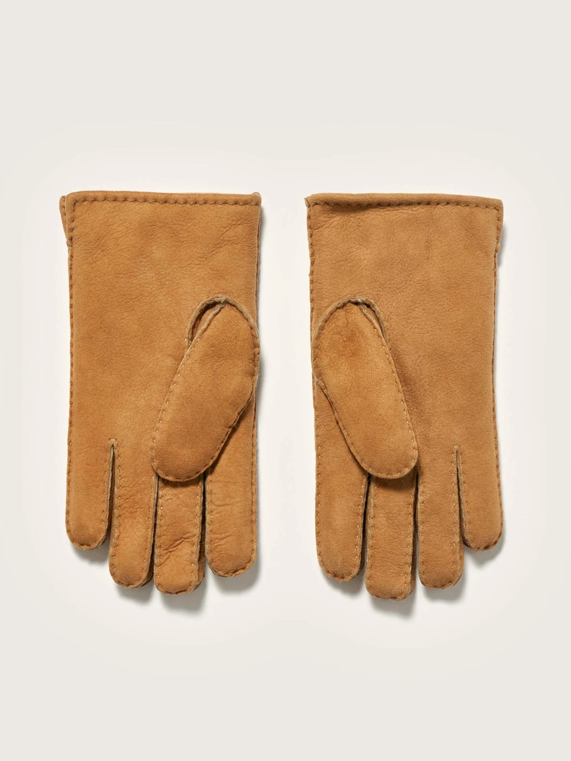 Cognac-kleurige leren wanten van omgekeerde shearling wol.