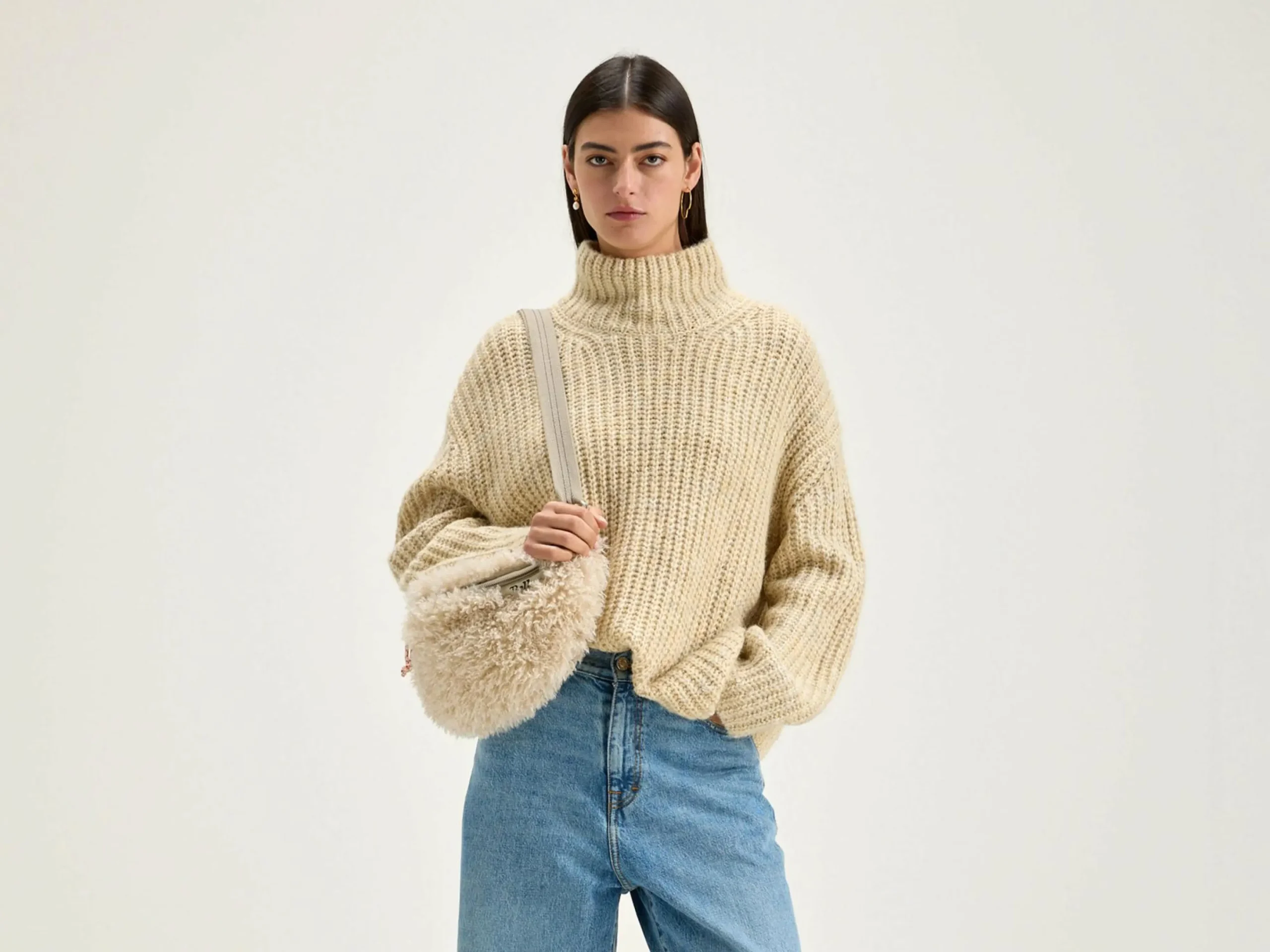 Beige gemêleerde, oversizede trui, recht model met trechterhals.