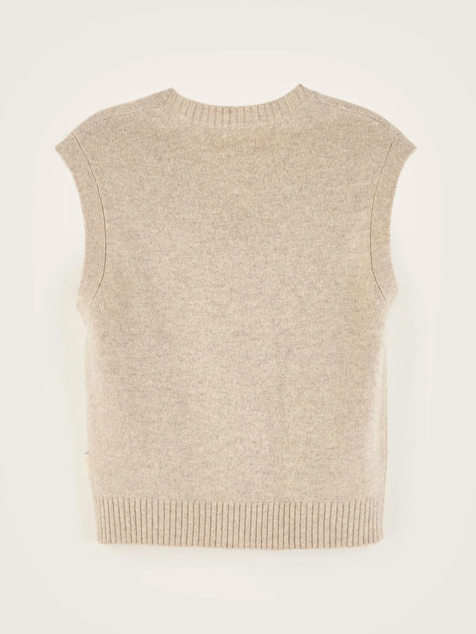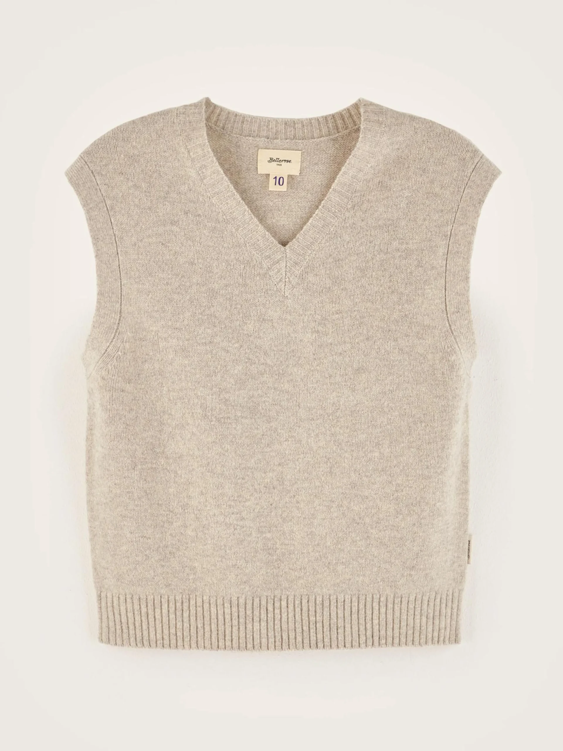 Comfortabele, mouwloze debardeur met V-hals, van lichtgrijze merinowol.