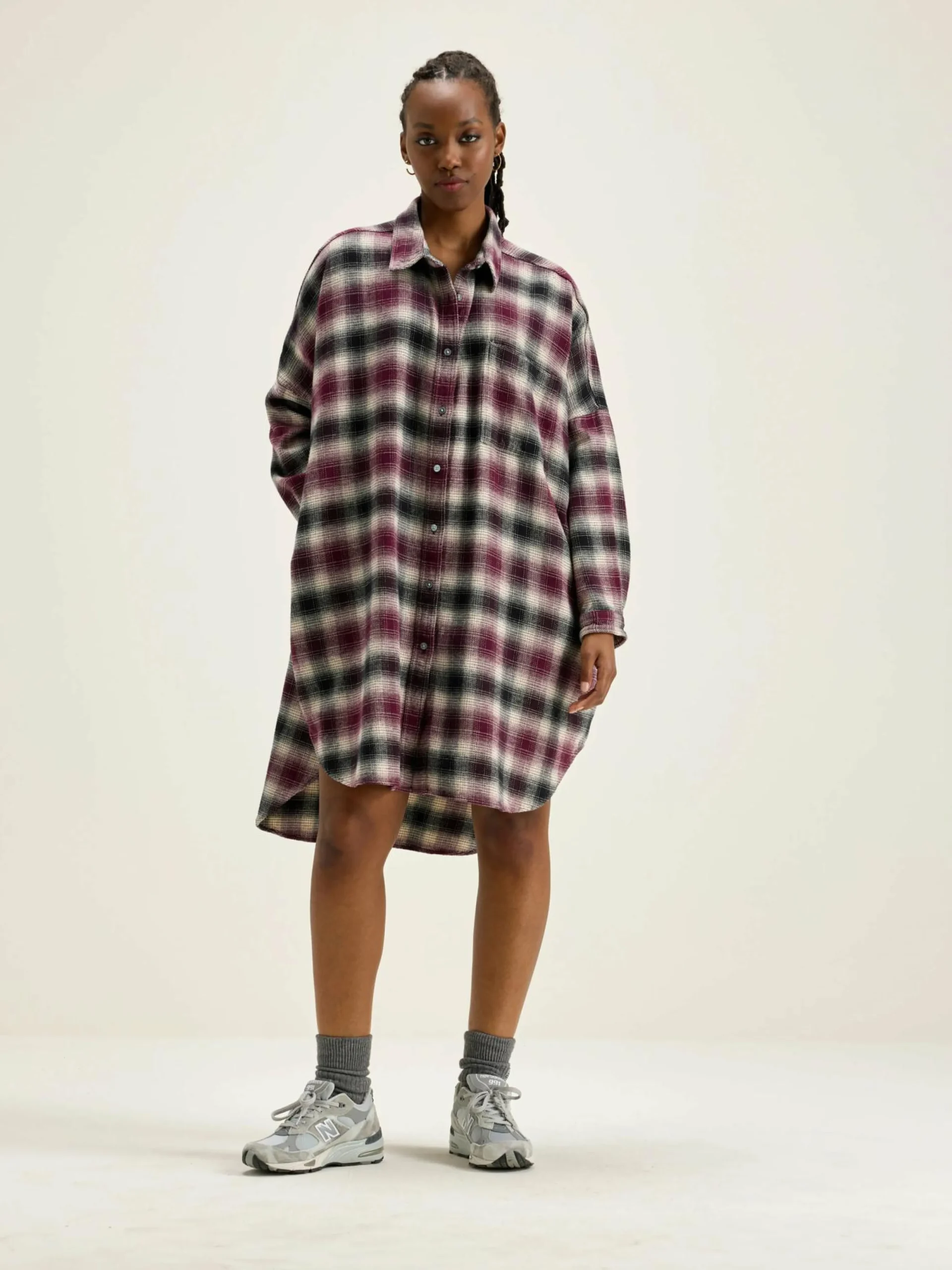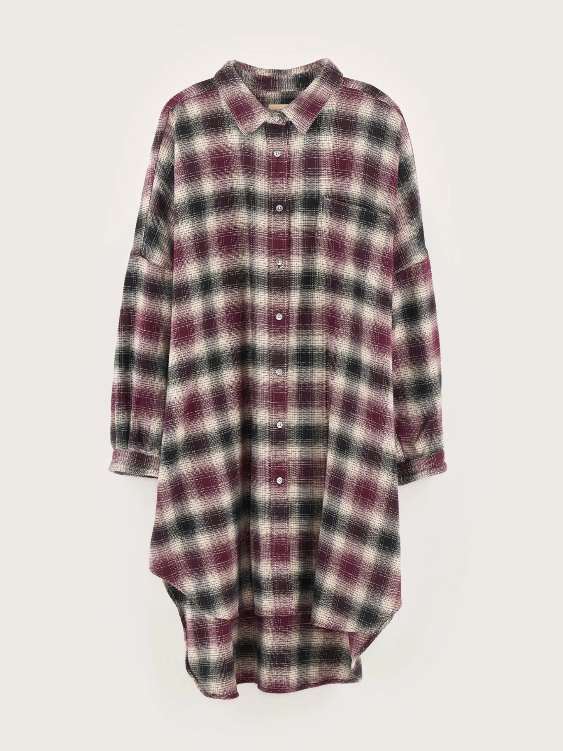 Oversizede hemdjurk van geborsteld katoen, met wijnrood, zwart en lichtbeige ruitpatroon met schaduw.