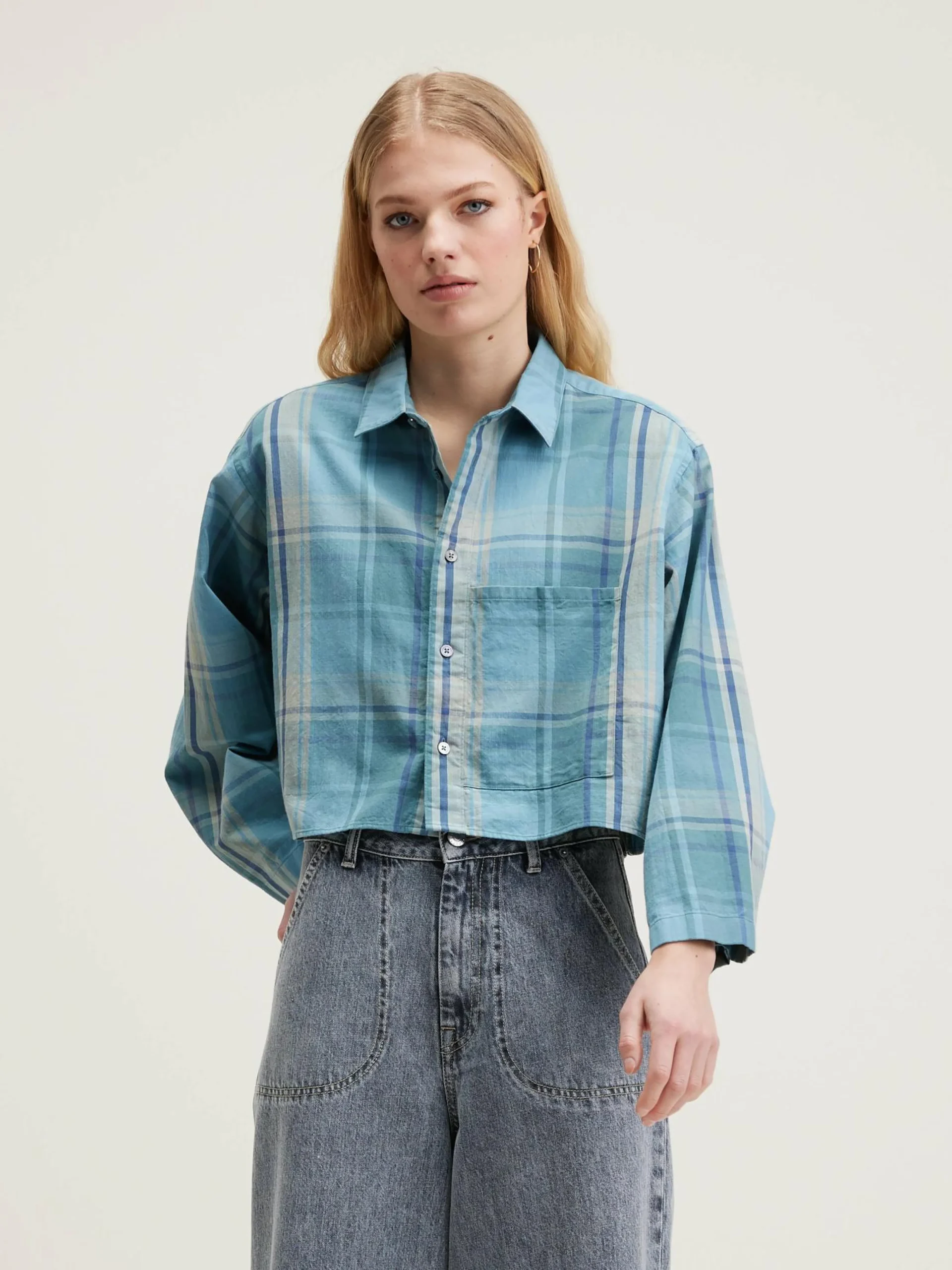 Oversized, cropped overhemd van blauw geruit katoen.