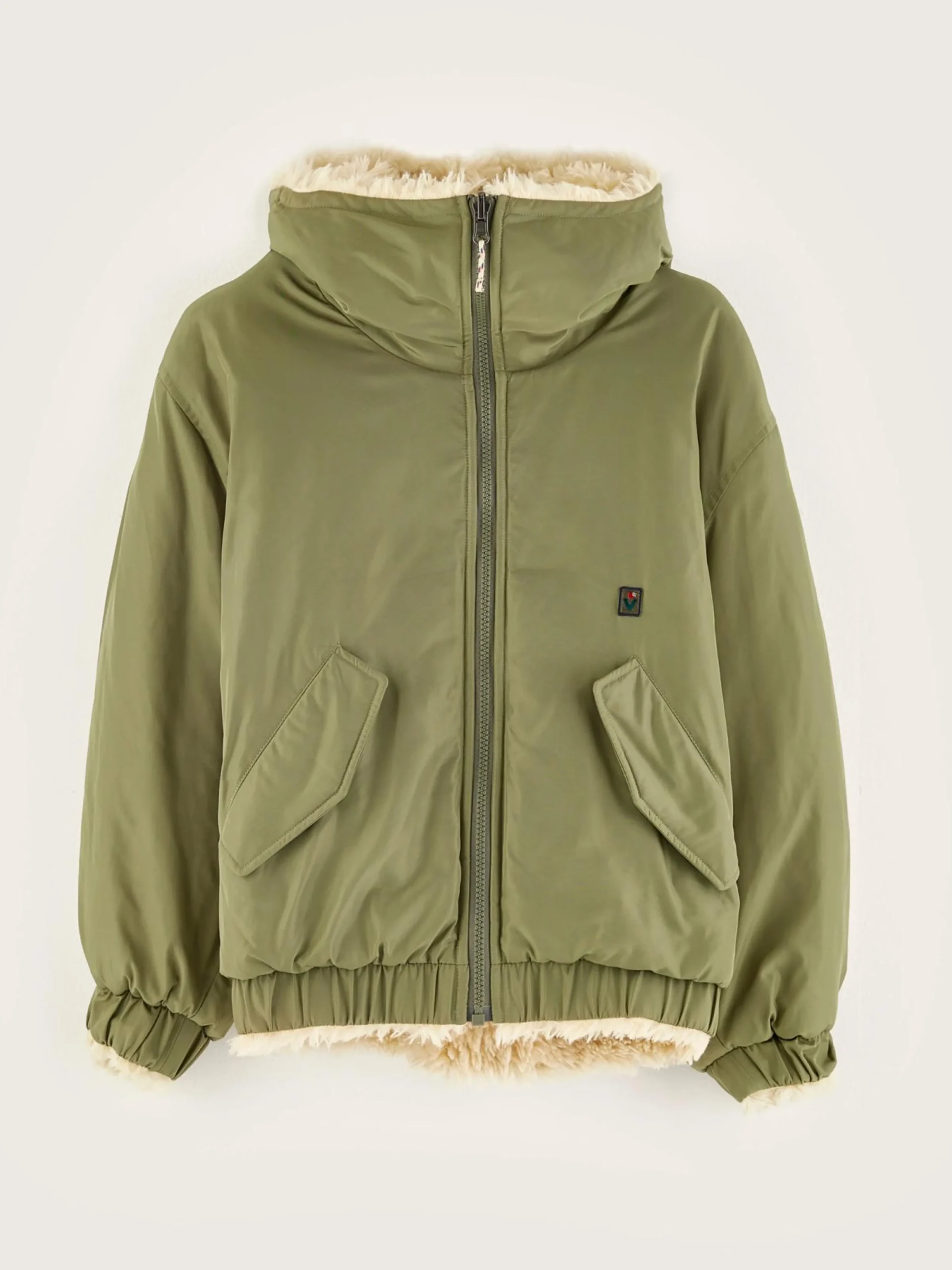 Omkeerbare kakigroene jas in bomberstijl met voering van nepbont.