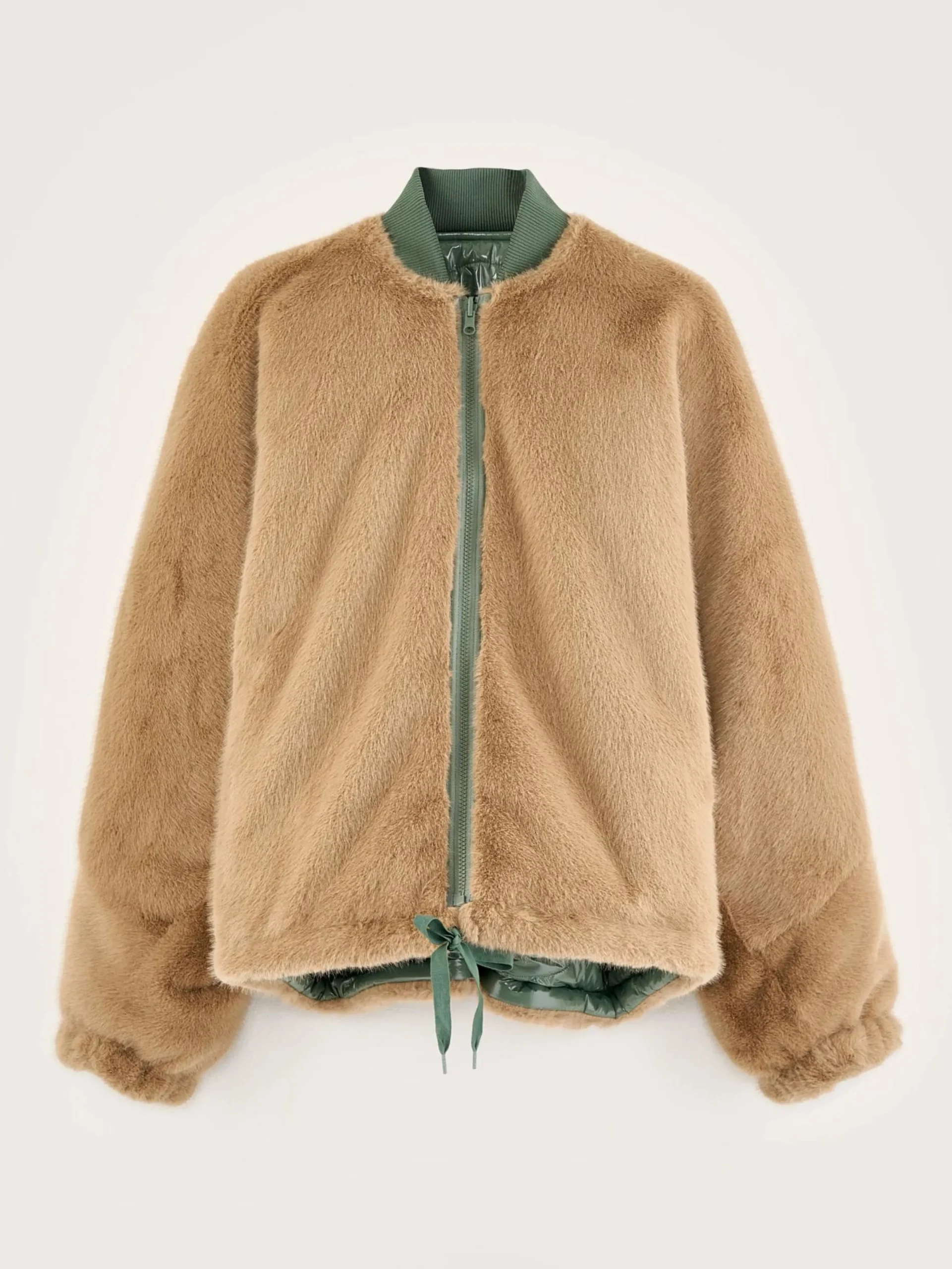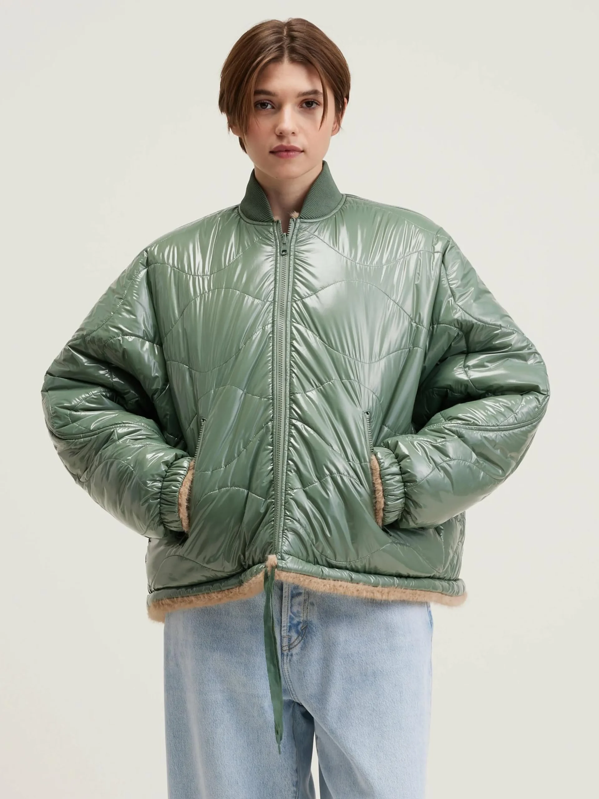 Omkeerbare, gewatteerde en oversizede jas, in een glanzende eucalyptusgroene stof.