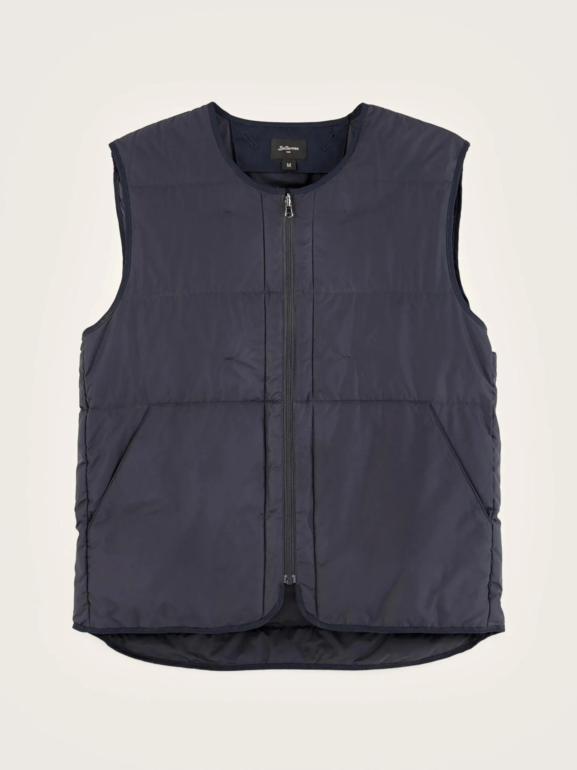 Omkeerbare bodywarmer met rits in marineblauw gewatteerd polyester.