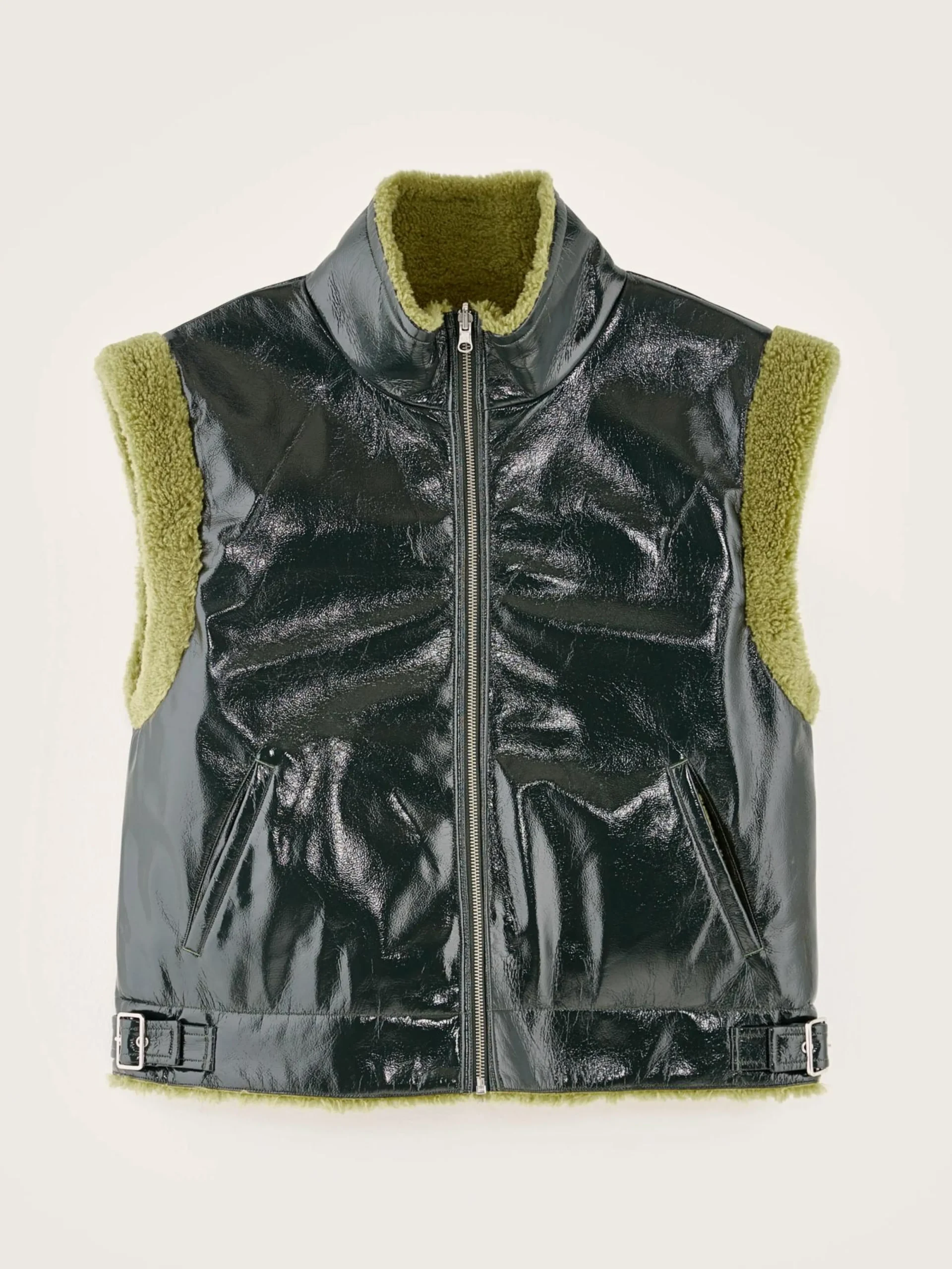 Mouwloze bodywarmer met een ritssluiting vooraan, van grijs imitatieleer en een voering van teddystof.