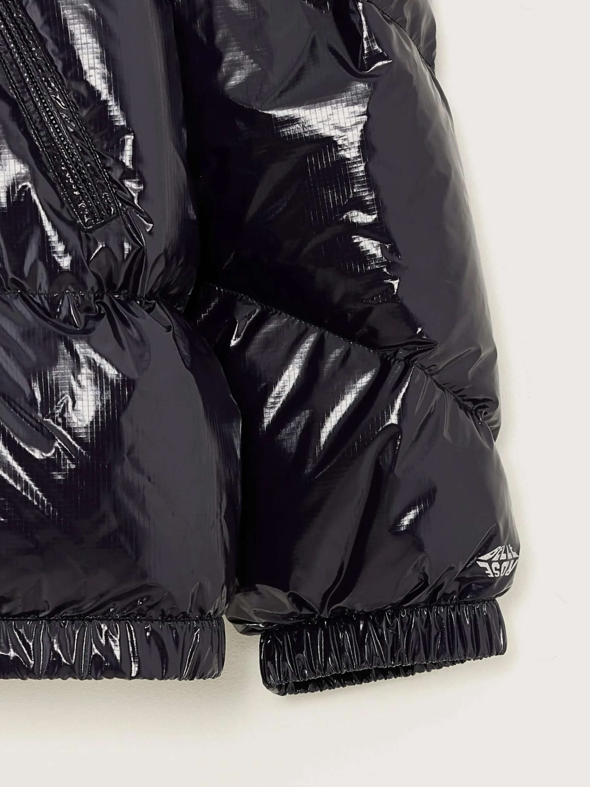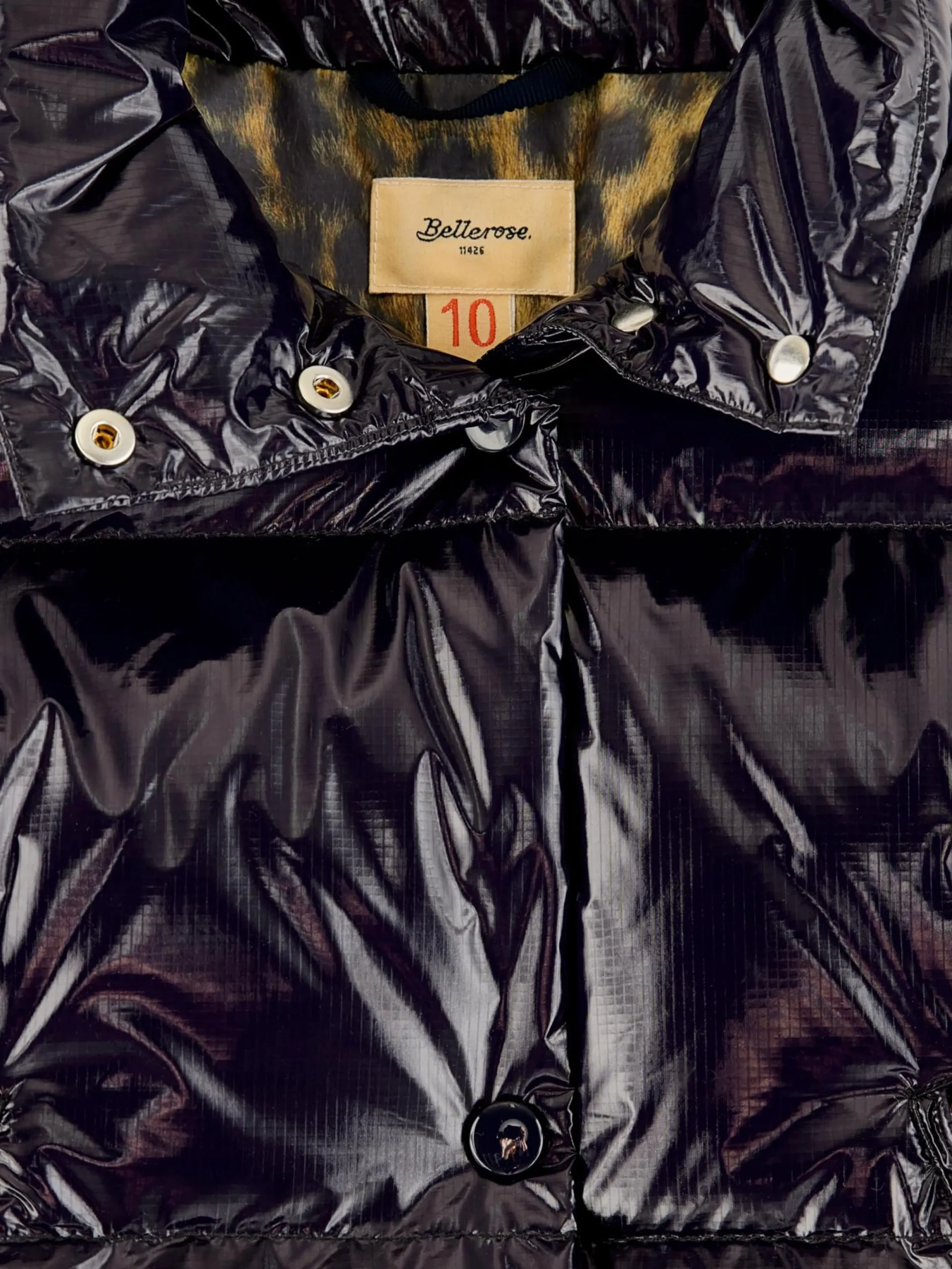 Donkerblauwe pufferjas met ritssluiting vooraan, aanpasbare lengte dankzij drukknopen.