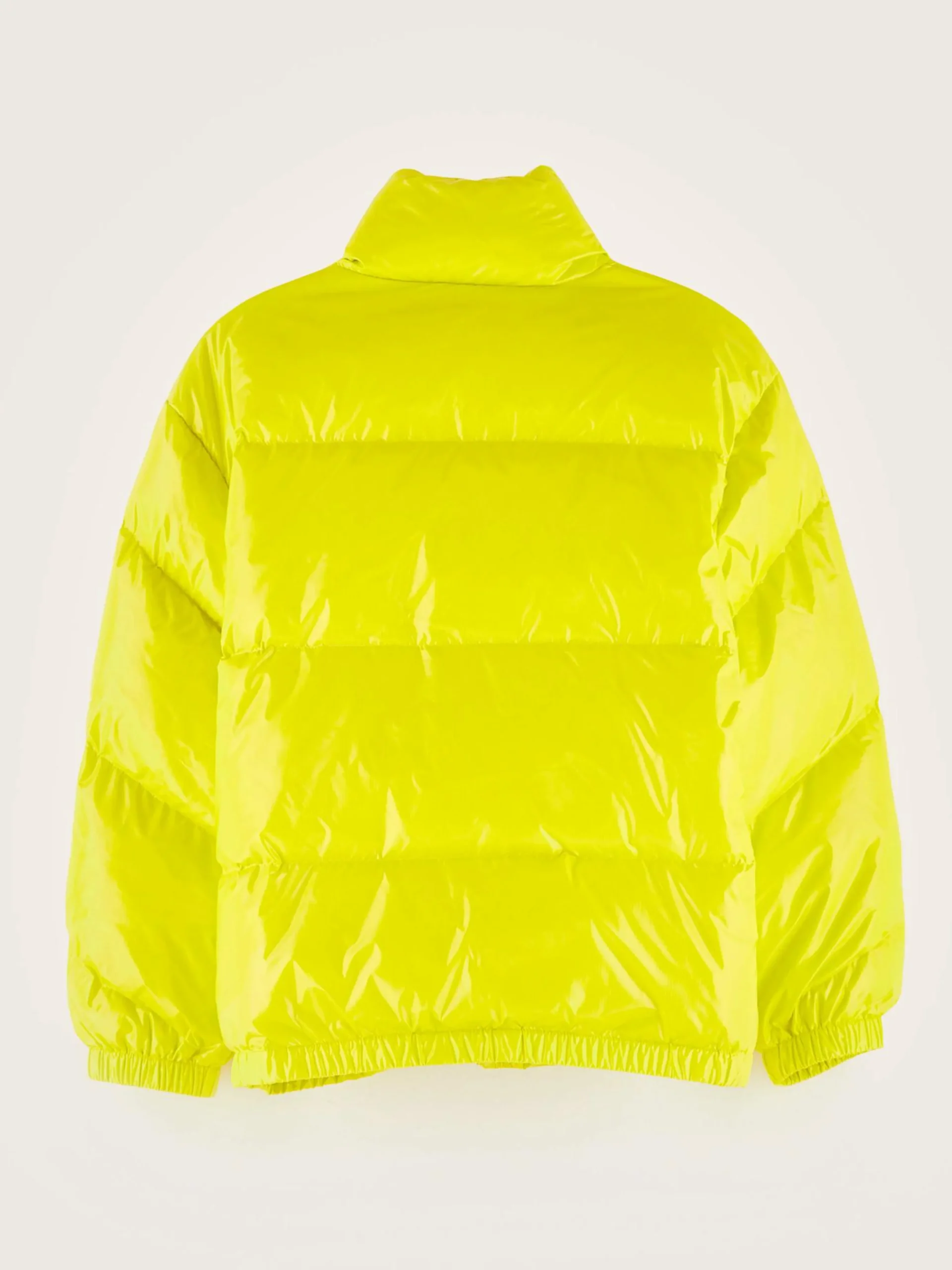 Gloeiend gele pufferjas met ritssluiting vooraan, aanpasbare lengte dankzij drukknopen.