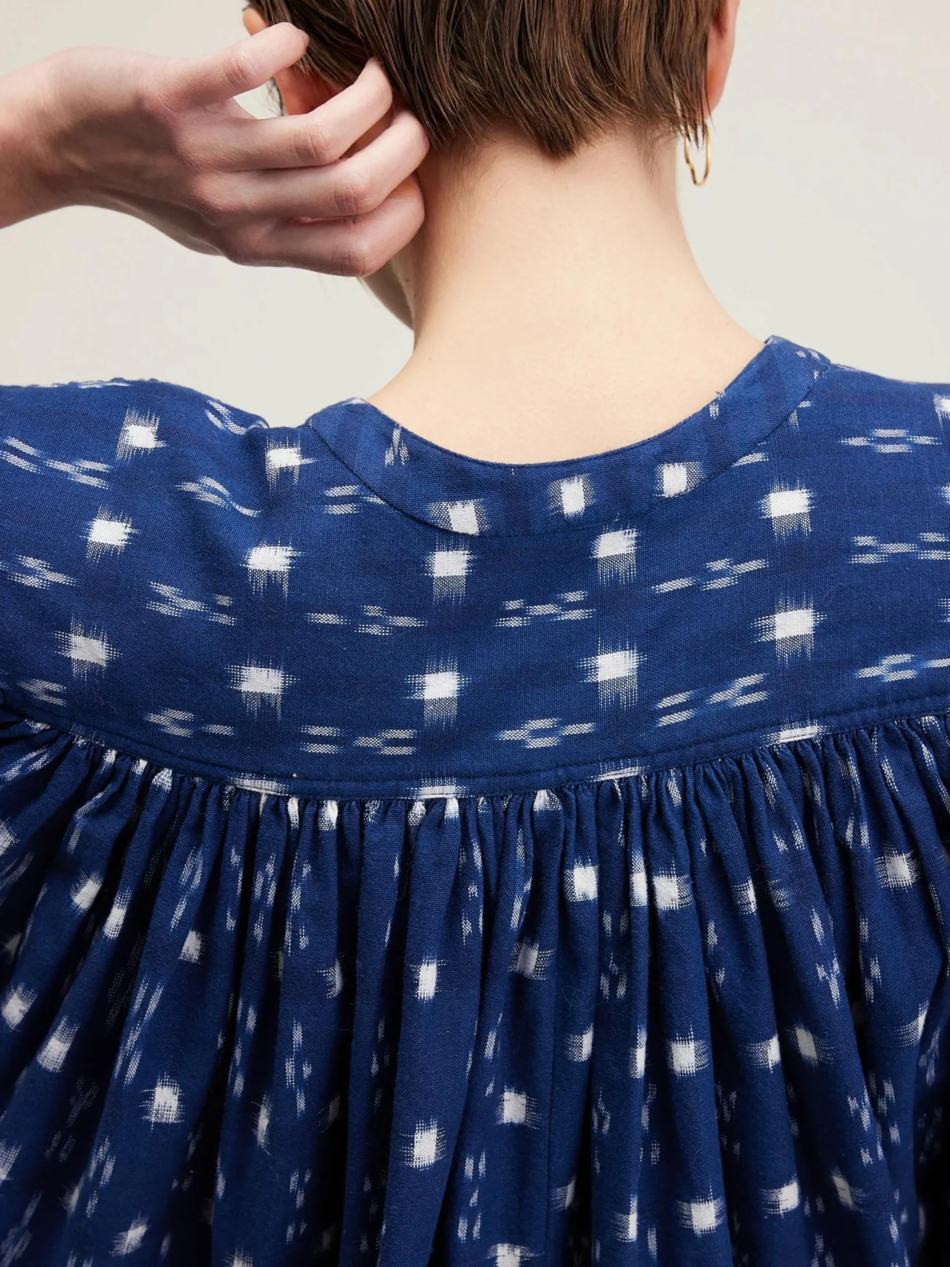 Oversizede cropped blouse van blauw Ikat katoen, met gefronste details.