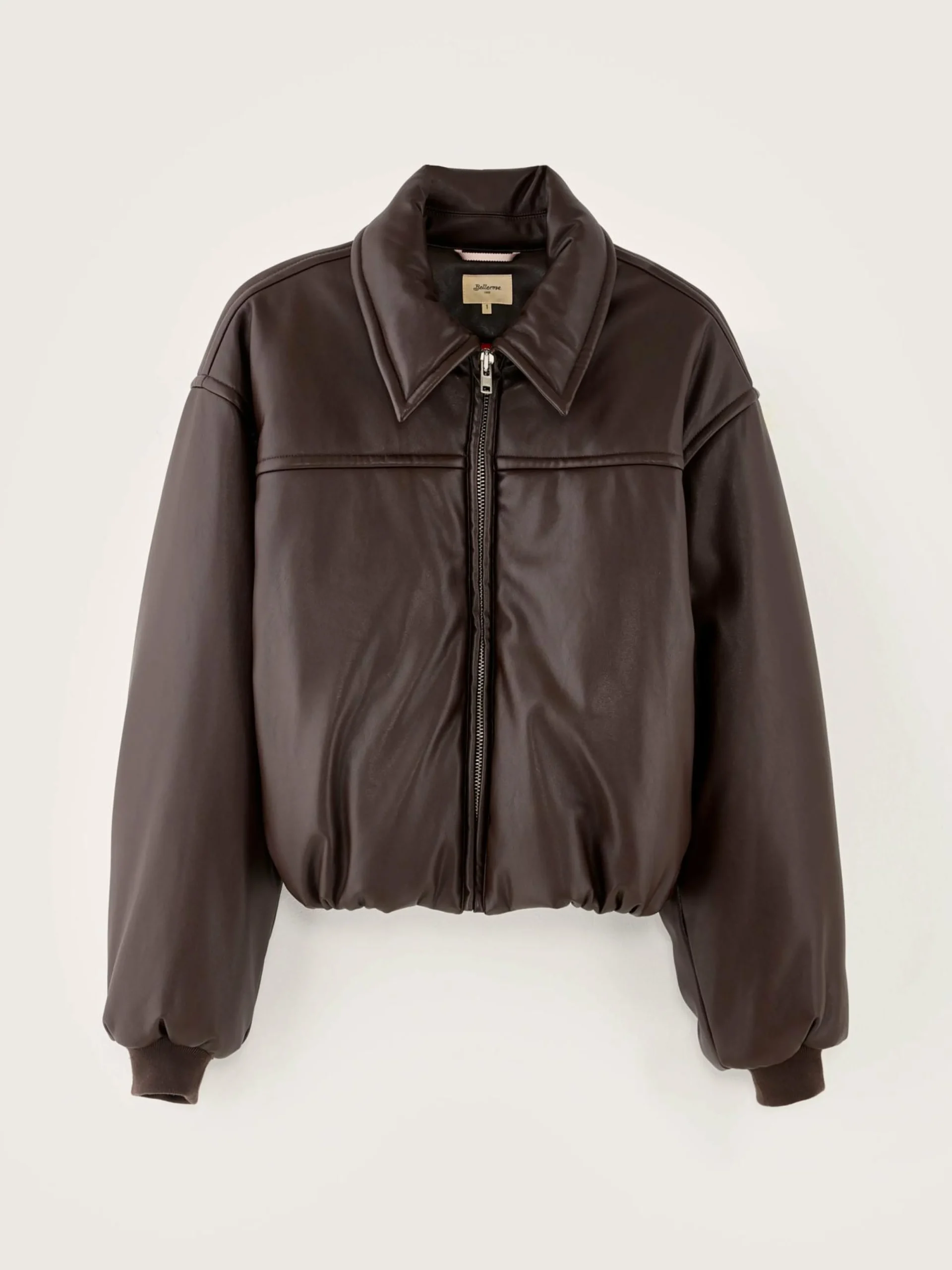 Donkerbruine bomberjas van imitatieleer, met een klassieke kraag en geribde mouwranden.