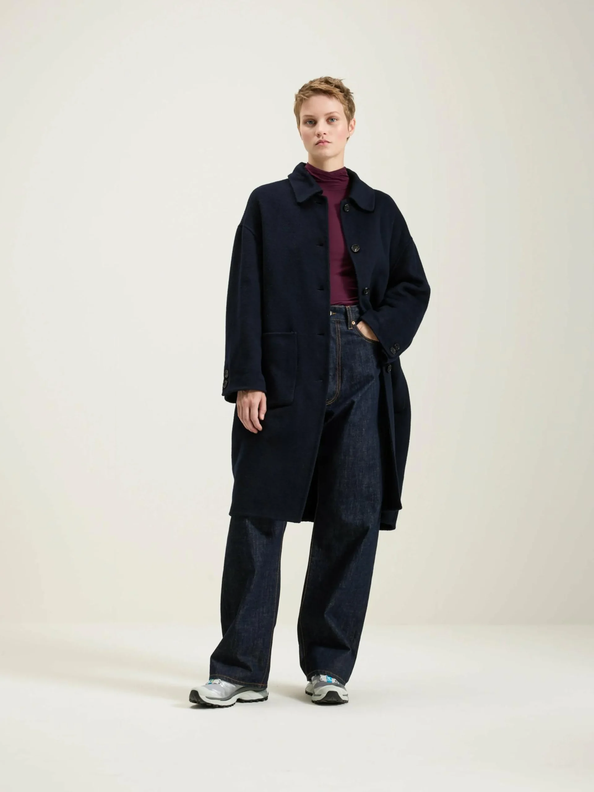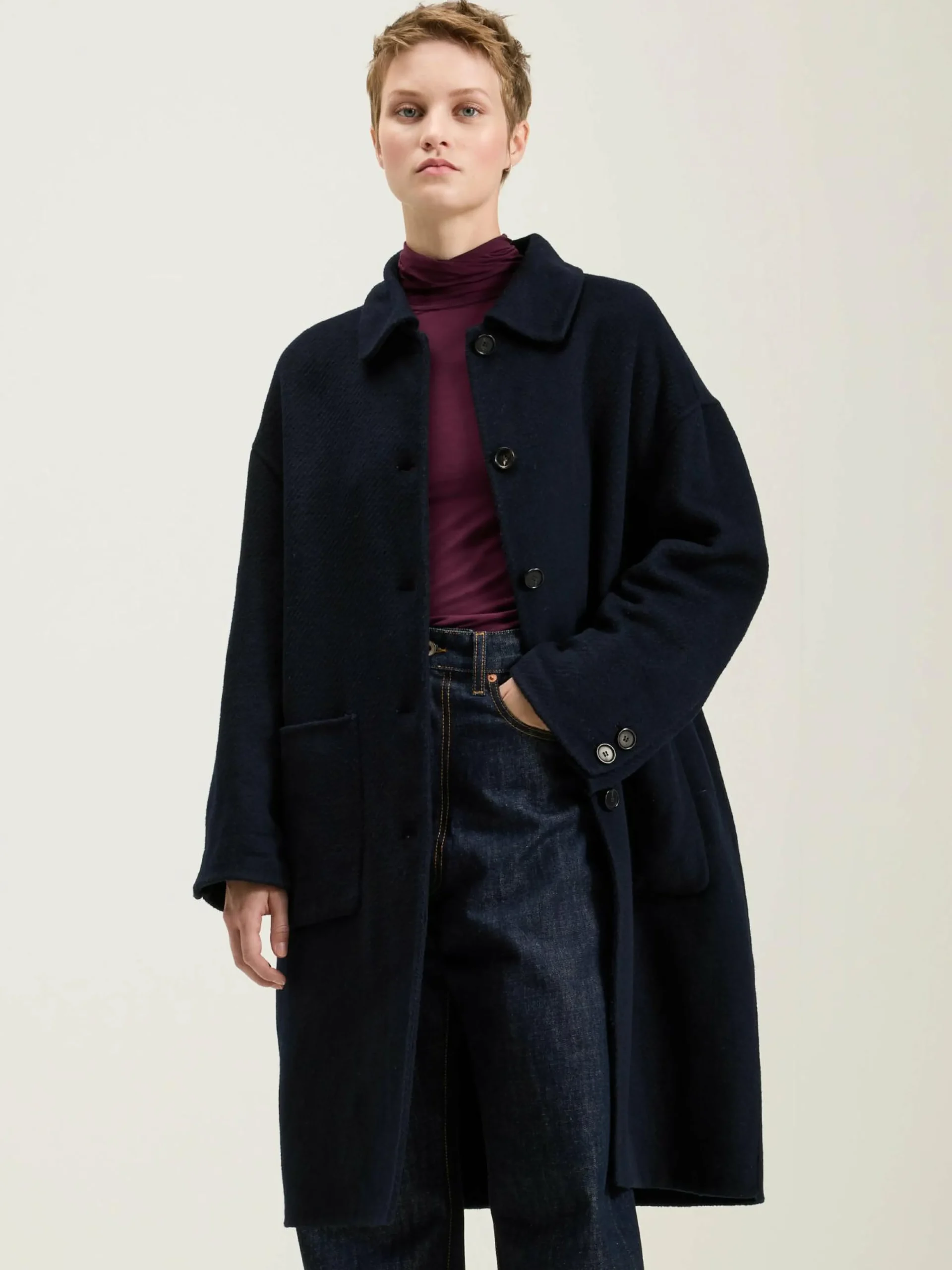Marineblauwe, klassieke mantel met knoopsluiting vooraan, een lage schouderlijn en opgestikte zakken.