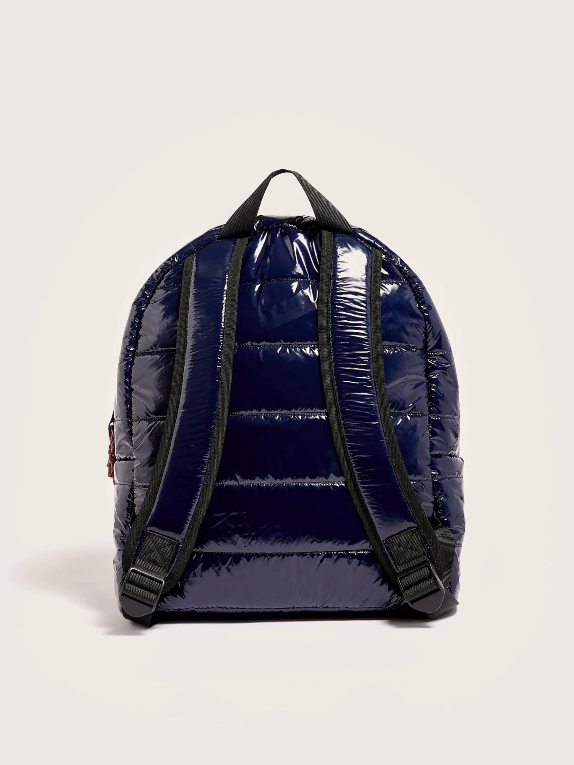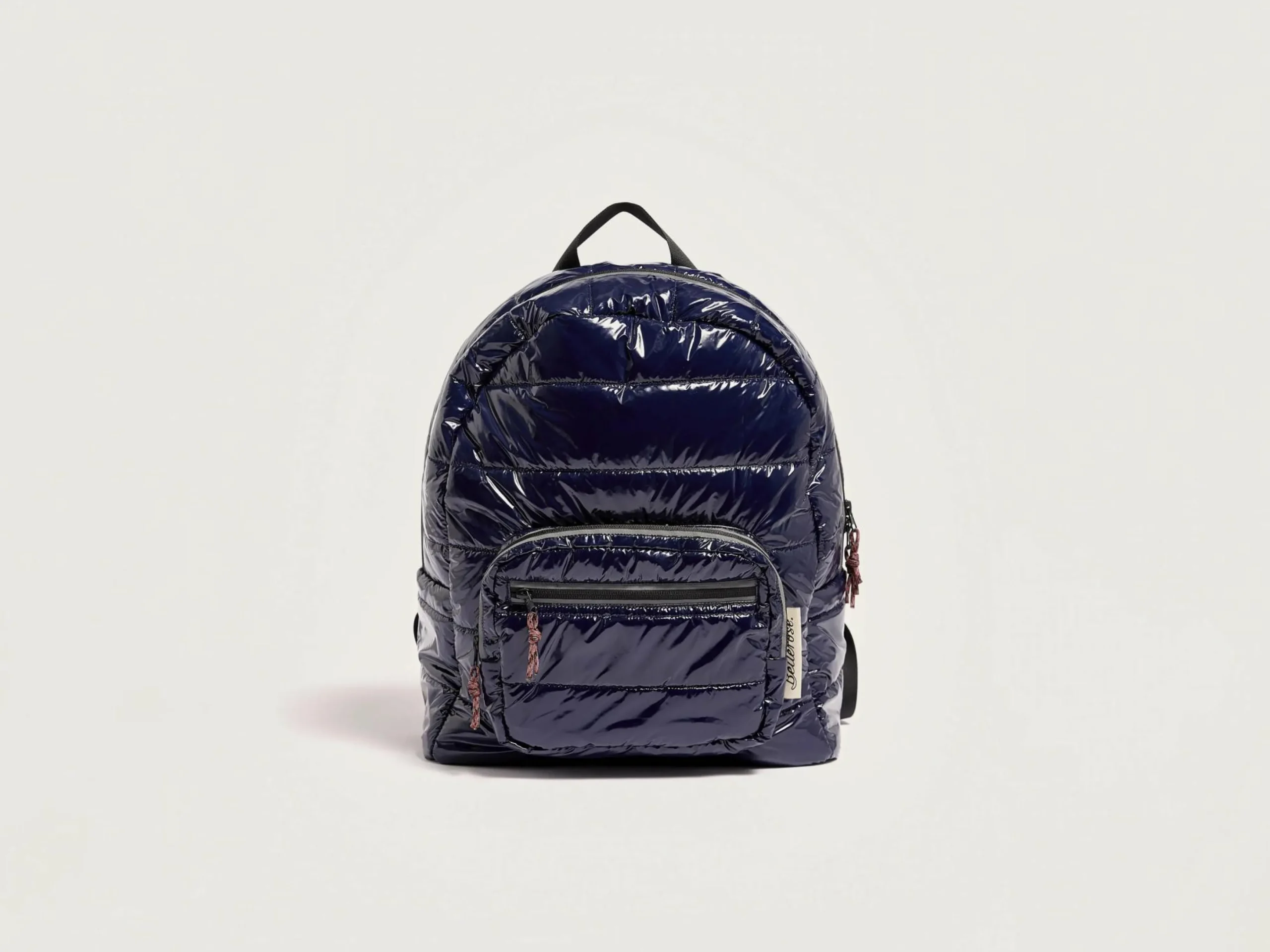 Gewatteerde rugzak van glanzend, marineblauw ripstopmateriaal, met een ritssluiting aan de bovenkant en een voorvak.