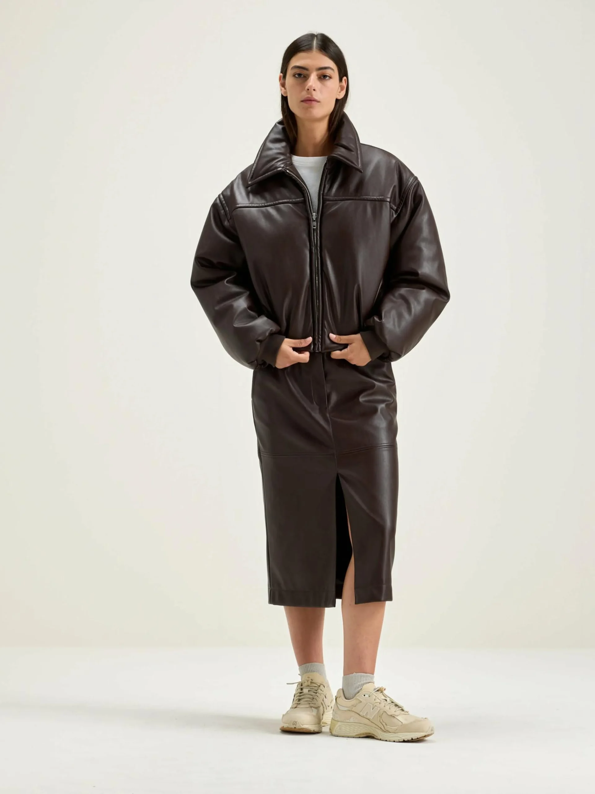 High-waist kokerrok van bruin imitatieleer, met voorsplit.