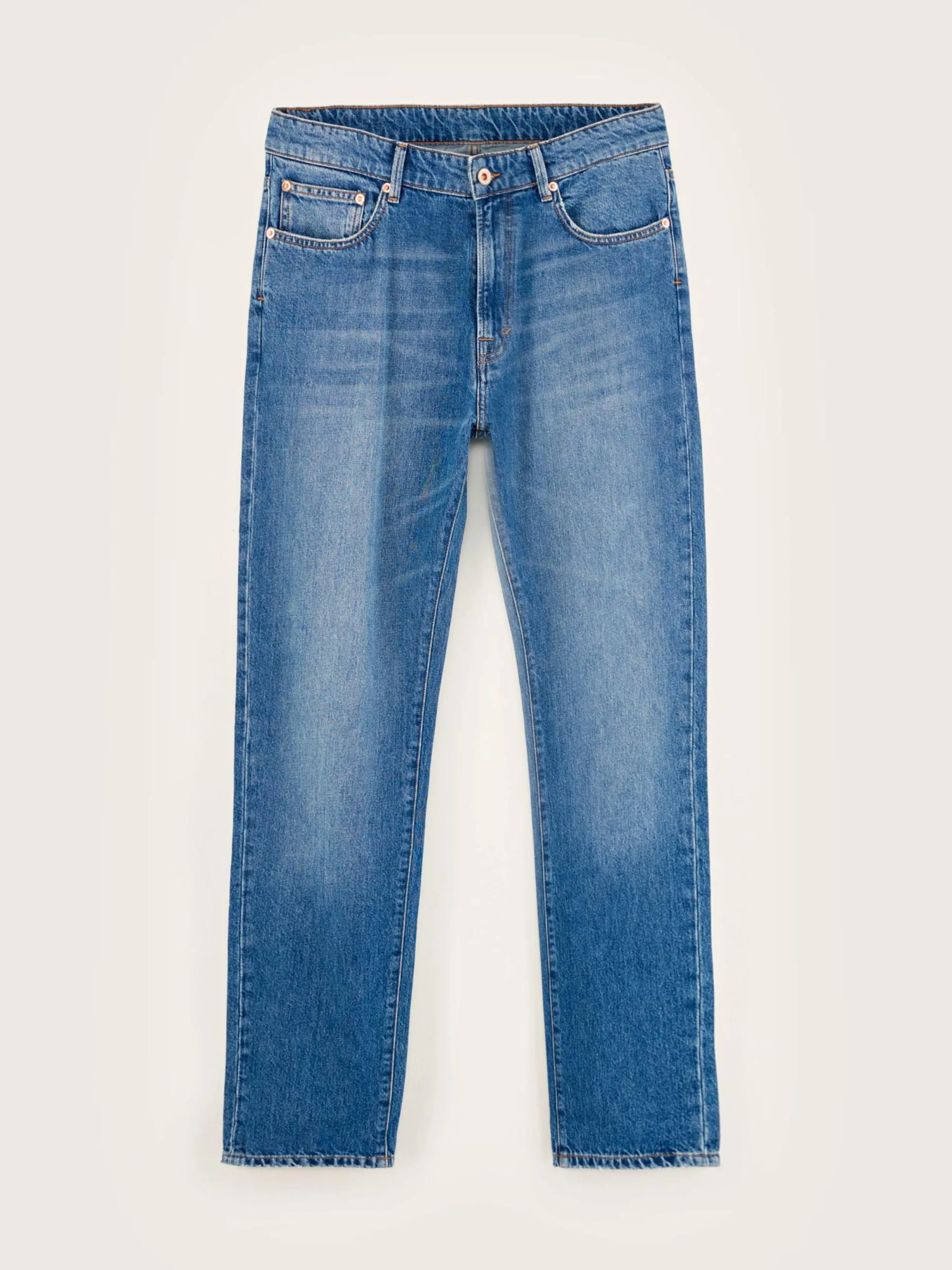 Regular fit jeans met normale taille, van middenblauw gebleekt katoendenim.
