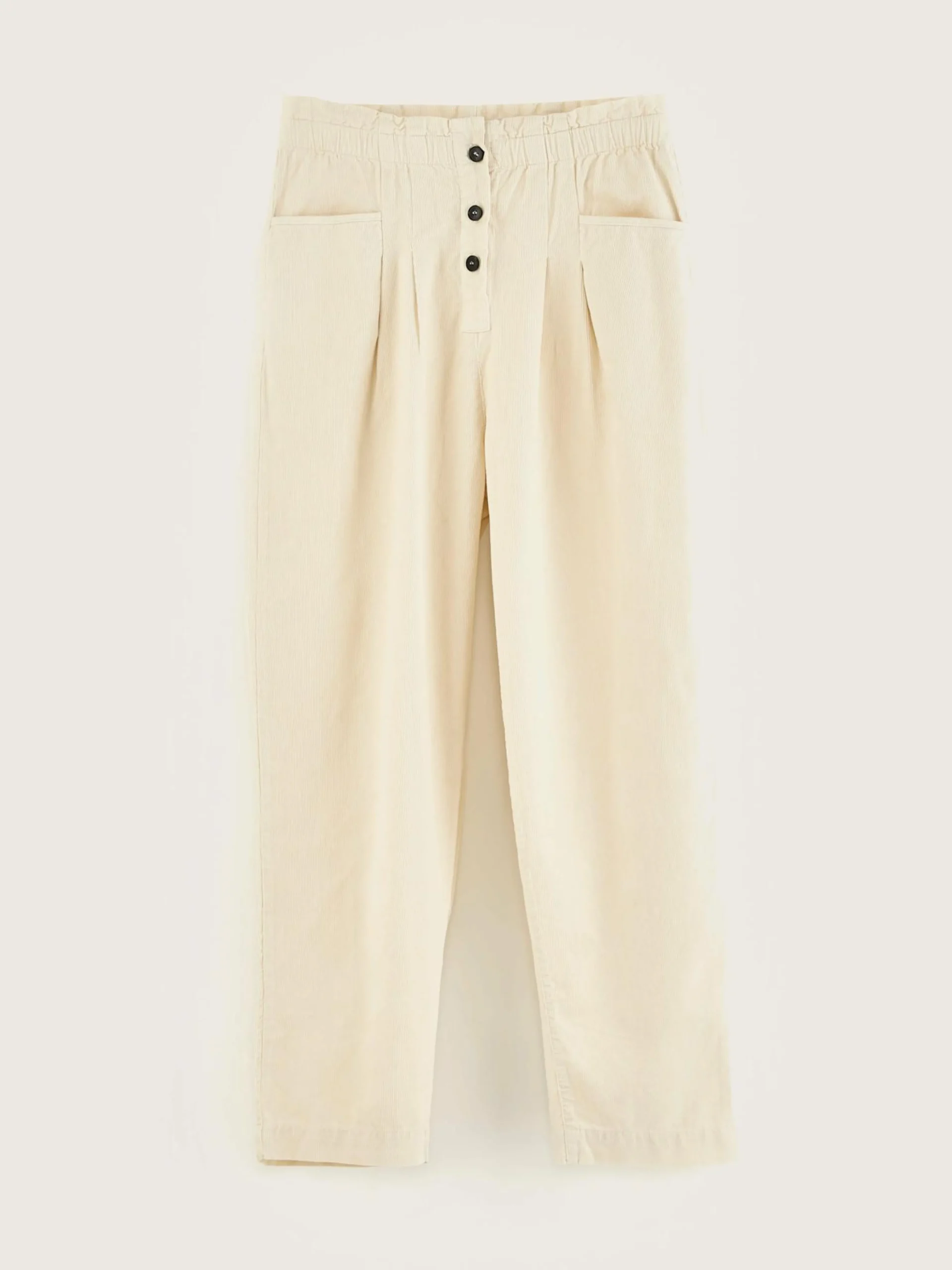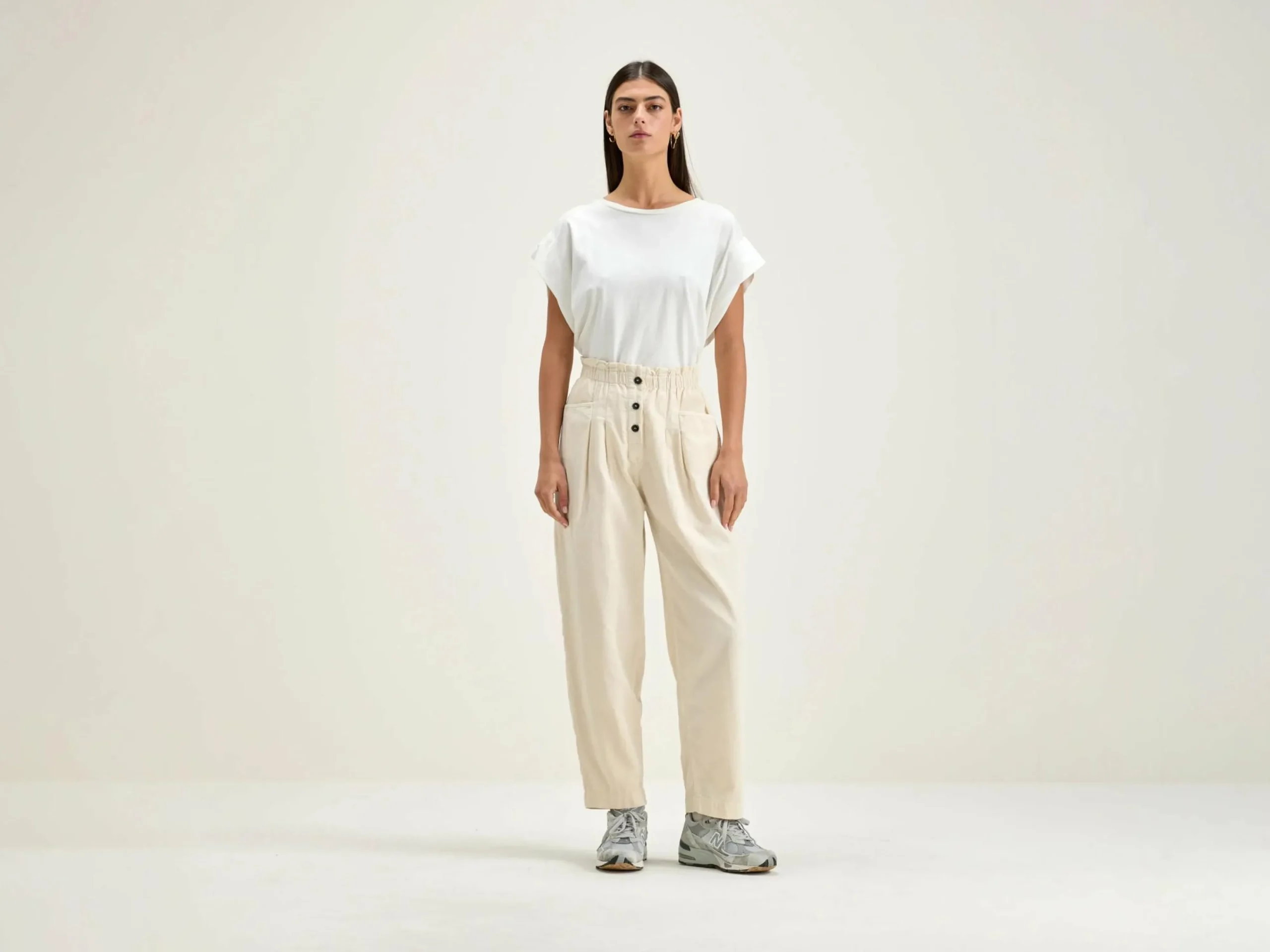 Beige paperbagbroek van katoen- en linnencanvas, met taps toelopende pijpen.
