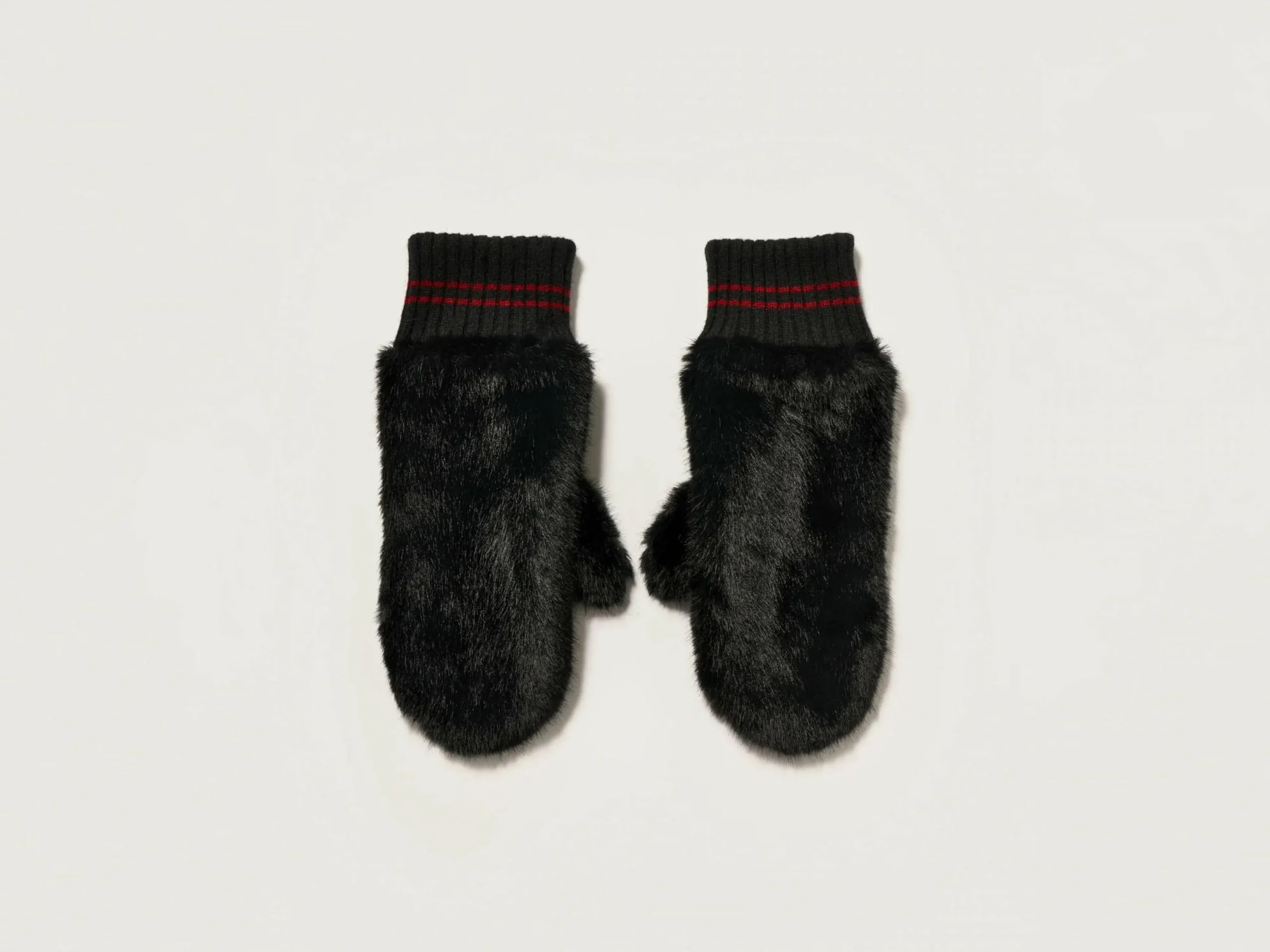 Wanten van zwart nepbont, met leer ter hoogte van de handpalmen en een ribgebreide rand aan de polsen.