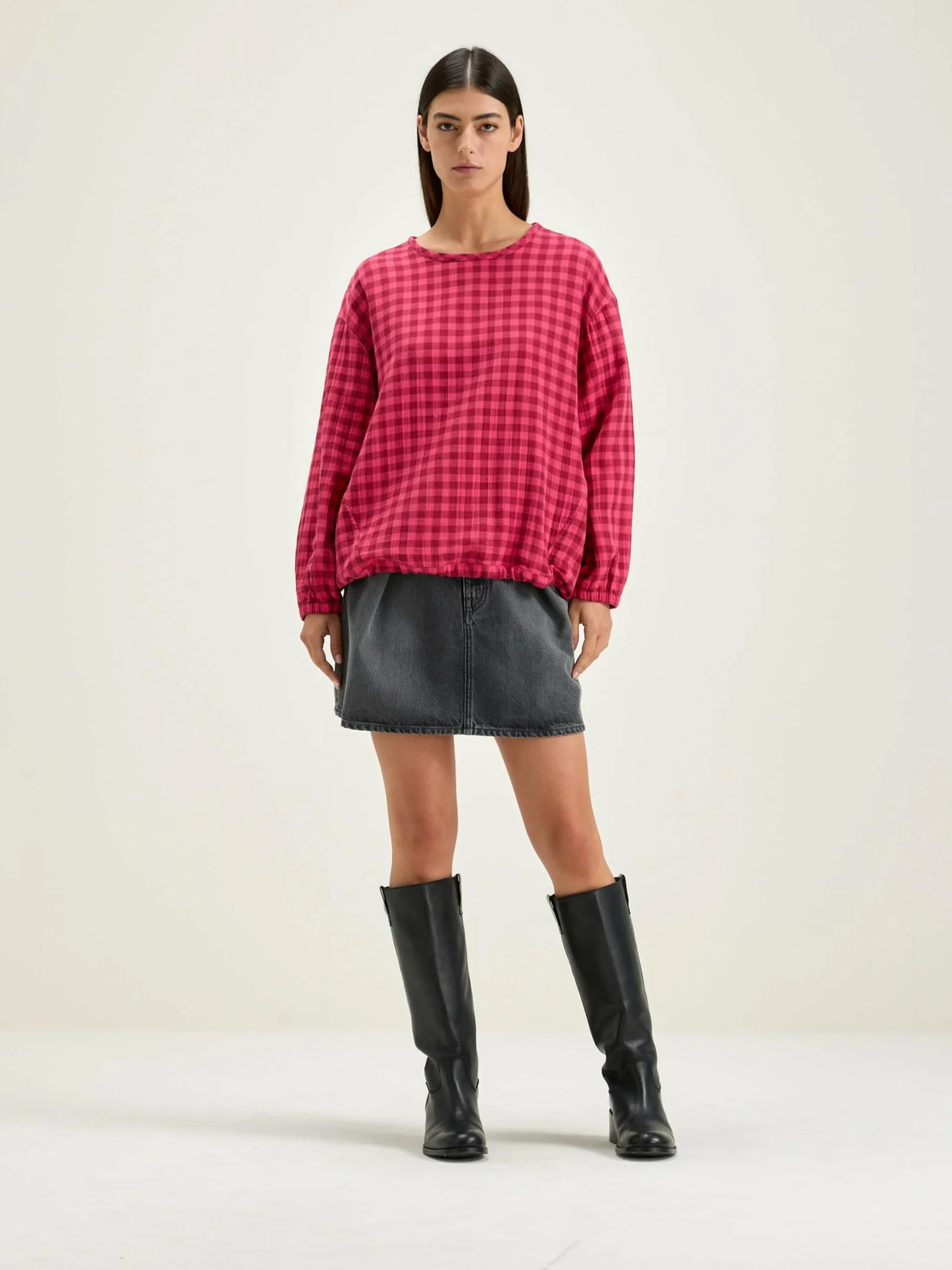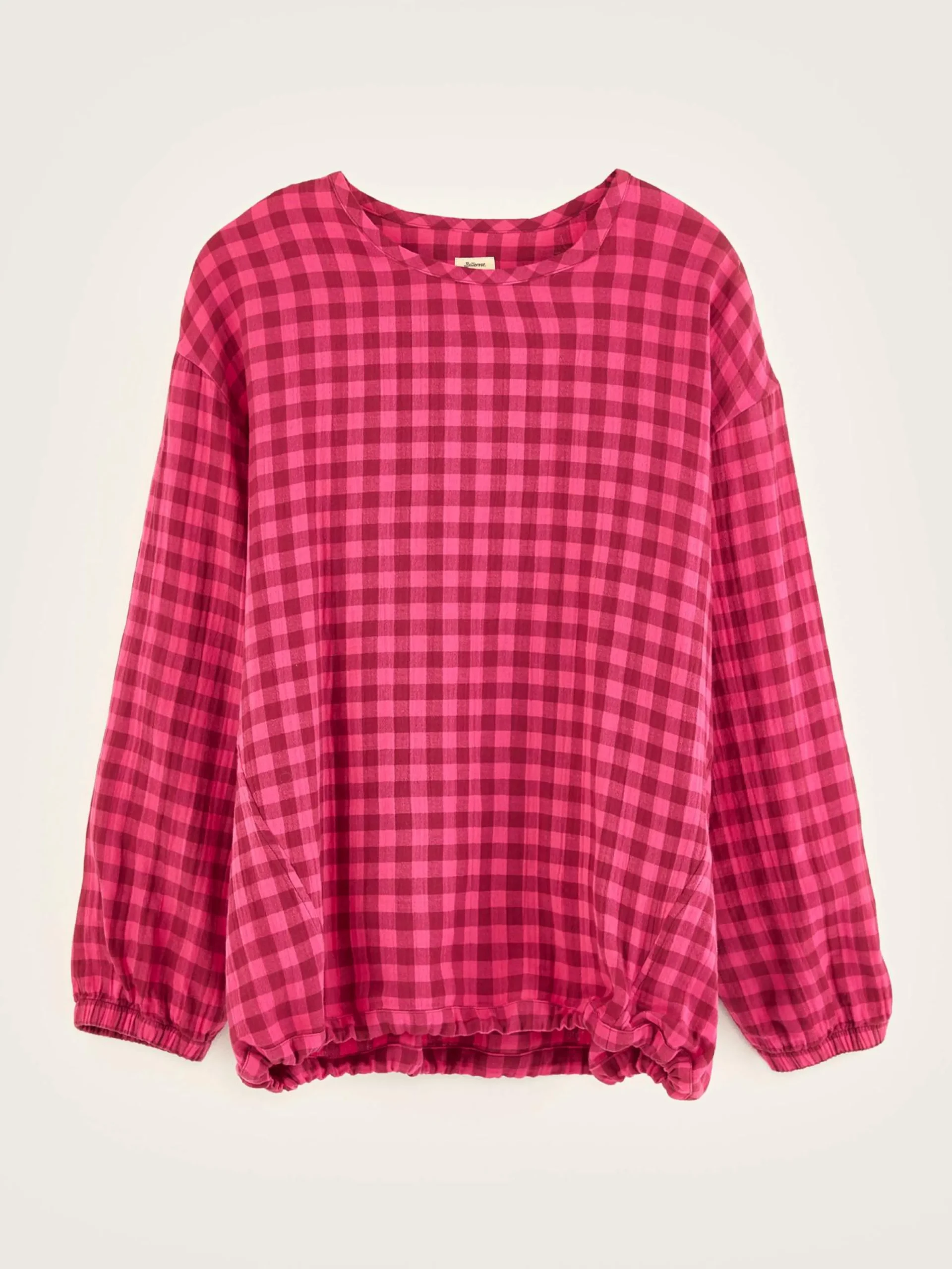 Oversizede, T-shirtachtige blouse van katoen met roze en rode ruitjes.