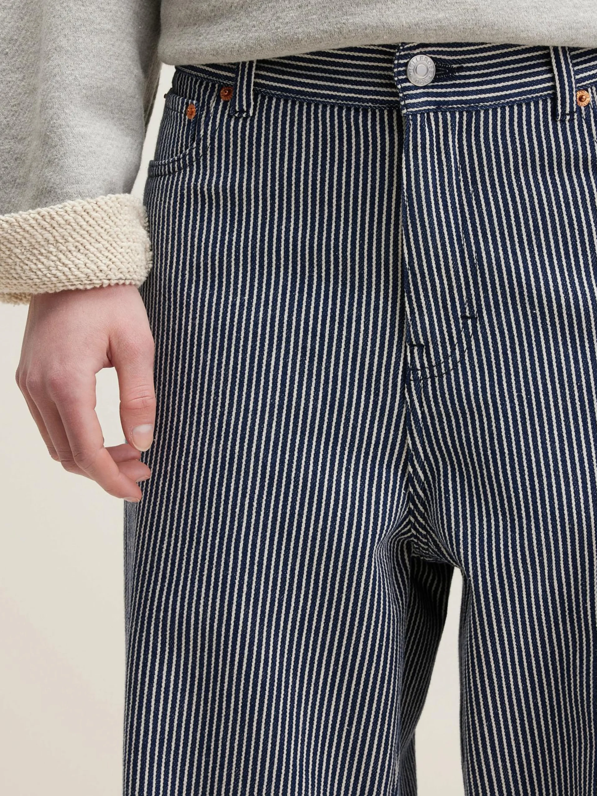 Hoog getailleerde boyfriend jeans met wijde pijpen en distressed details op de zoom, in licht stonewash katoen denim.