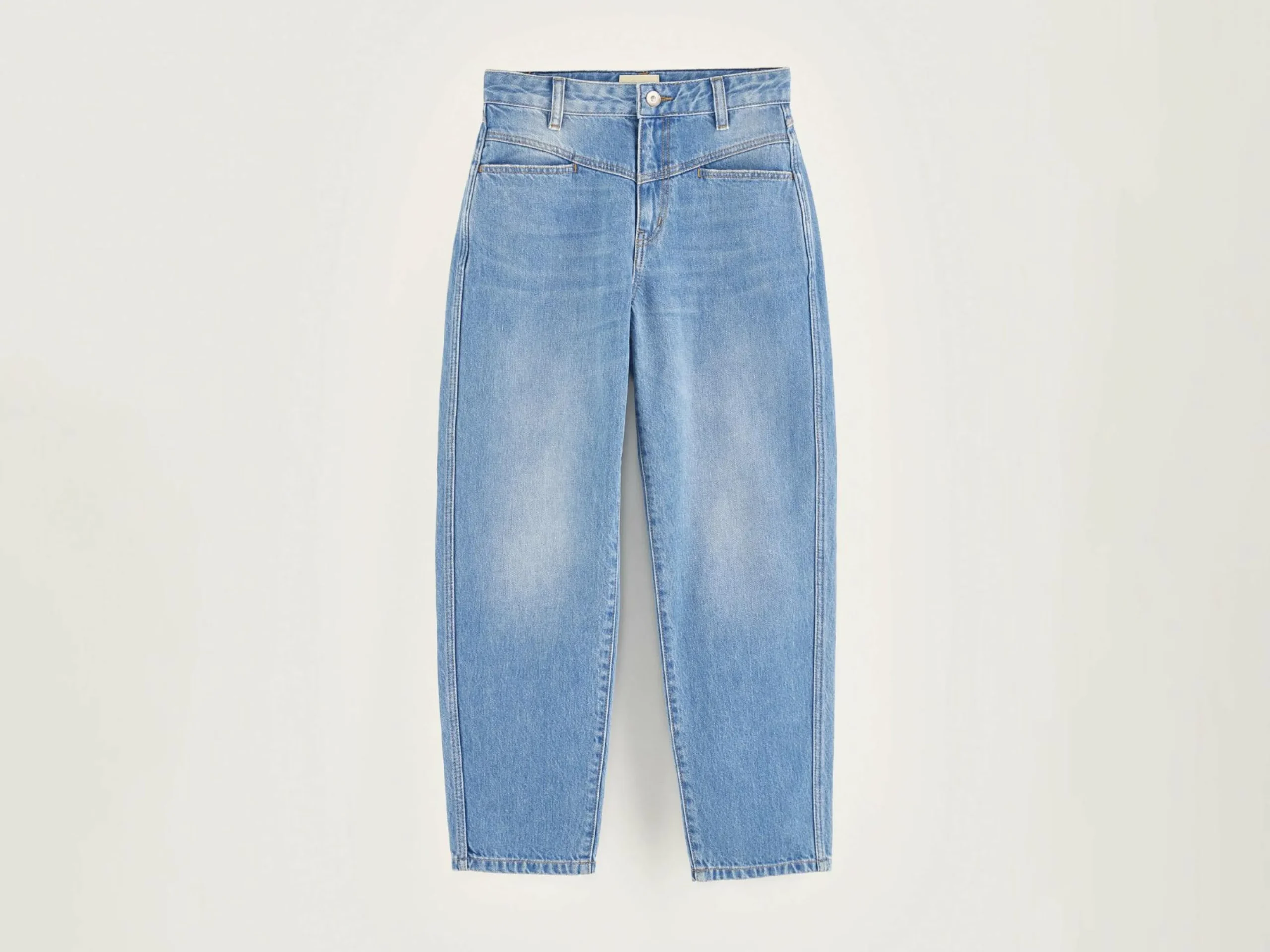 Hoge taille jeans met taps toelopende pijpen, heavy stone wash.