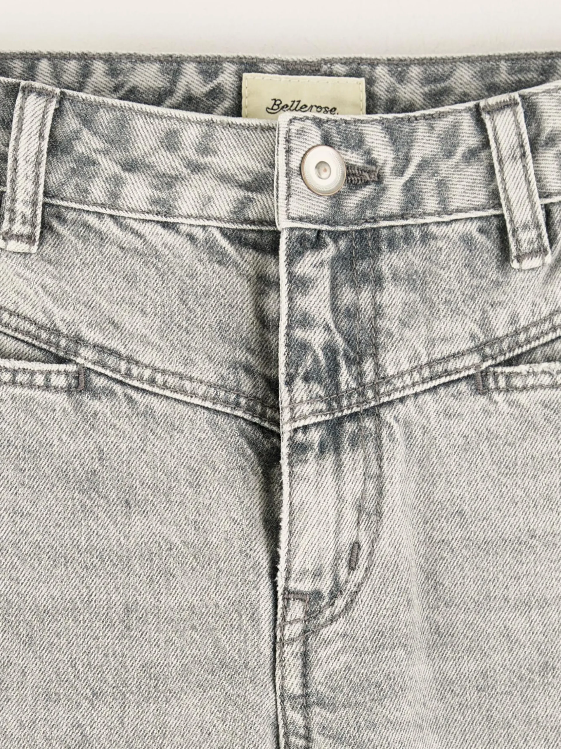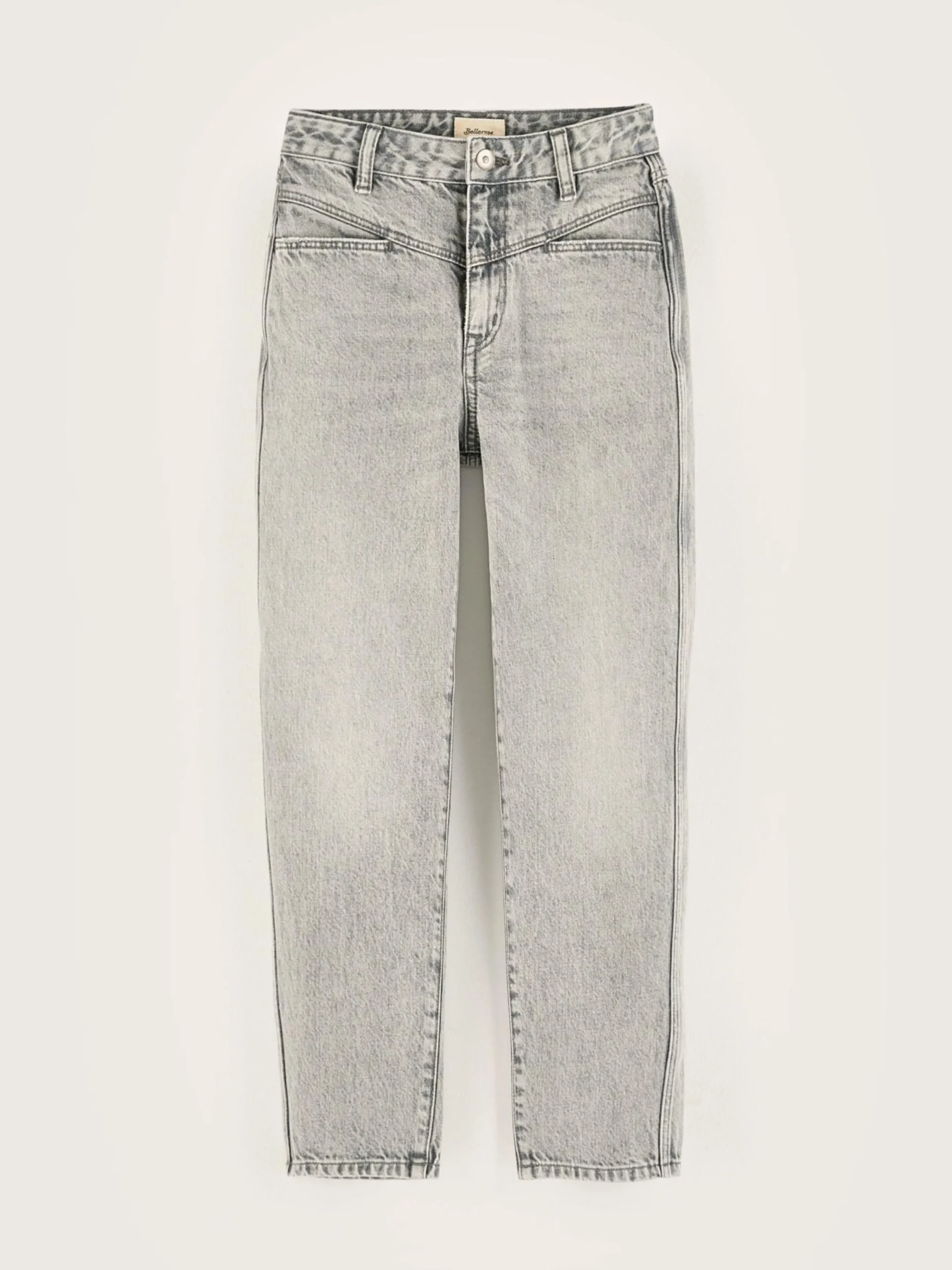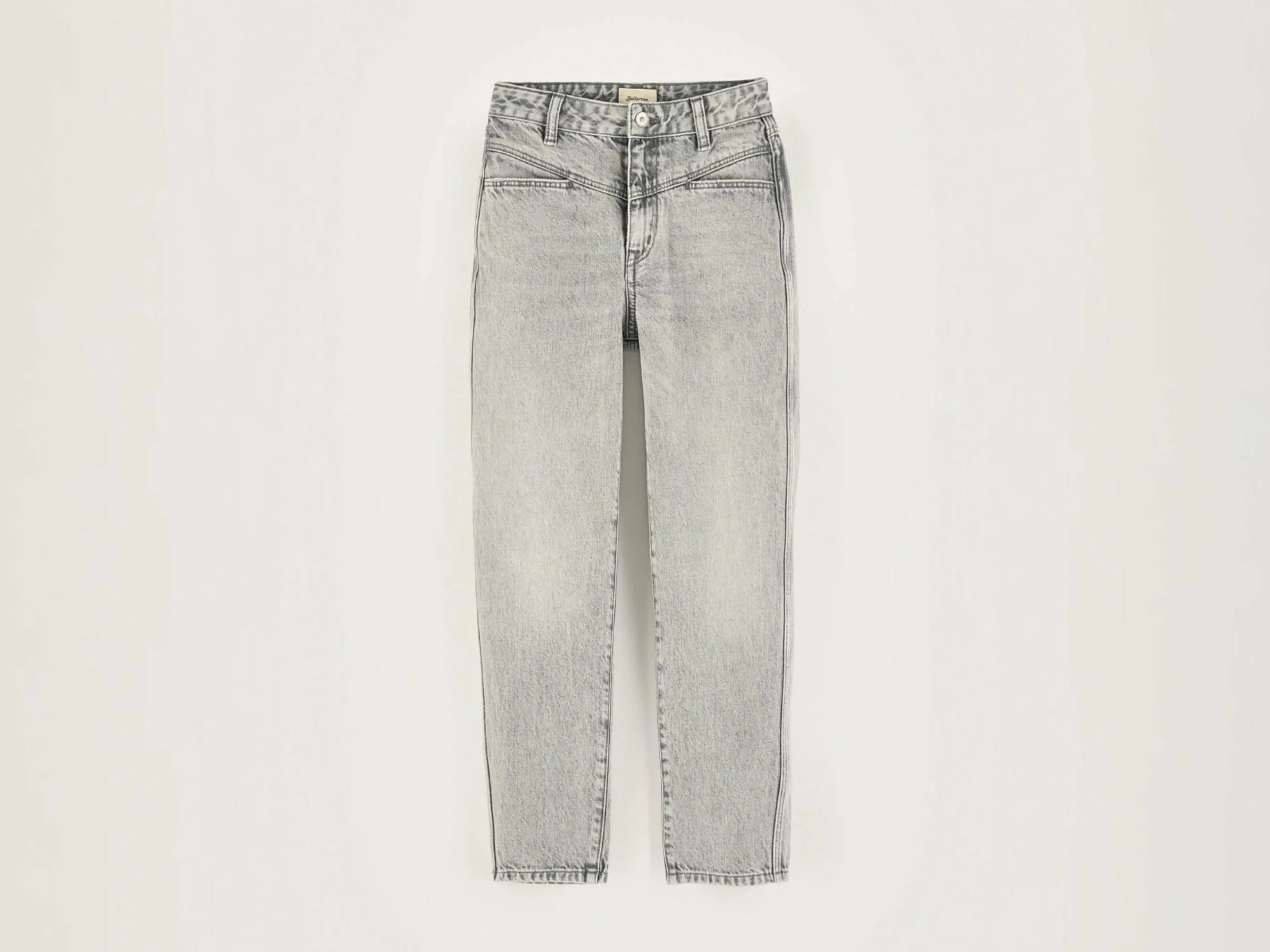 Hoge taille grijze jeans met taps toelopende pijpen en een versleten look.