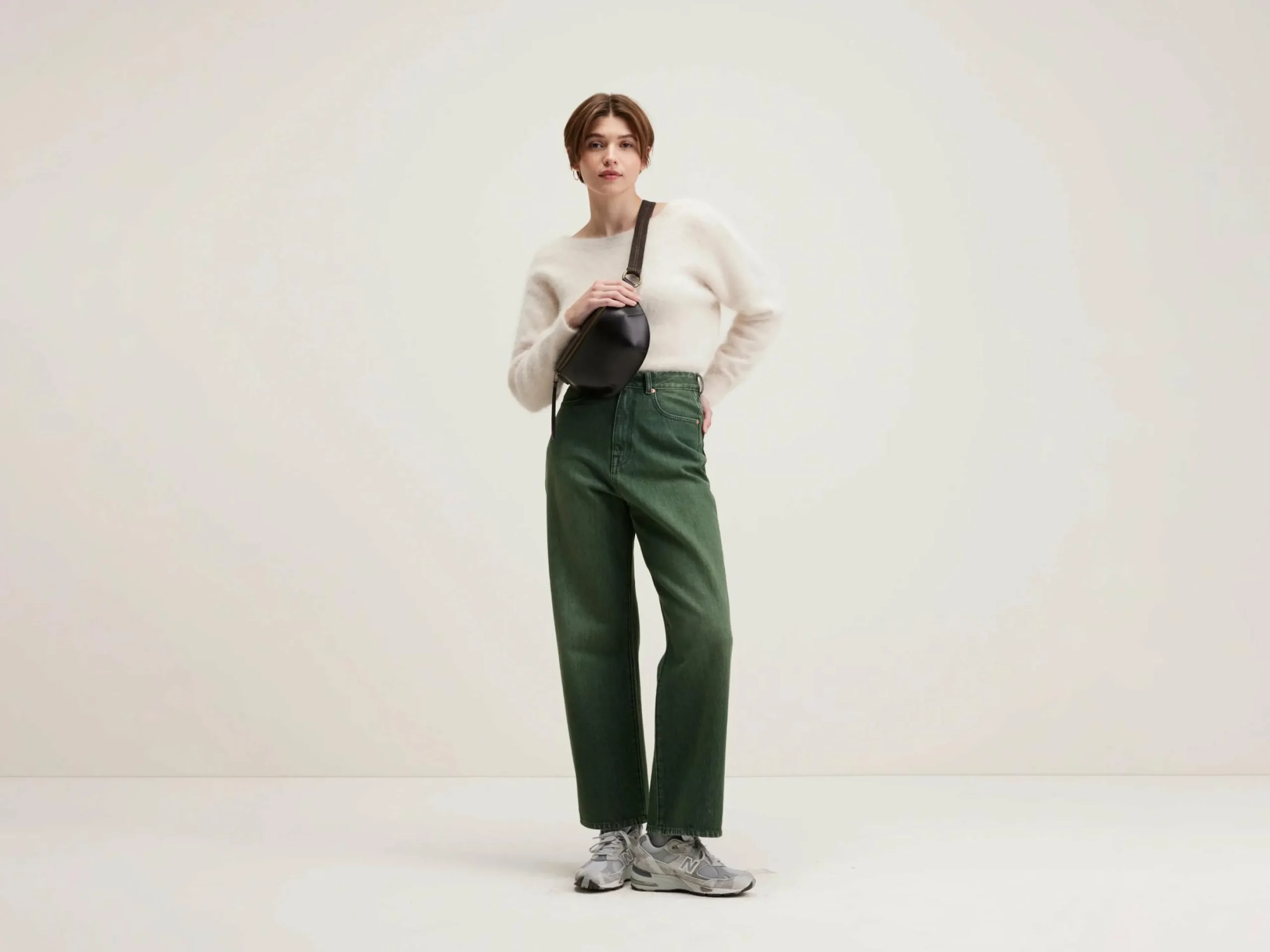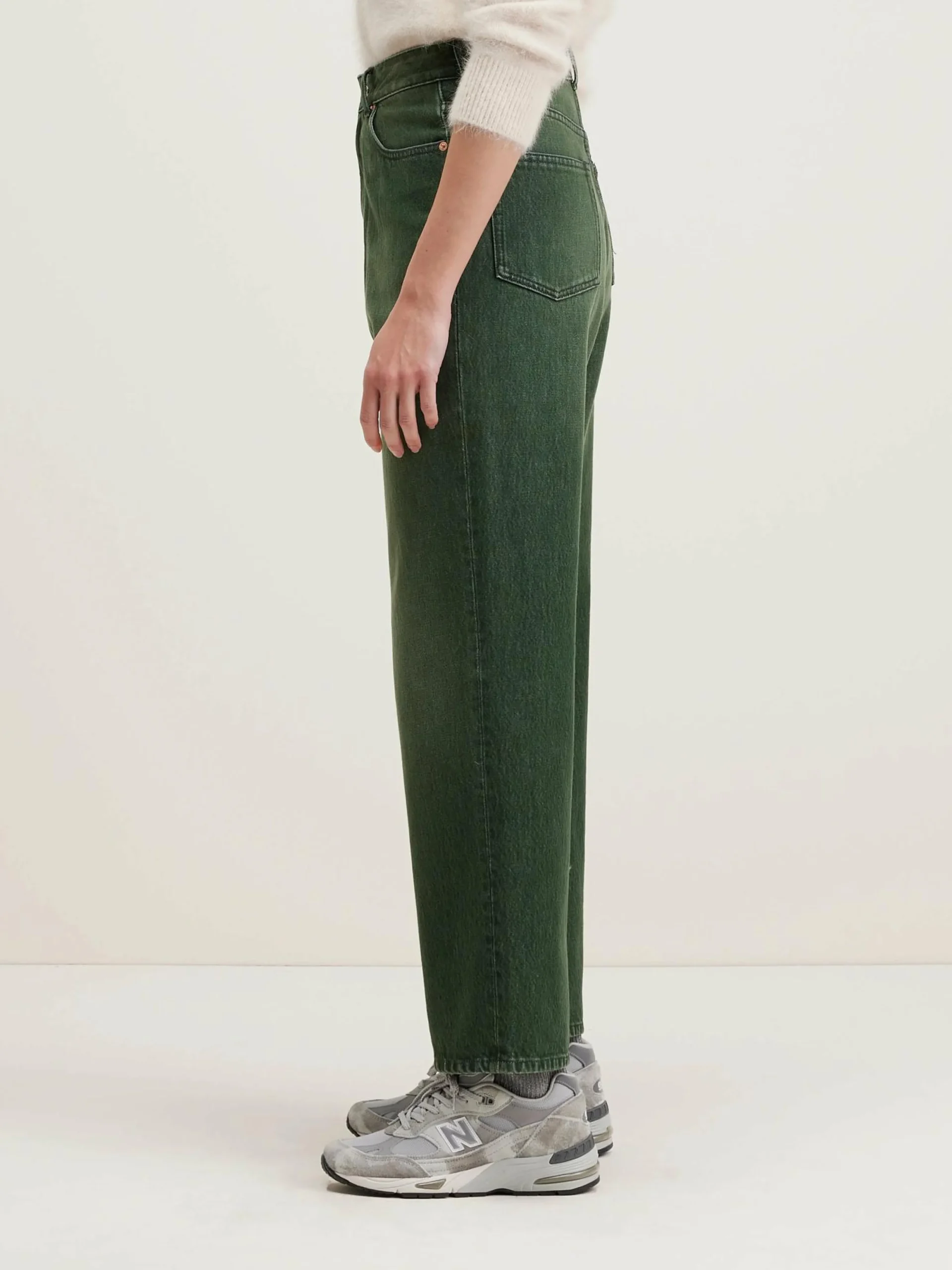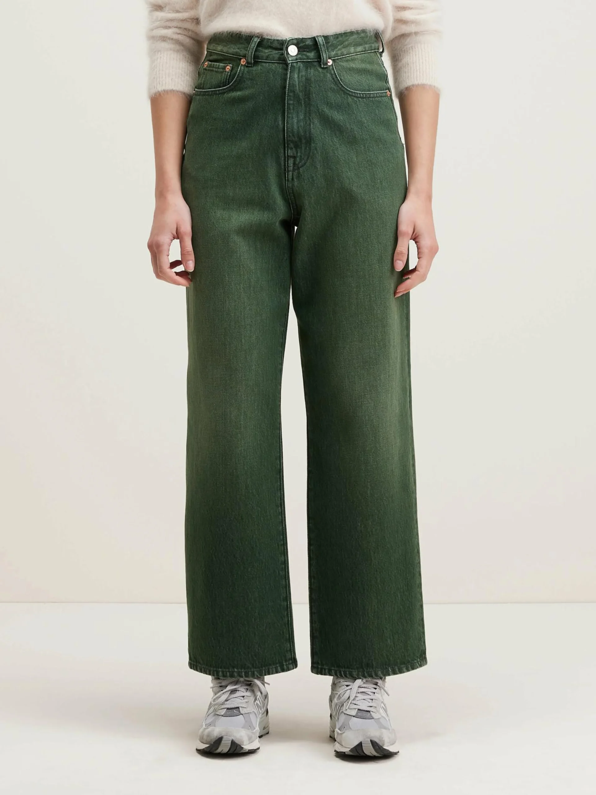 Wijde pijpen, superhoge taille, jeans van groen katoendenim met vijf zakken.