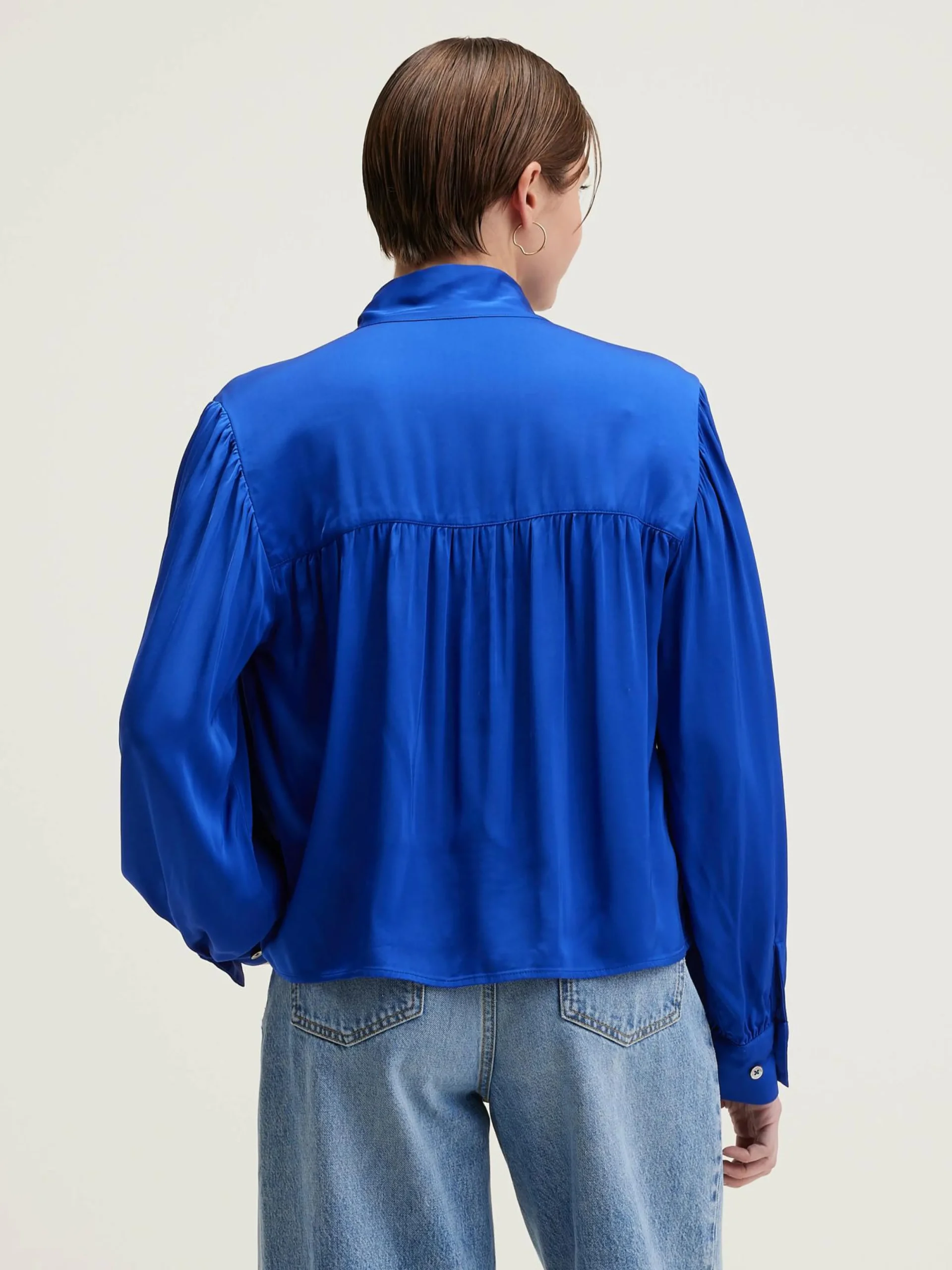 Klassieke, lazuurblauwe blouse van viscose, met lavalliêrekraag en gefrontste details.