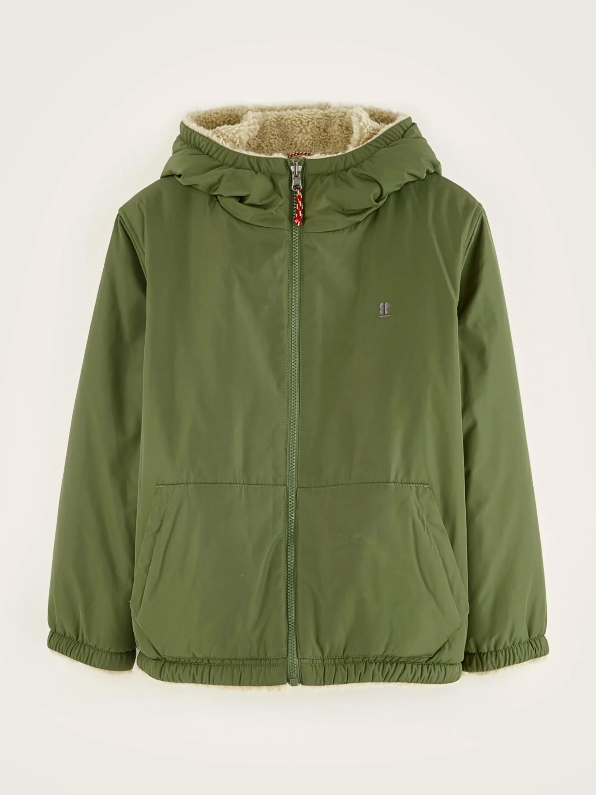 Klassieke, omkeerbare jas met capuchon, van waterafstotend groen ripstop textiel en teddystof.