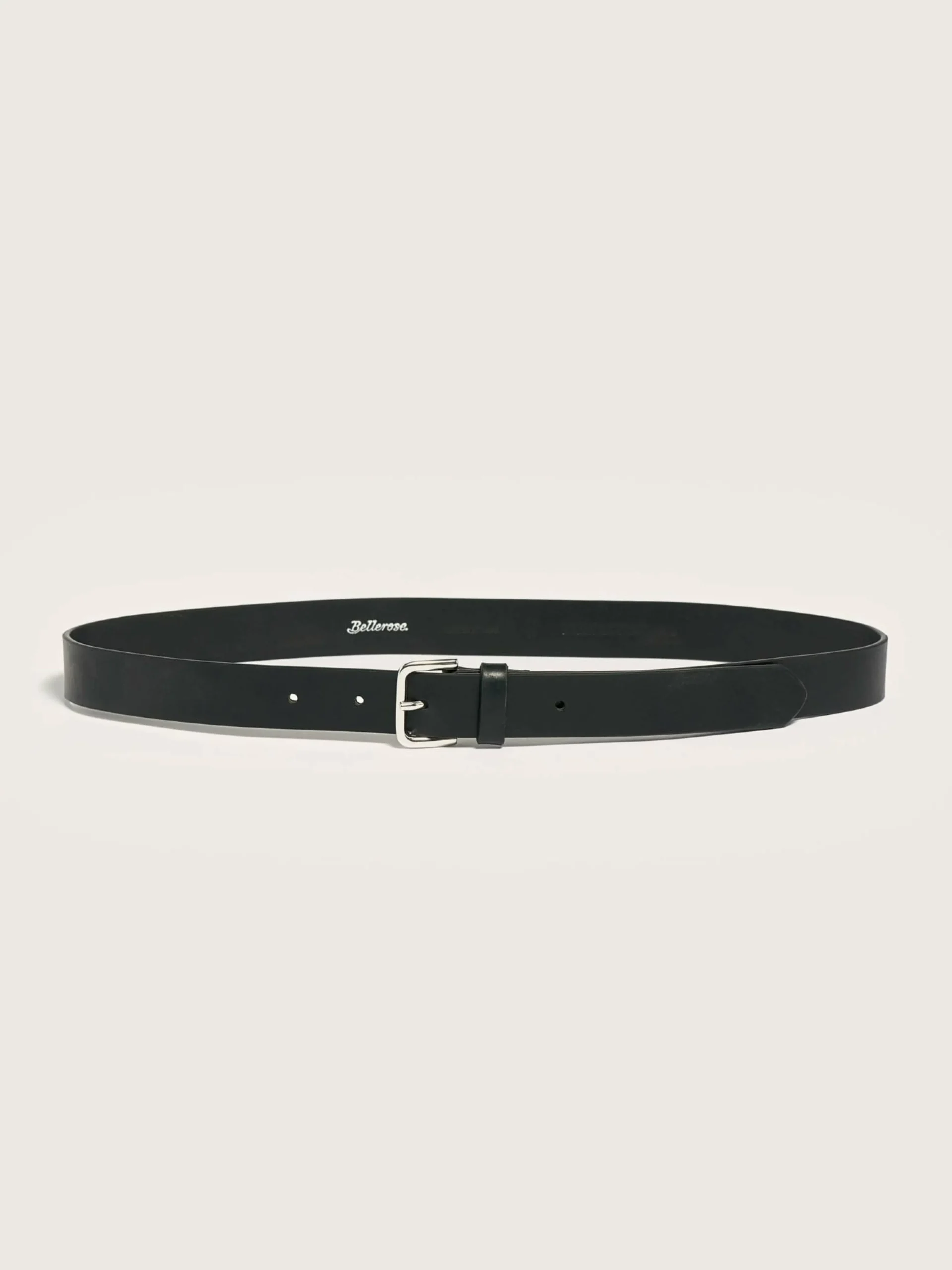 Klassieke riem van zwart leer met rechthoekige zilveren gesp en dubbele riemlussen.