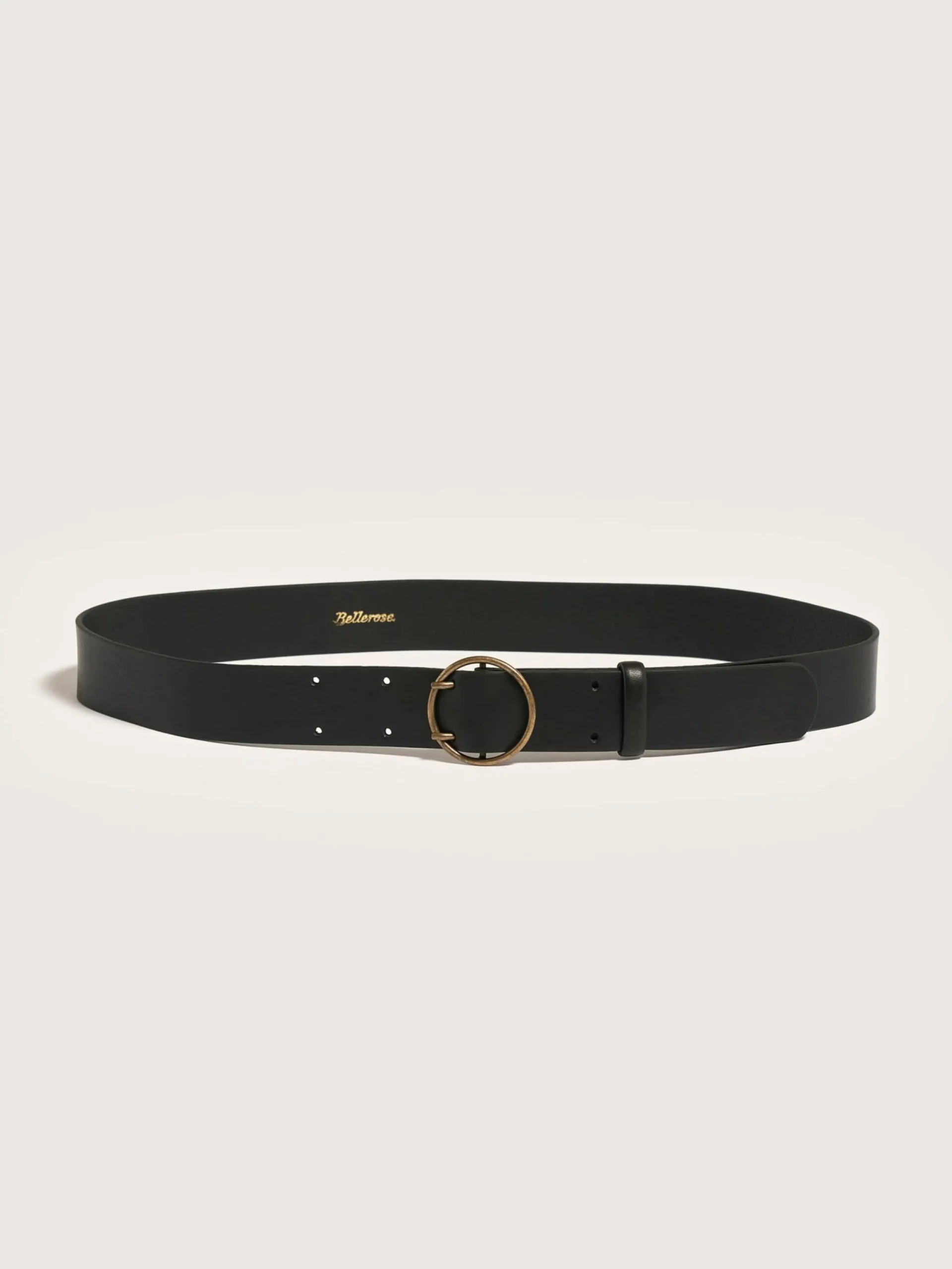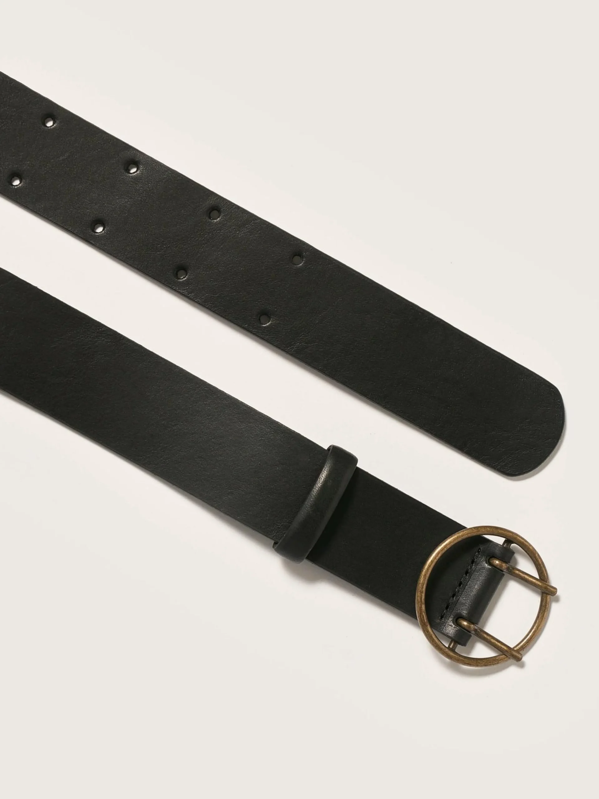Klassieke leren riem gemaakt van glad zwart leer die wordt vastgezet met een ronde gesp van verouderd messing.