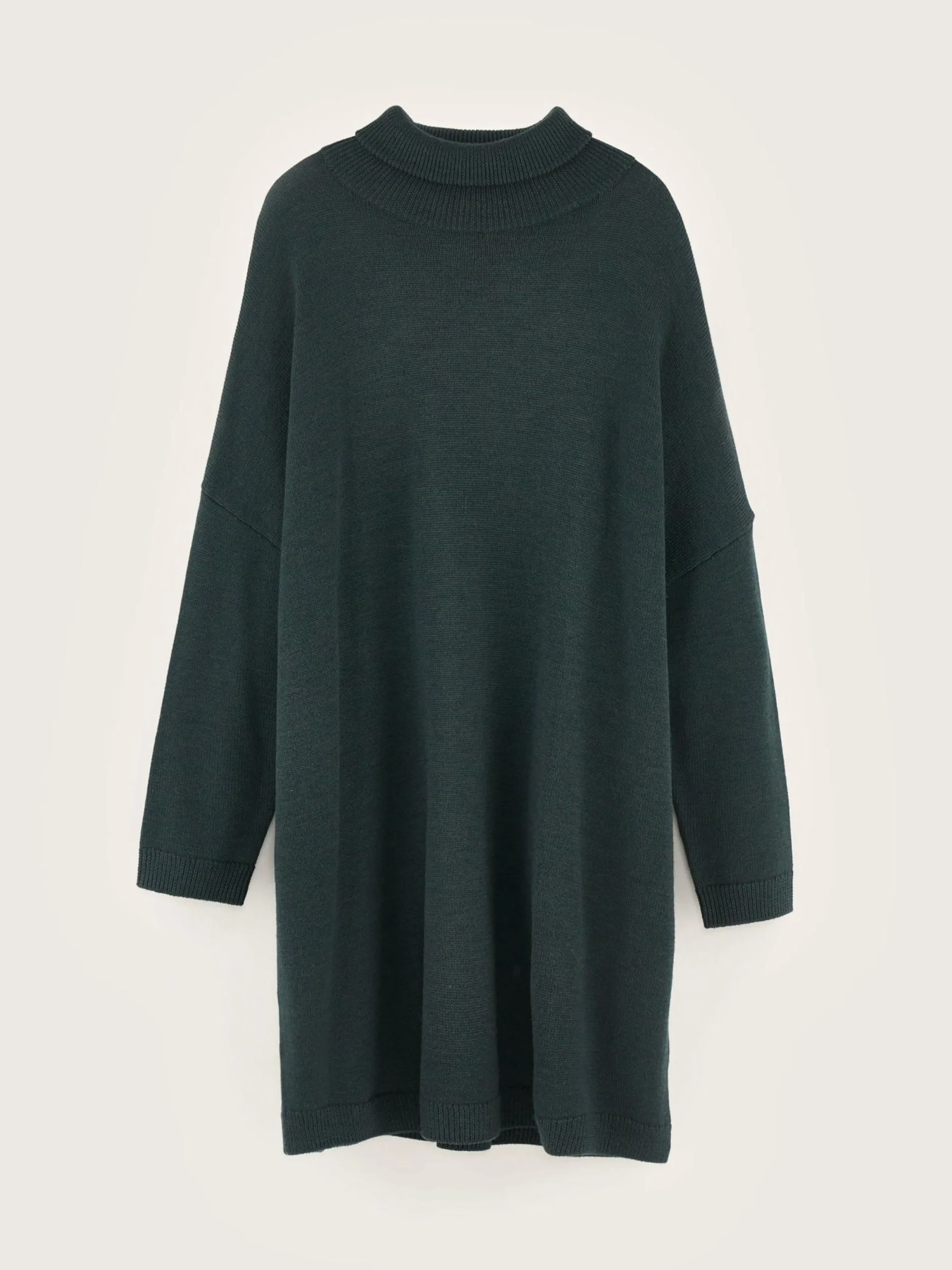Flesgroene, oversizede gebreide jurk van extra fijne merino, met een dubbelgebreide turtle neck.