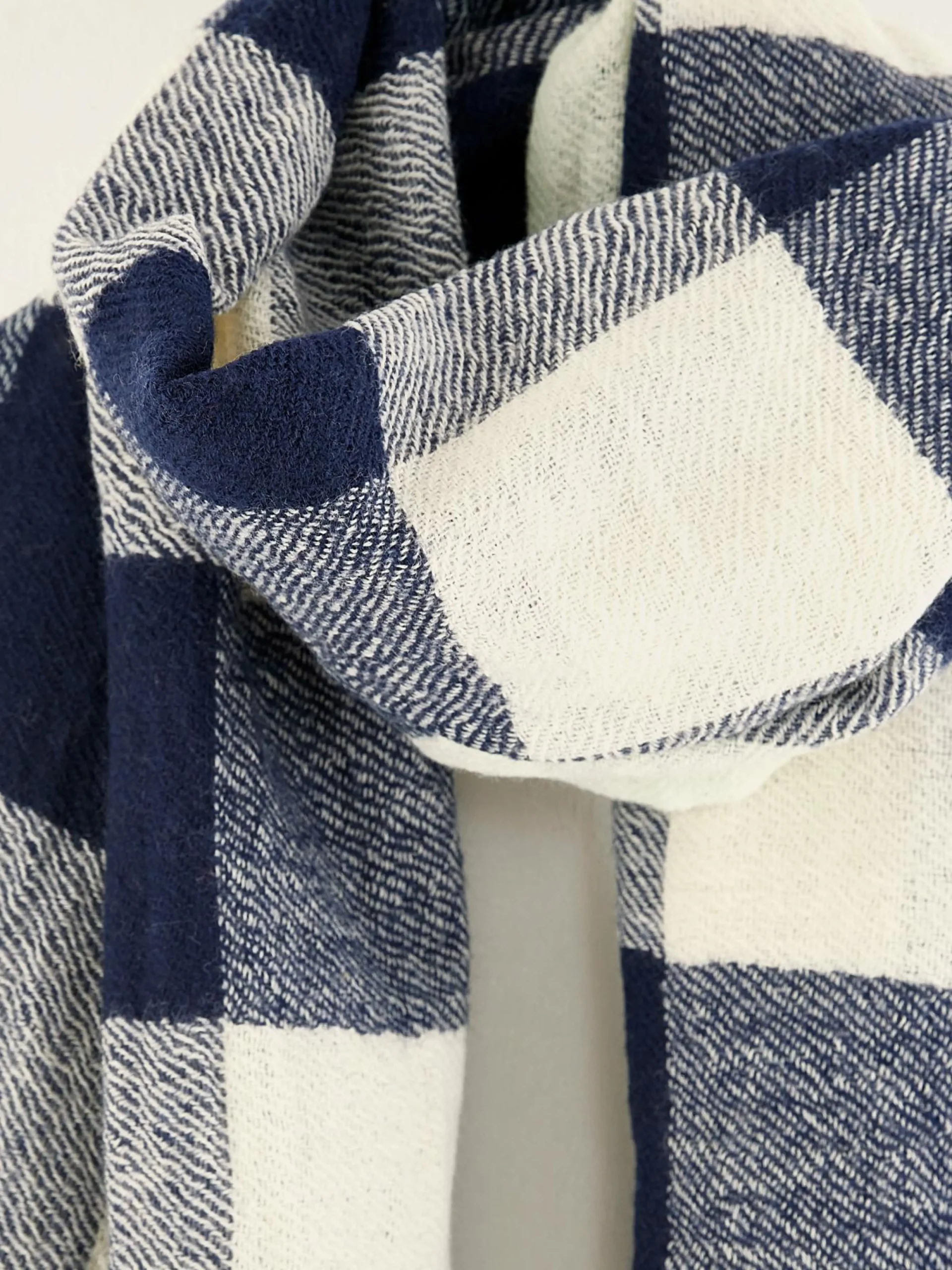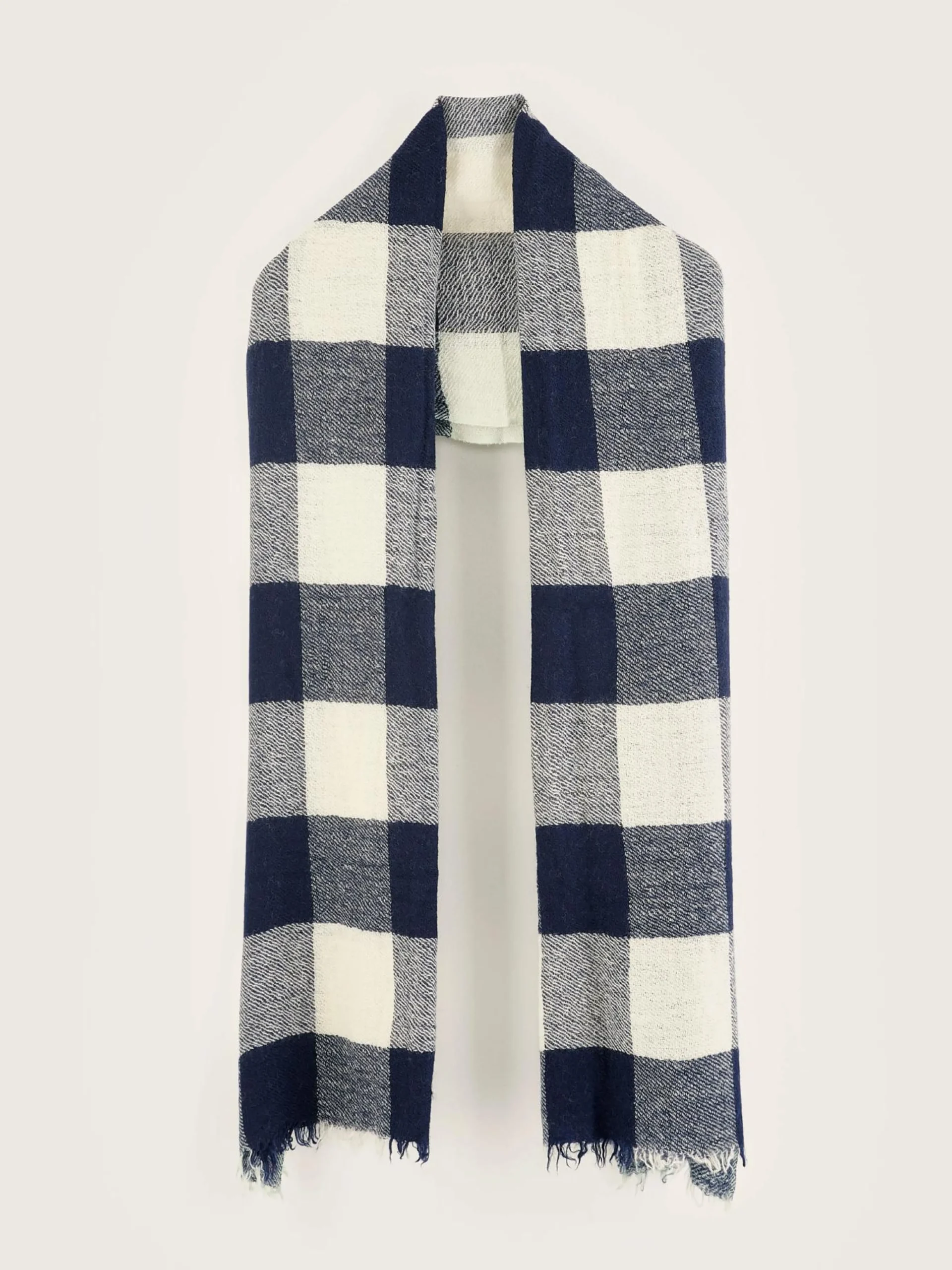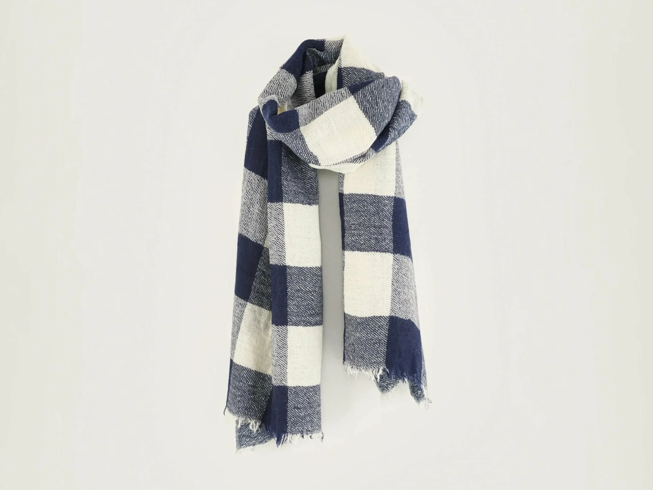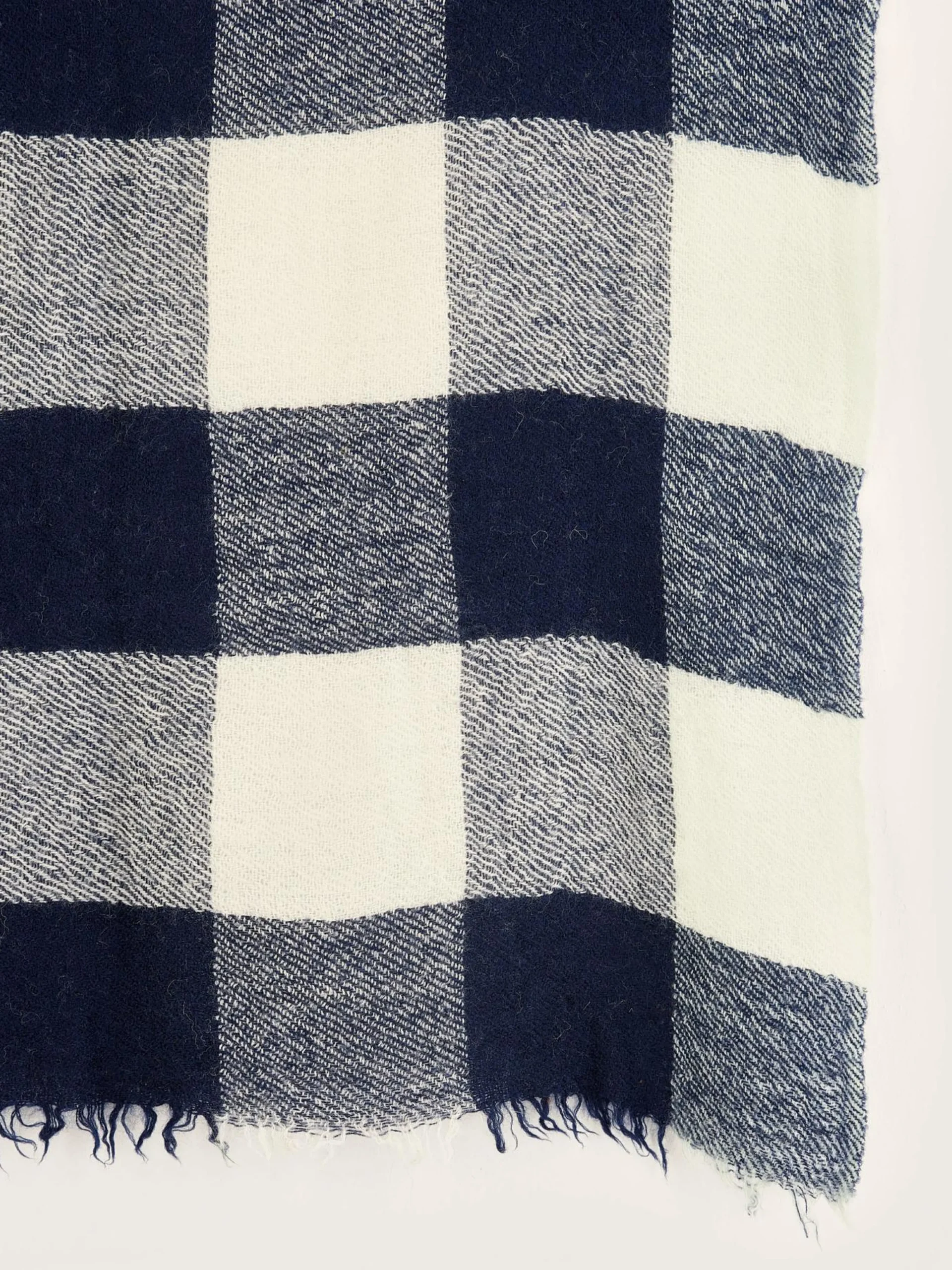 Klassiek geweven wollen sjaal met zwarte en witte ruiten, en franjes aan de randen.