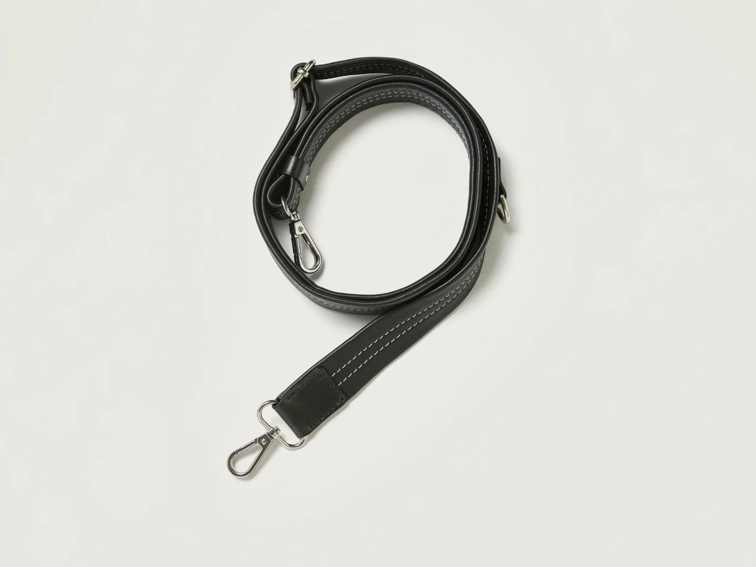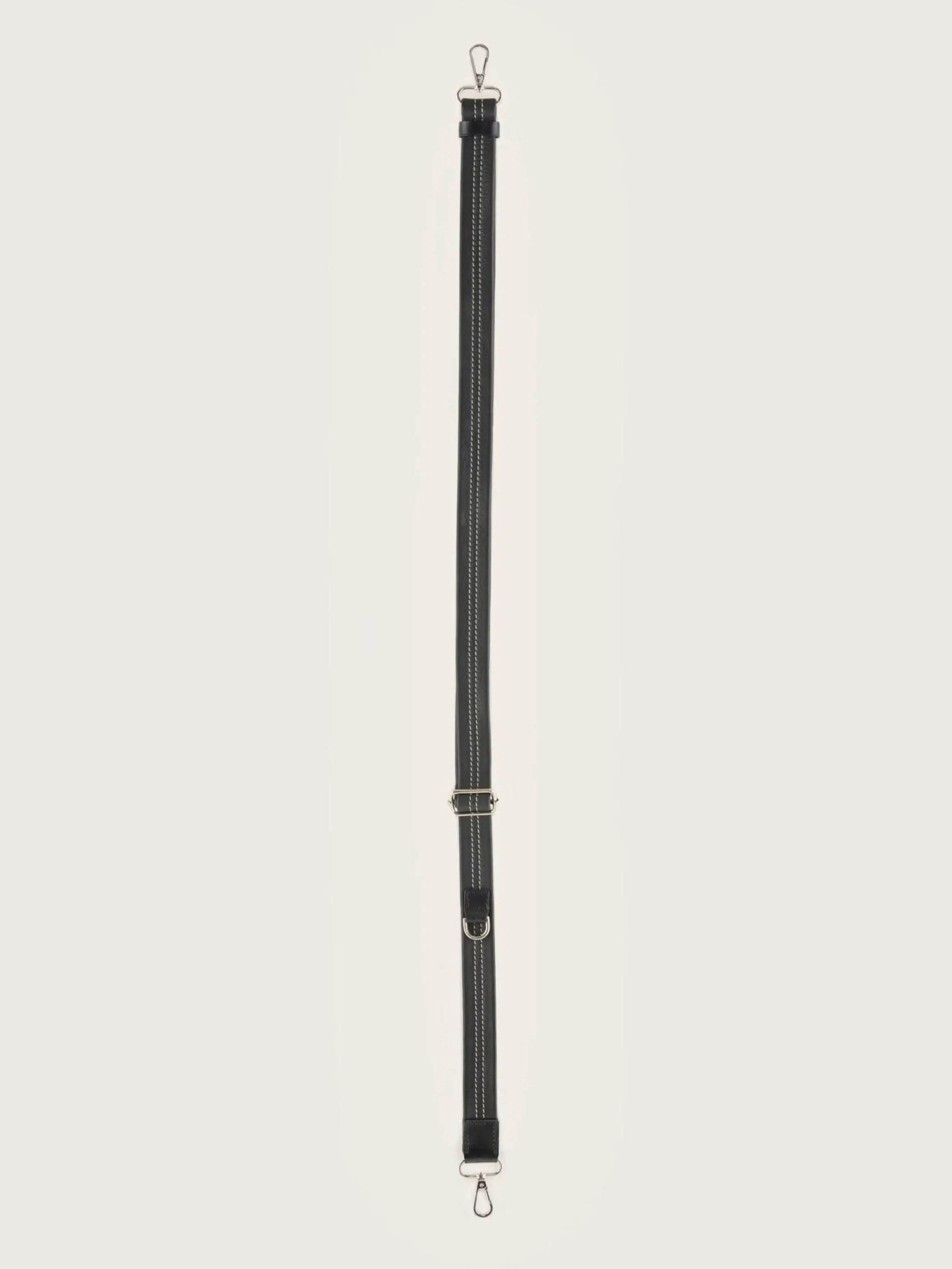 Verstelbare riem van zwart glad leer met zilverkleurige hardware.