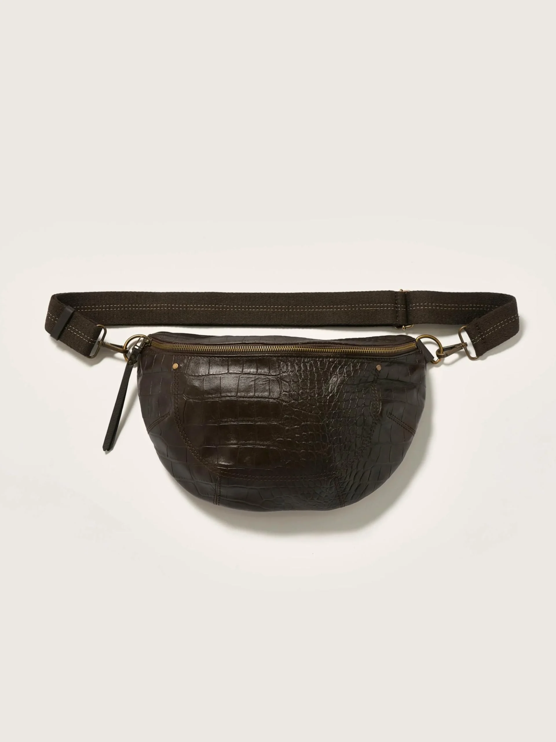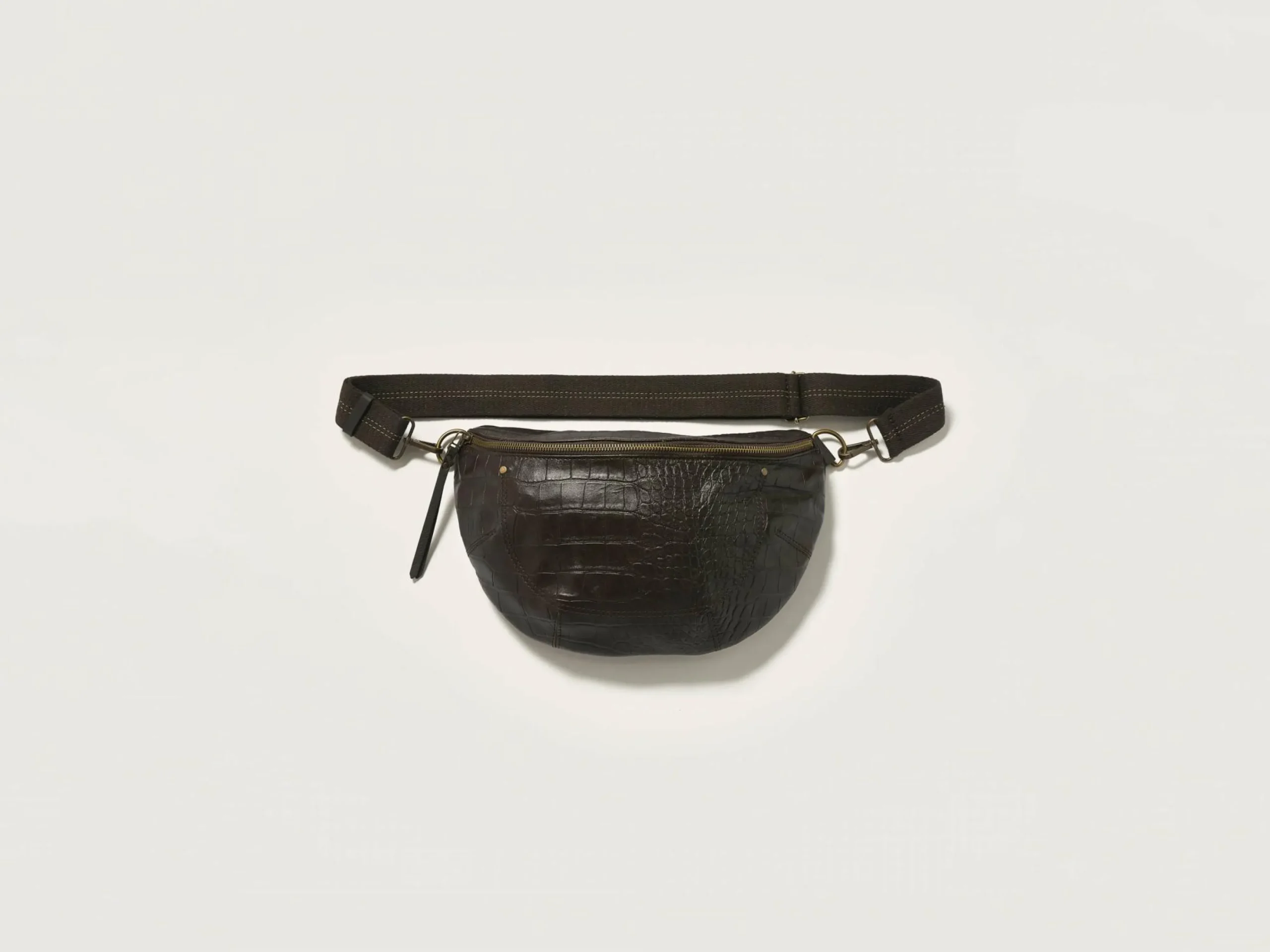 Soepele heuptas van donkerbruin gebosseerd leer met krokodil-look.