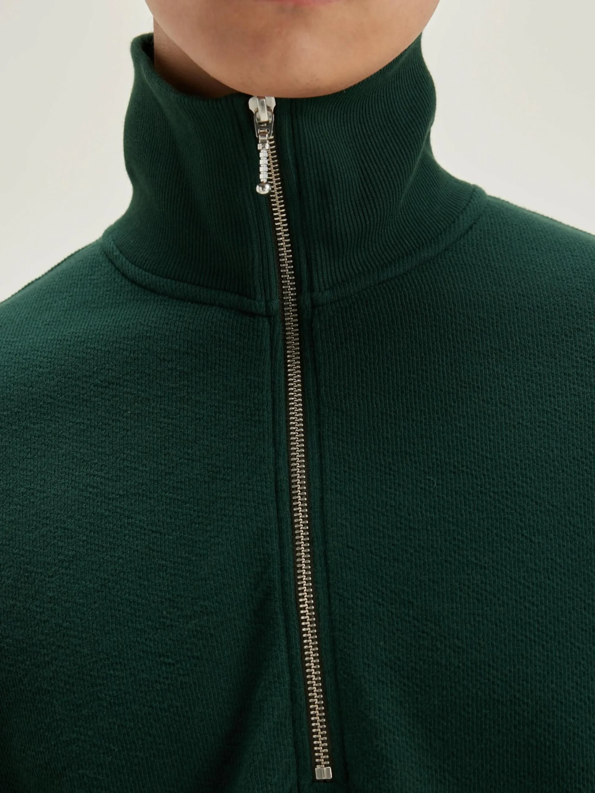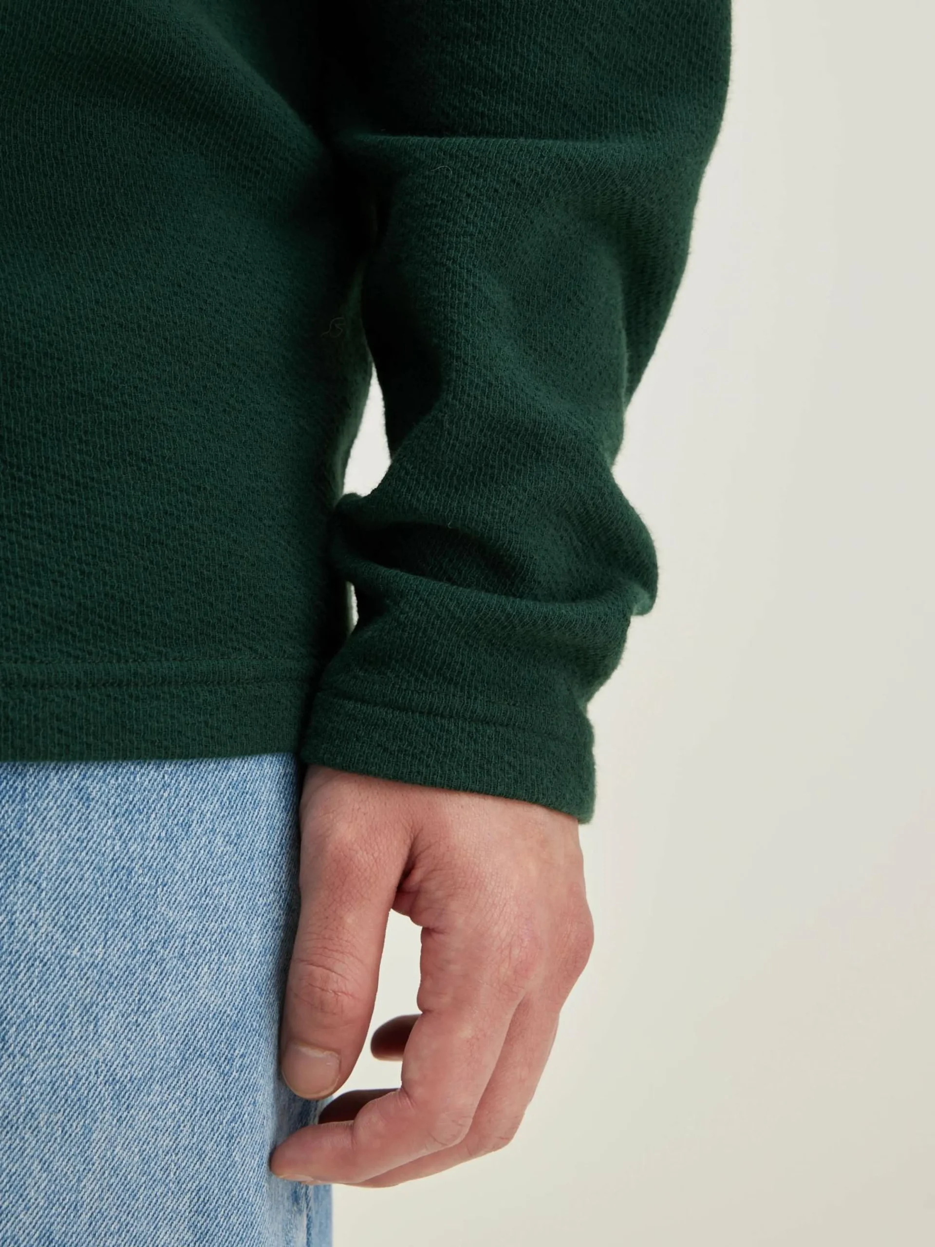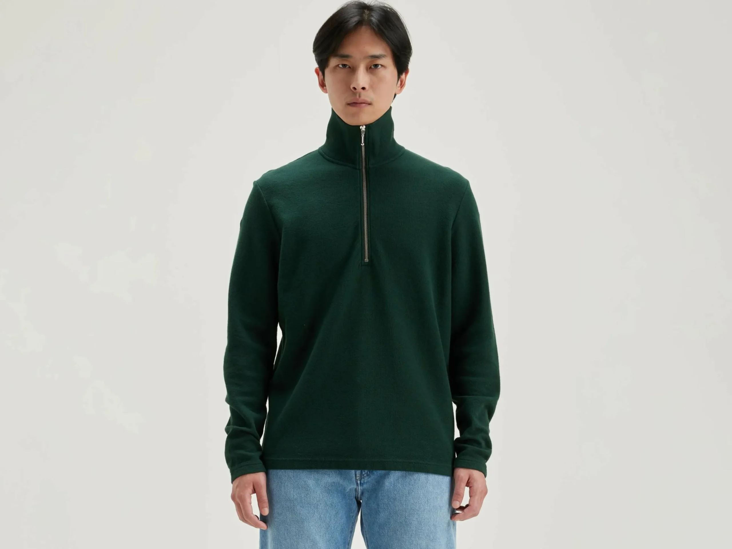 Klassiek groen T-shirt met lange mouwen en een hals met ritssluiting, van dubbelzijdige katoenjersey.