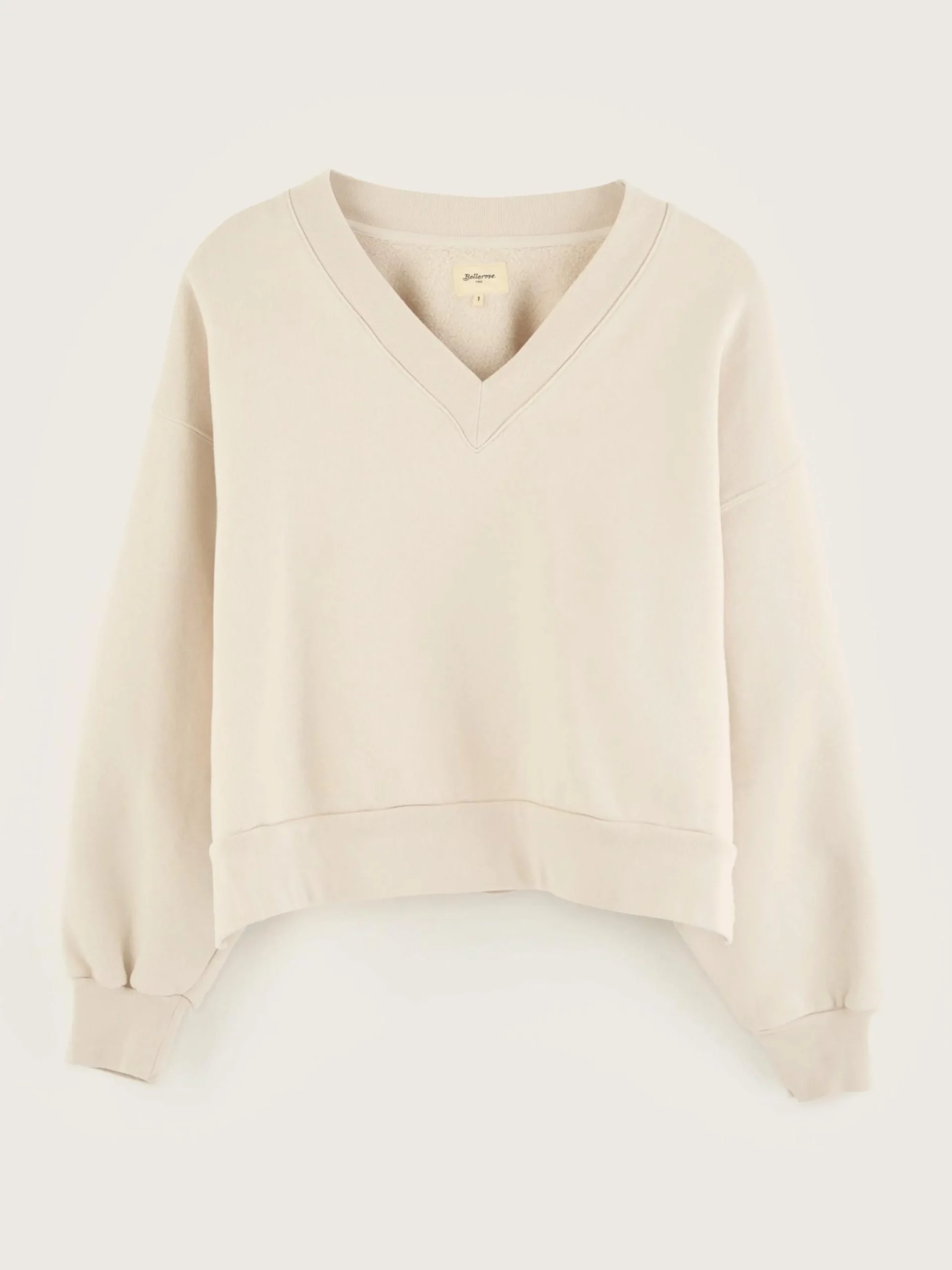 Ecru sweatshirt met V-hals, pofmouwen en zijsplitten.