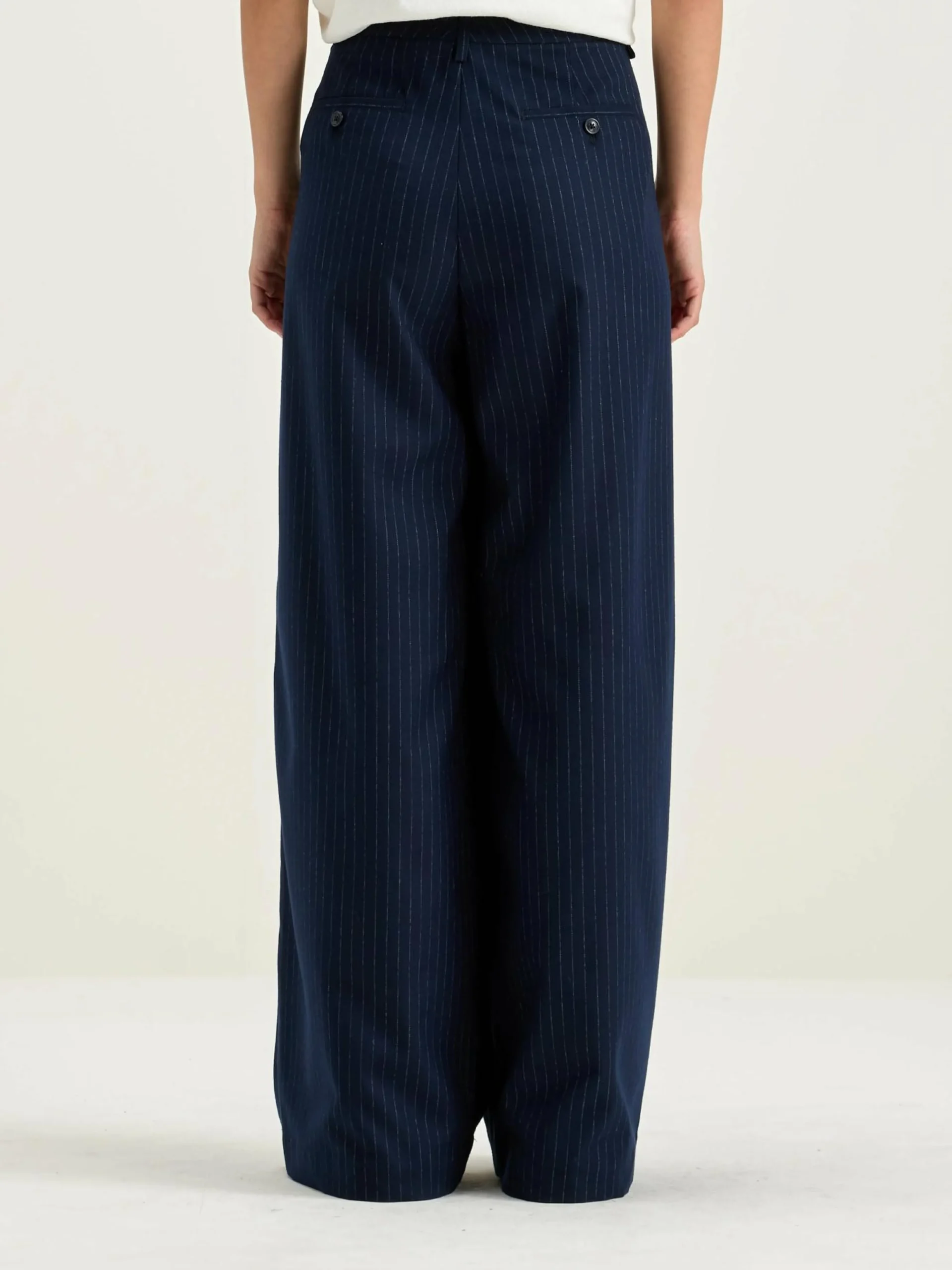Elegante high-waist broek met wijde pijpen en plooien vooraan, van klassieke krijtstreep-stof.