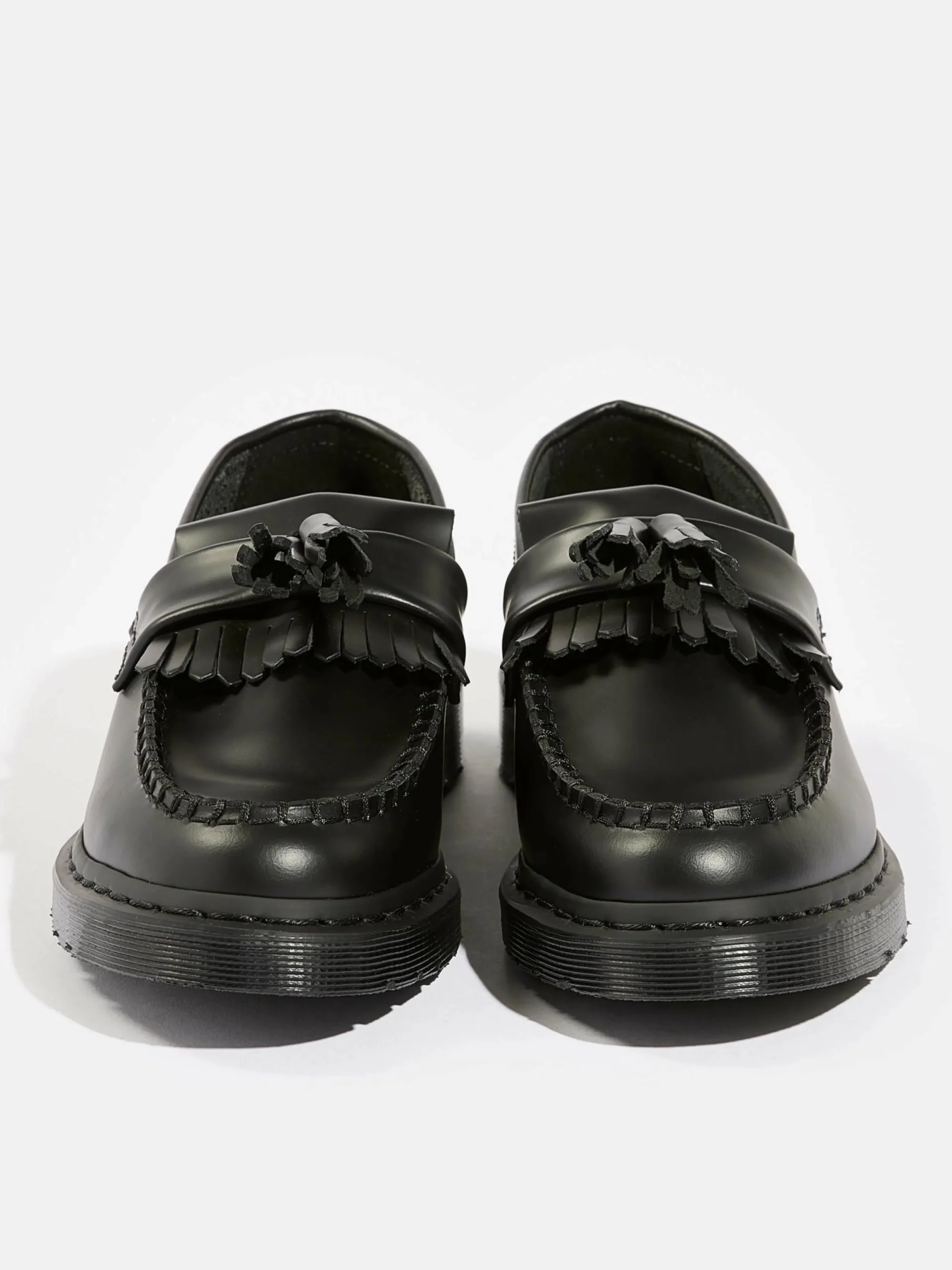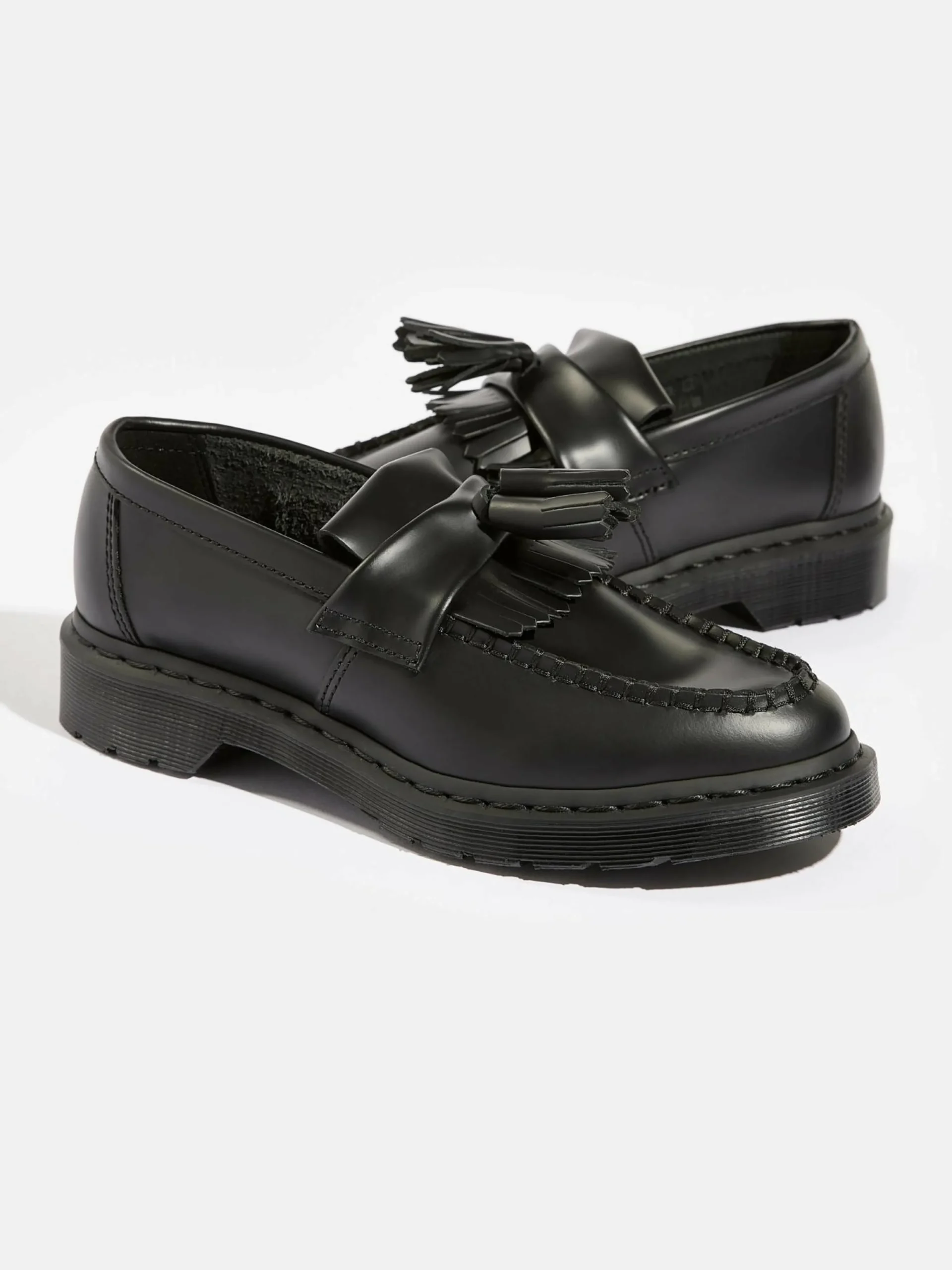 De klassieke Dr. Martens Adrian Tassel instappers zijn uitgevoerd in glad zwart leder en heeft een weltsteek en een AirWair dempende zool.
